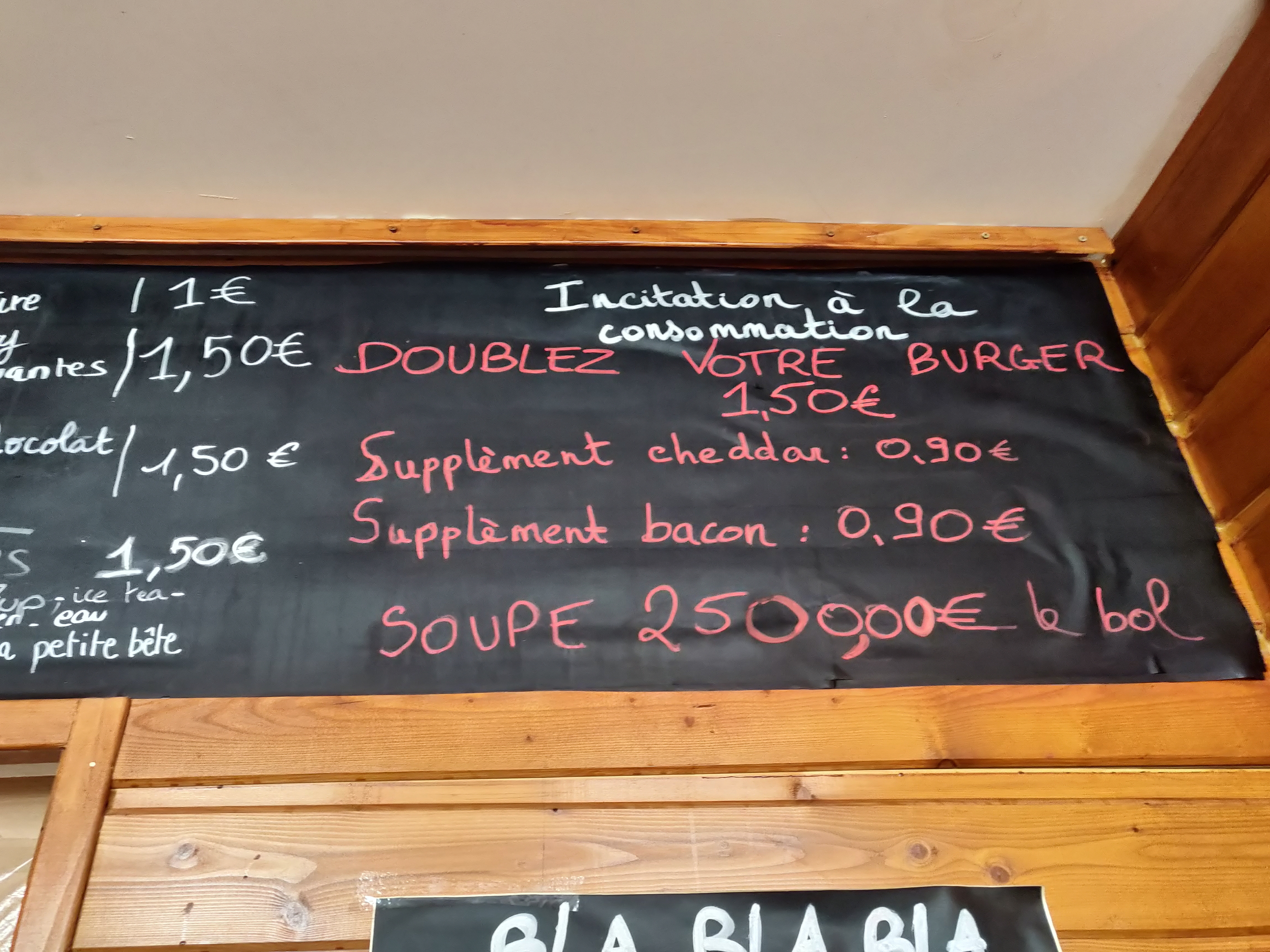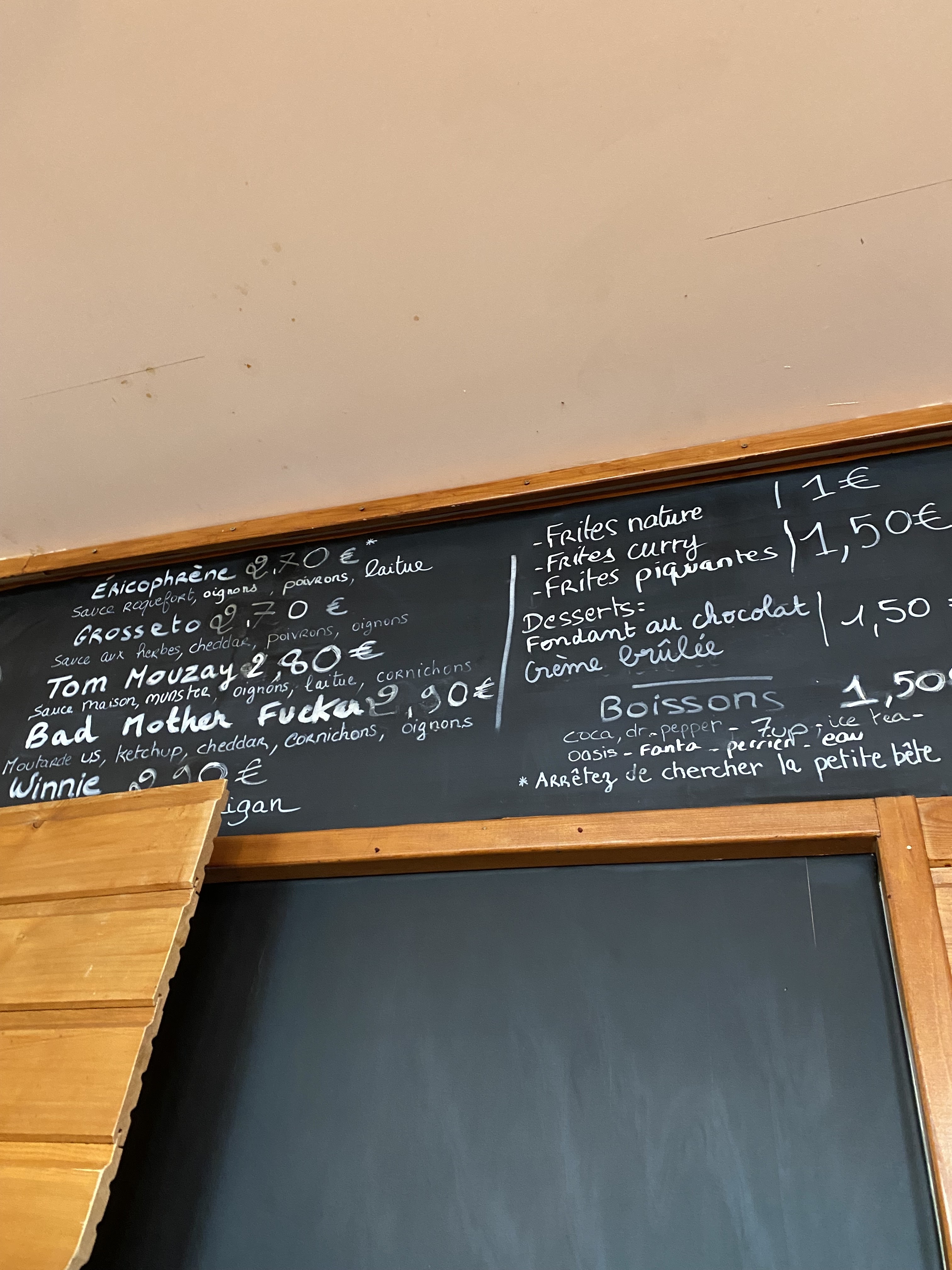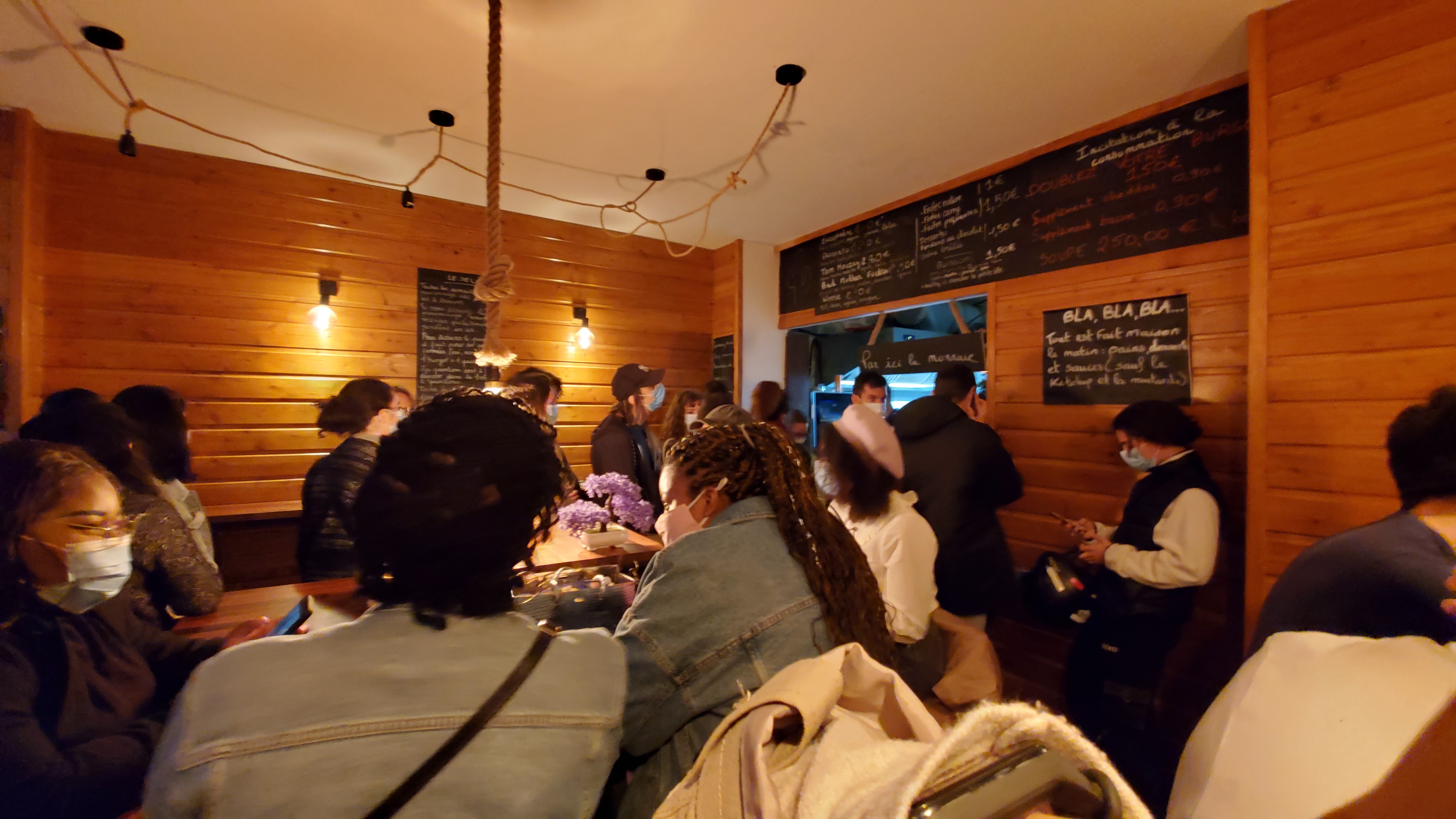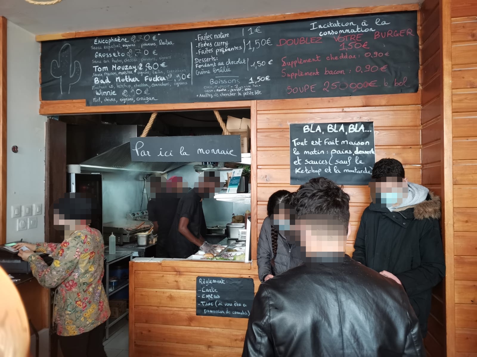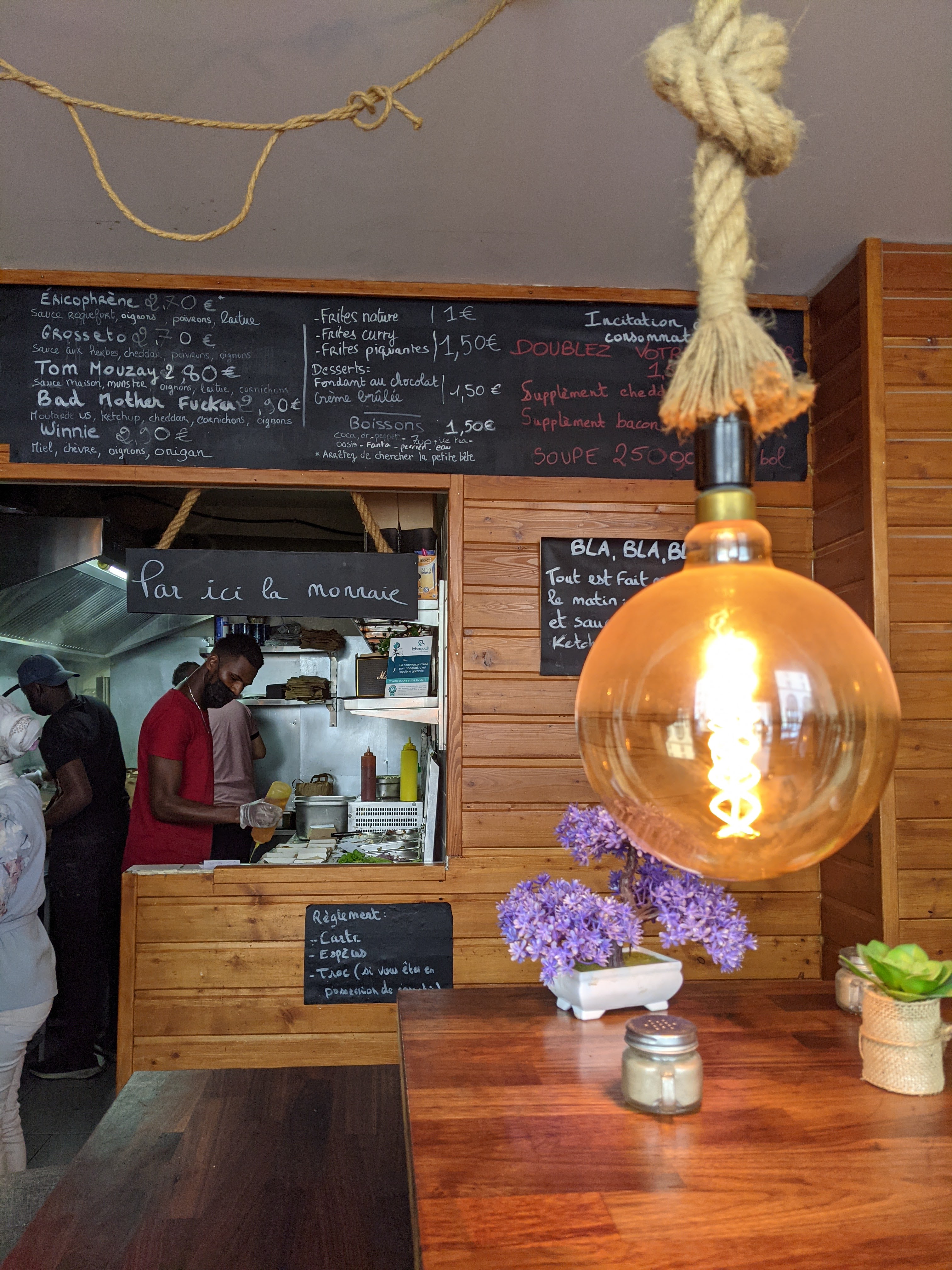 Petit conseil, venir à 19h maximum, car arriver à 19h30, c'est 2h en moyenne d'attente. Mais c'est trop bon ! On a adoré le burger, moins les frites, le dessert aussi très bon. Lieu où tout est fait maison sauf la moutarde et le ketchup, à des prix dérisoires, 2,70€ à 2,90€ le burger, 1€ les frites, 1,50€ le dessert ou la boisson. À l'intérieur des petits mots plein d'humour et personnel très agréable.