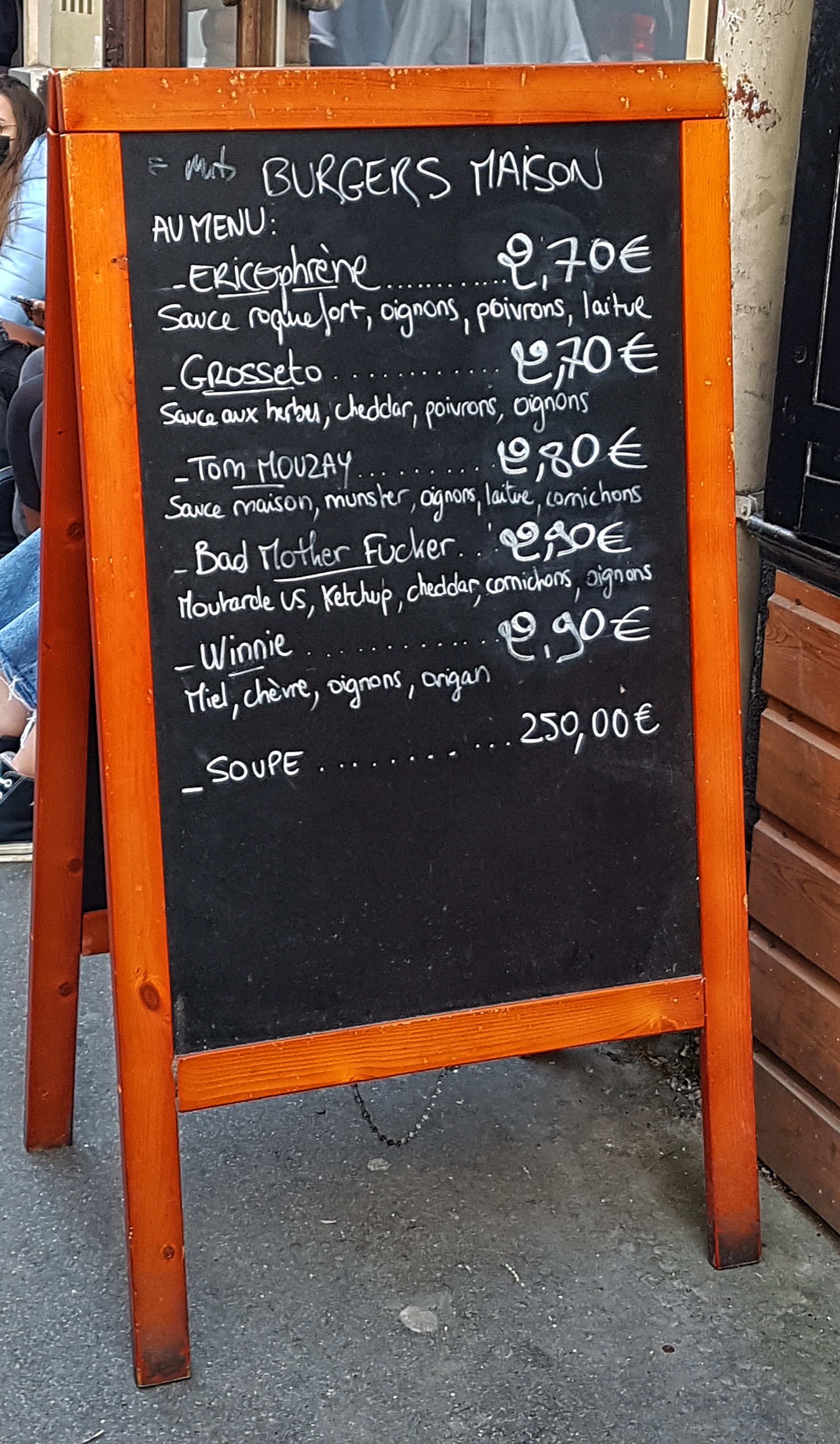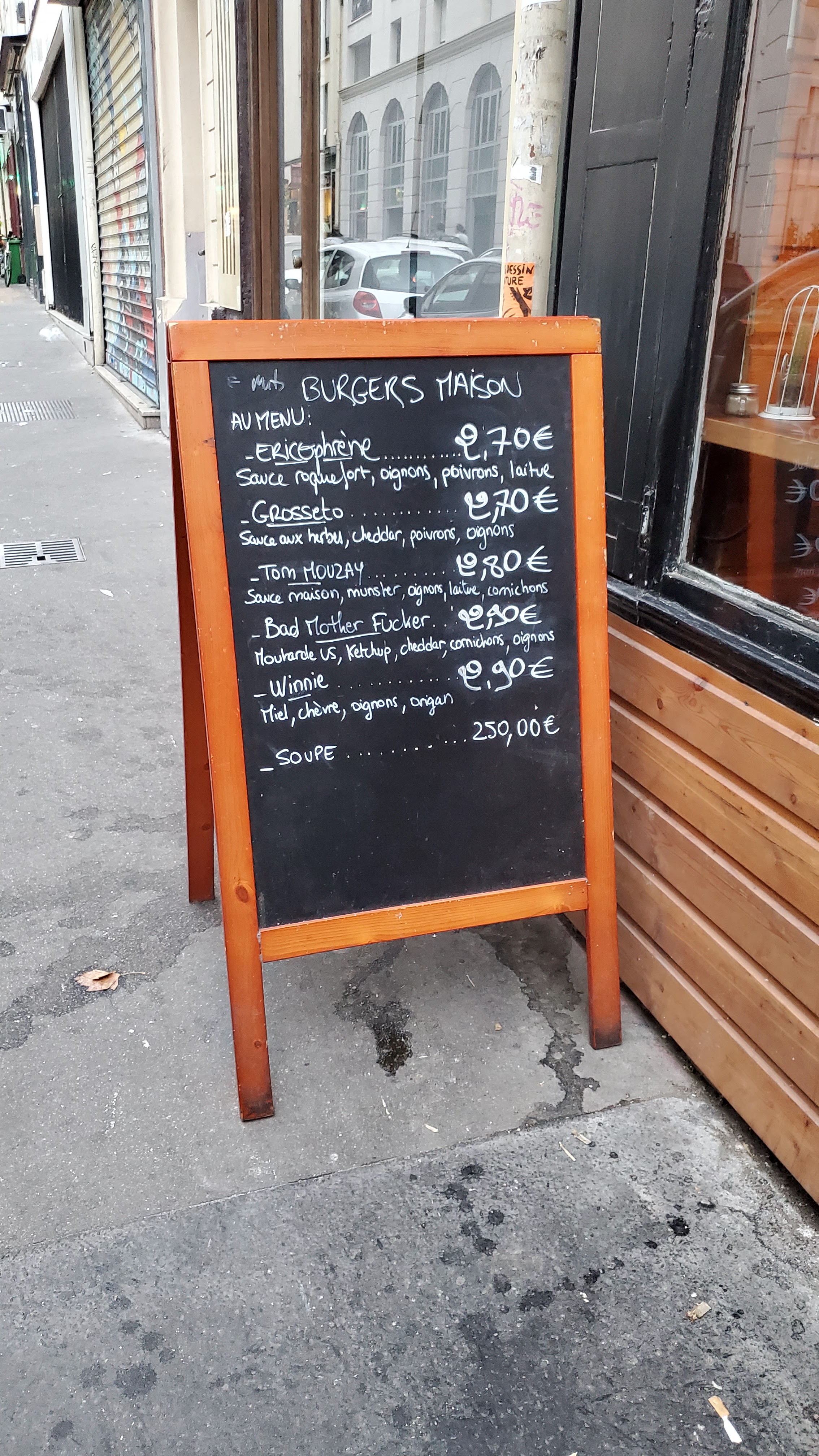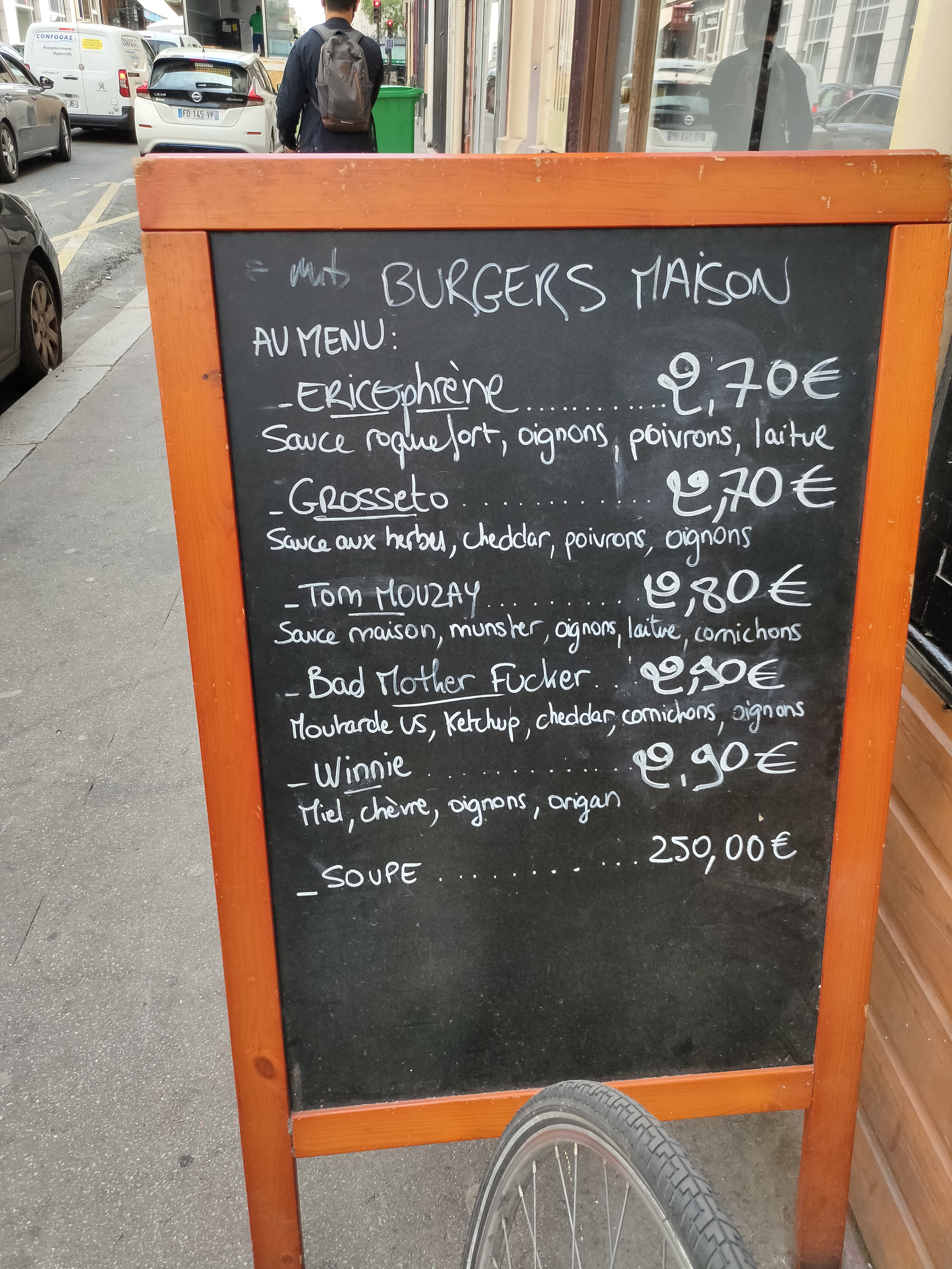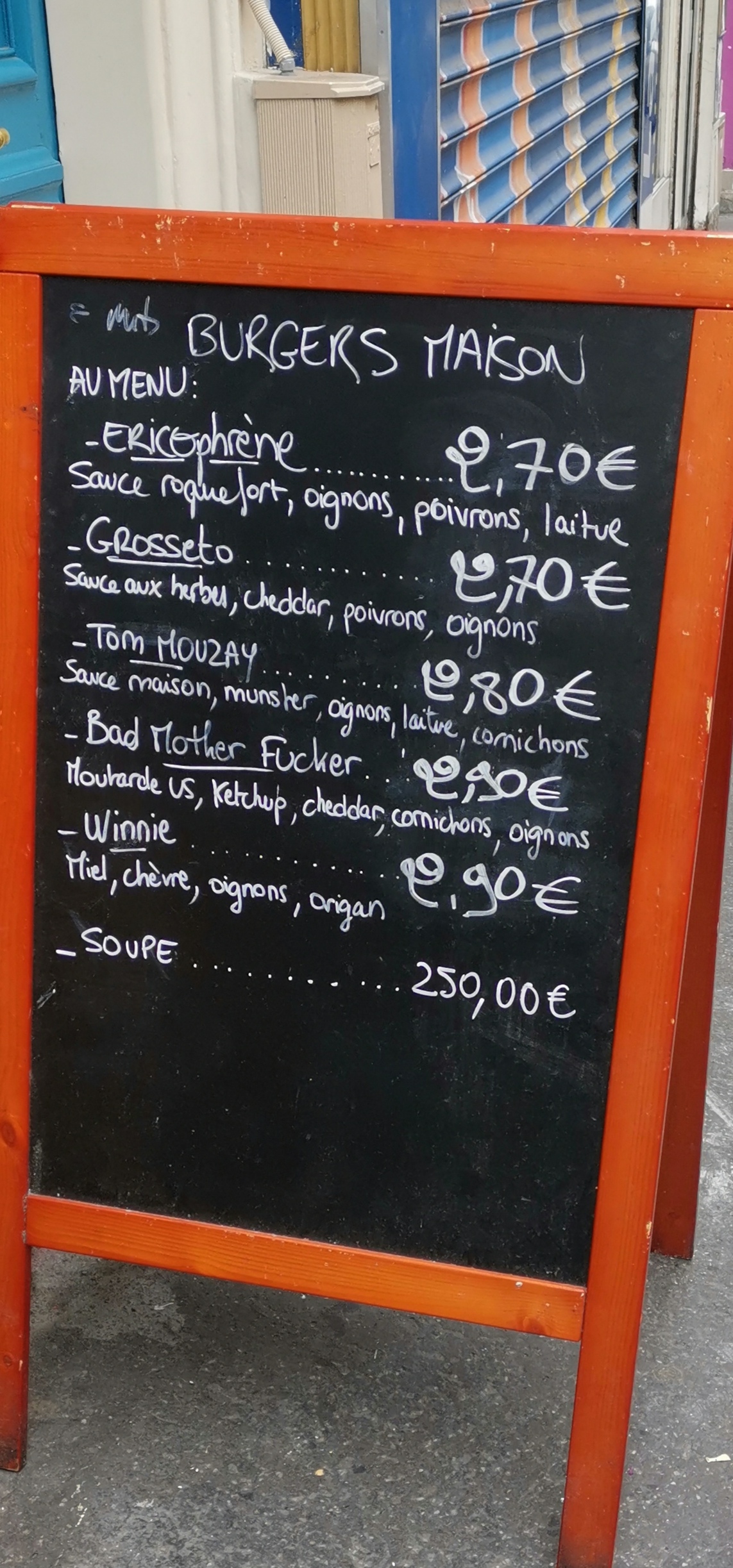 Dans l’ensemble c’est plutôt bon et pas cher. J’ai pris 4 hamburgers sur 5 ( sauf chèvre miel), le Bad M… n’est pas terrible car pas de saveur.