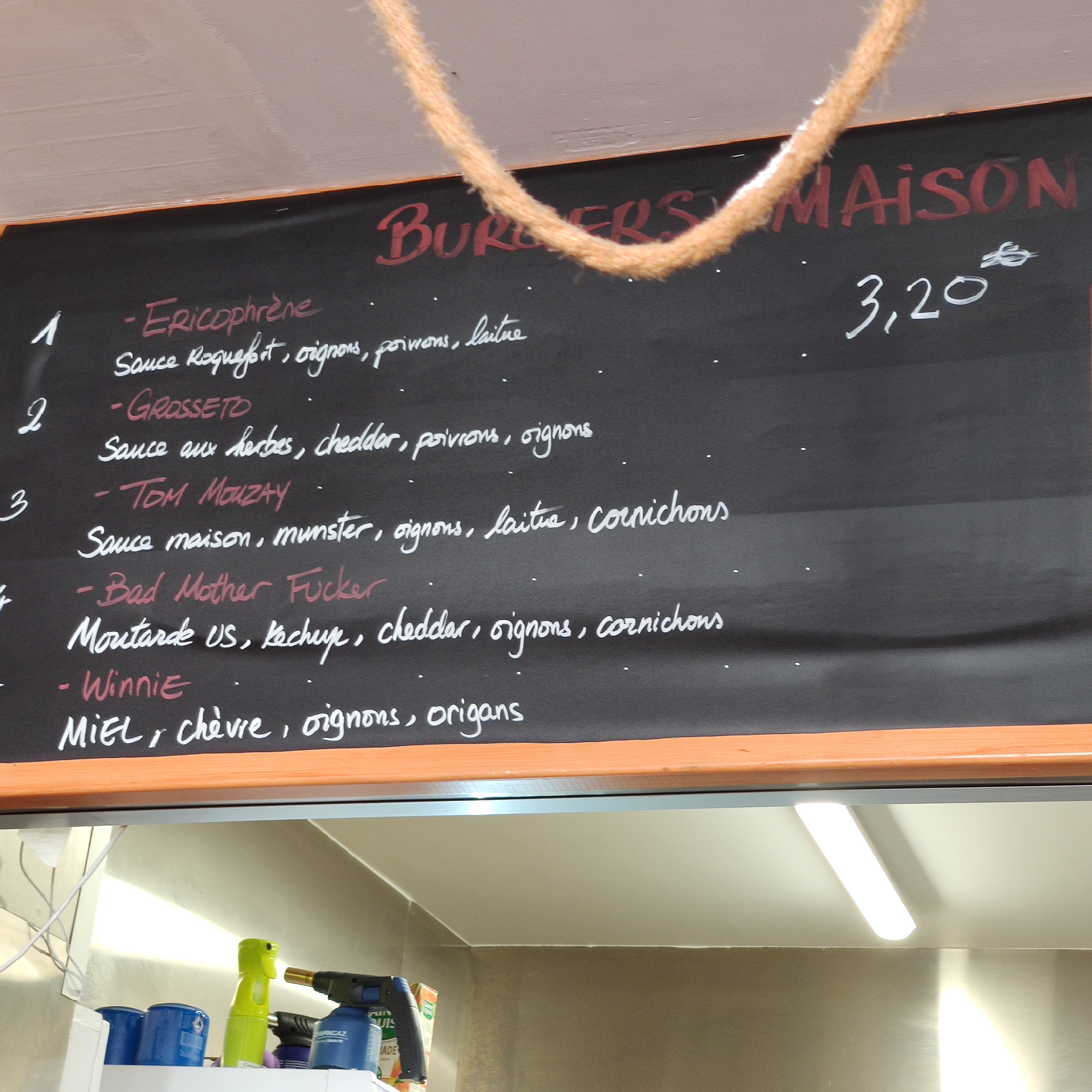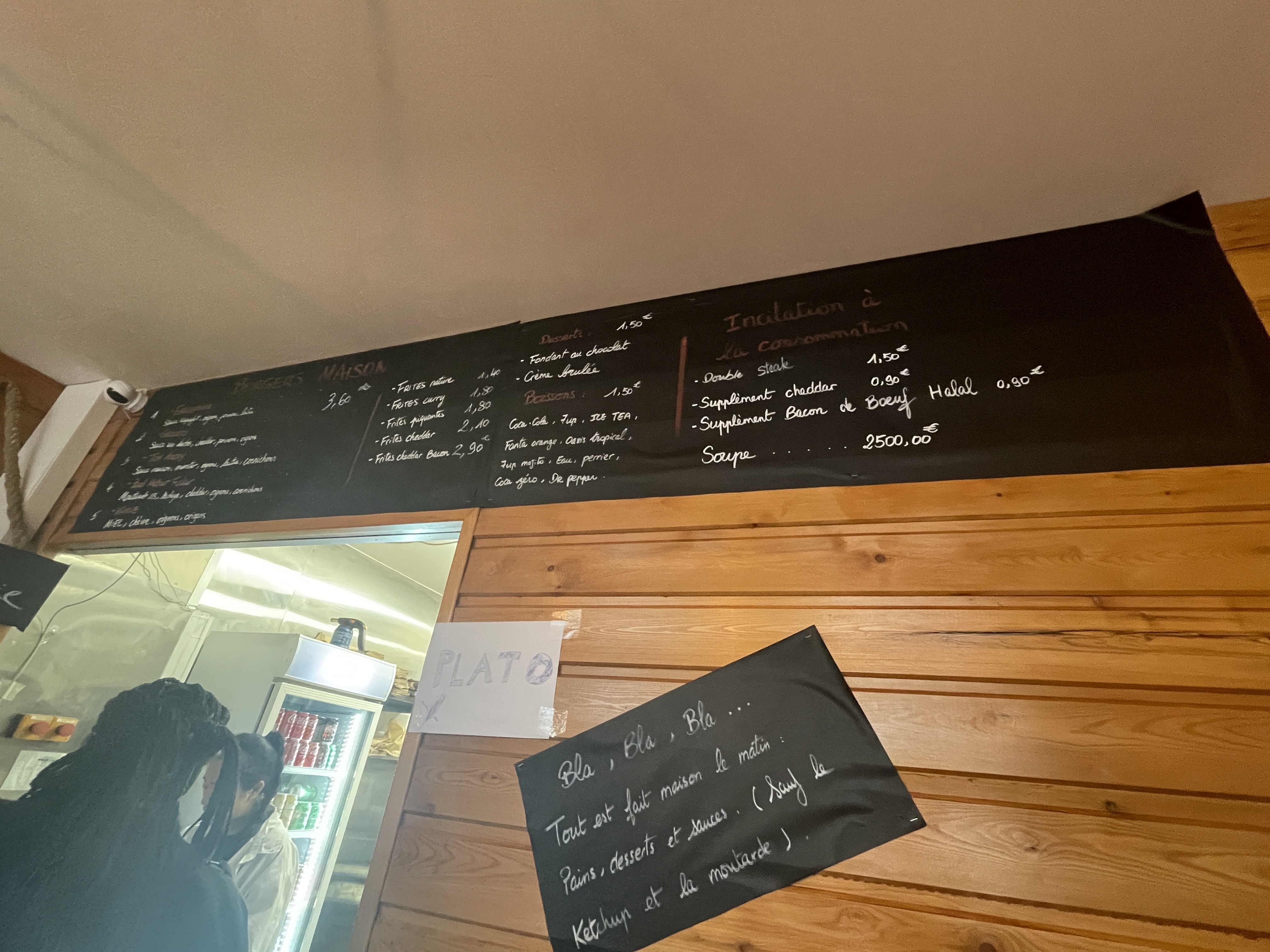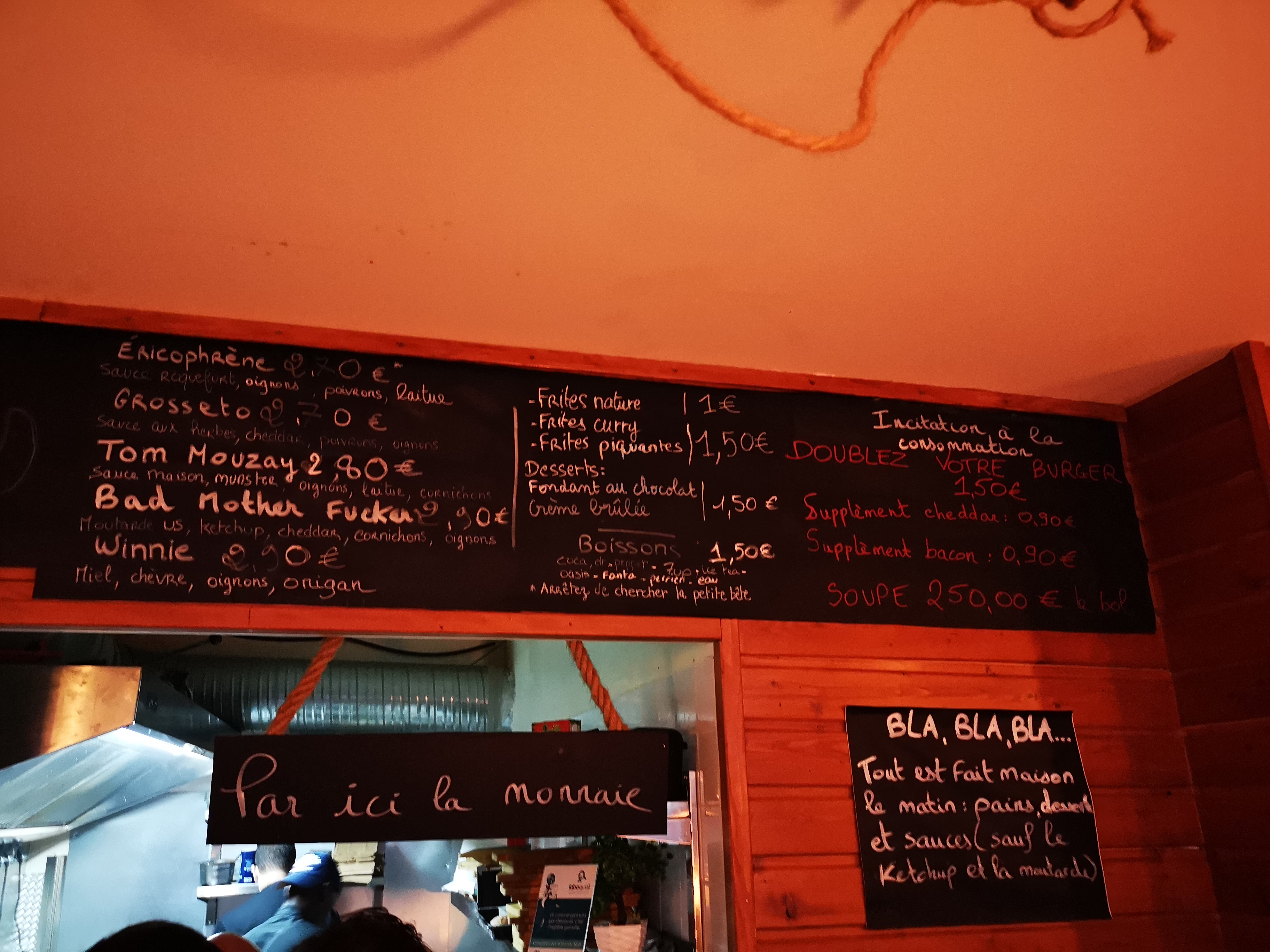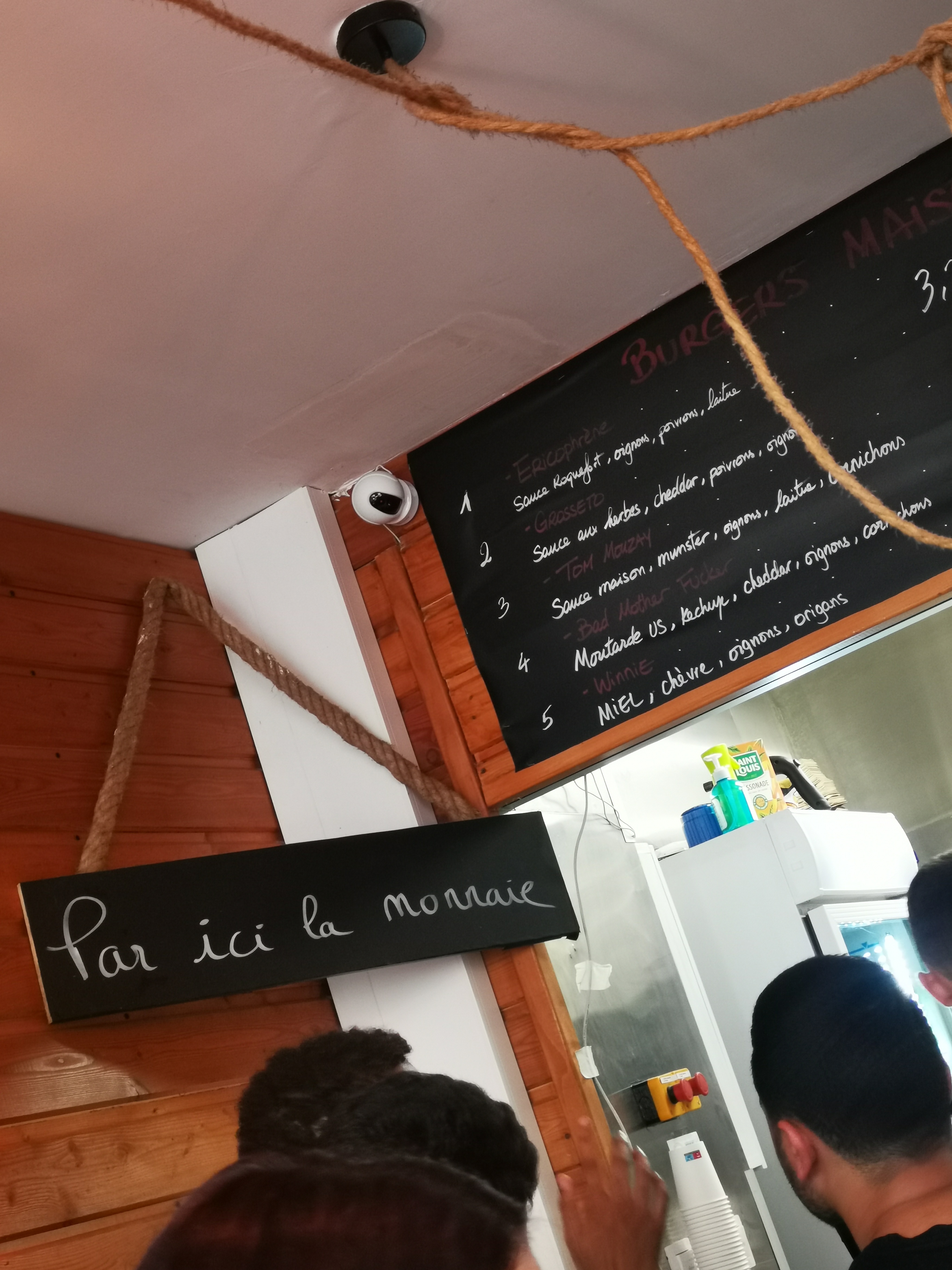 Les burgers sont bons, de bonne taille et bien juteux.. 3,20 le burger et si vous souhaitez un supplément c'est 80 centime pour du bacon que demander de plus ..on mange et on se casse.. malgré le slogan vous vous avez la possibilité de manger sur place il y a une vingtaine de places au maximum il faut savoir que le lieu est ouvert le matin et en soirée de 19h à 22h. Une portion de frites coûte 1 € 20.. Dans ce mini restaurant vous avez la possibilité de voir des messages écrits assez amusant.. par exemple vous avez une liste de personnes qui peuvent avoir des burgers à vie.. sur cette liste il y a des noms d'acteurs ou toute personne qui a joué dans la série Columbo ..