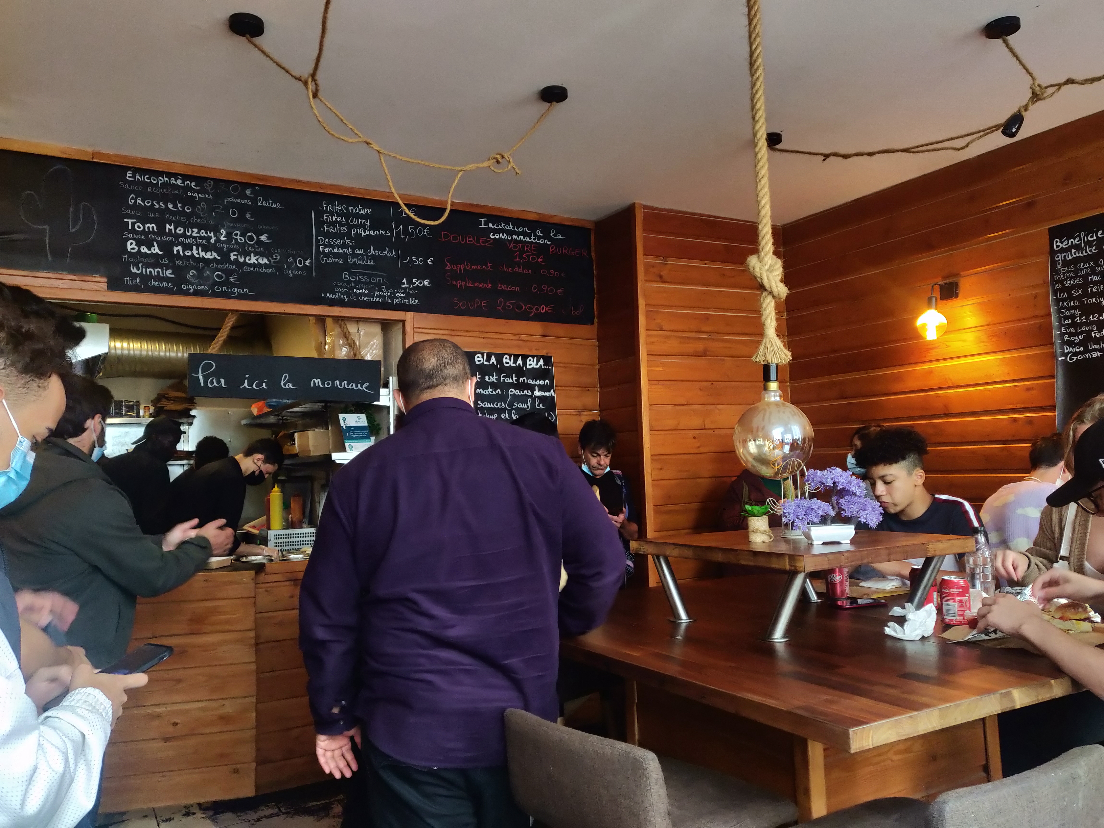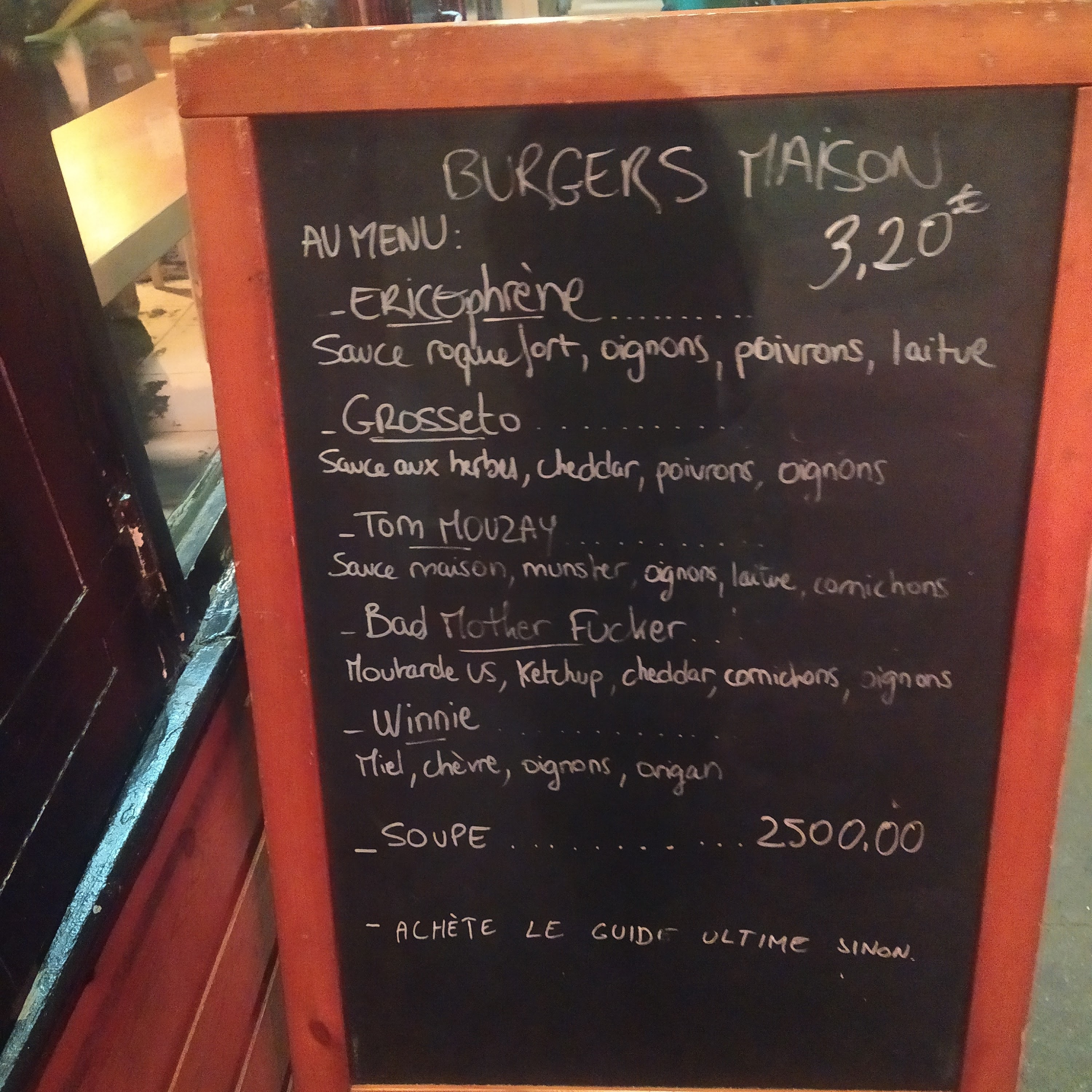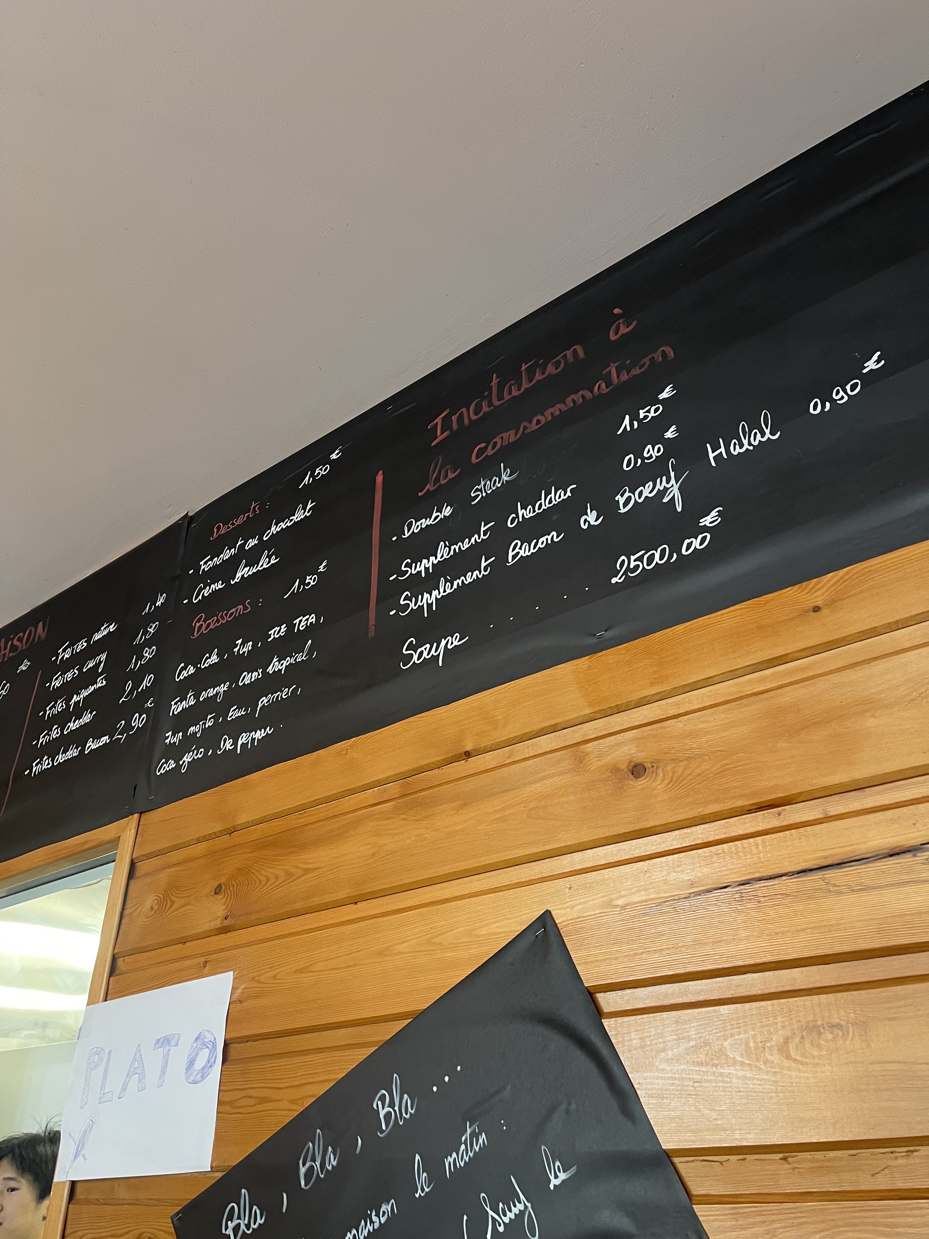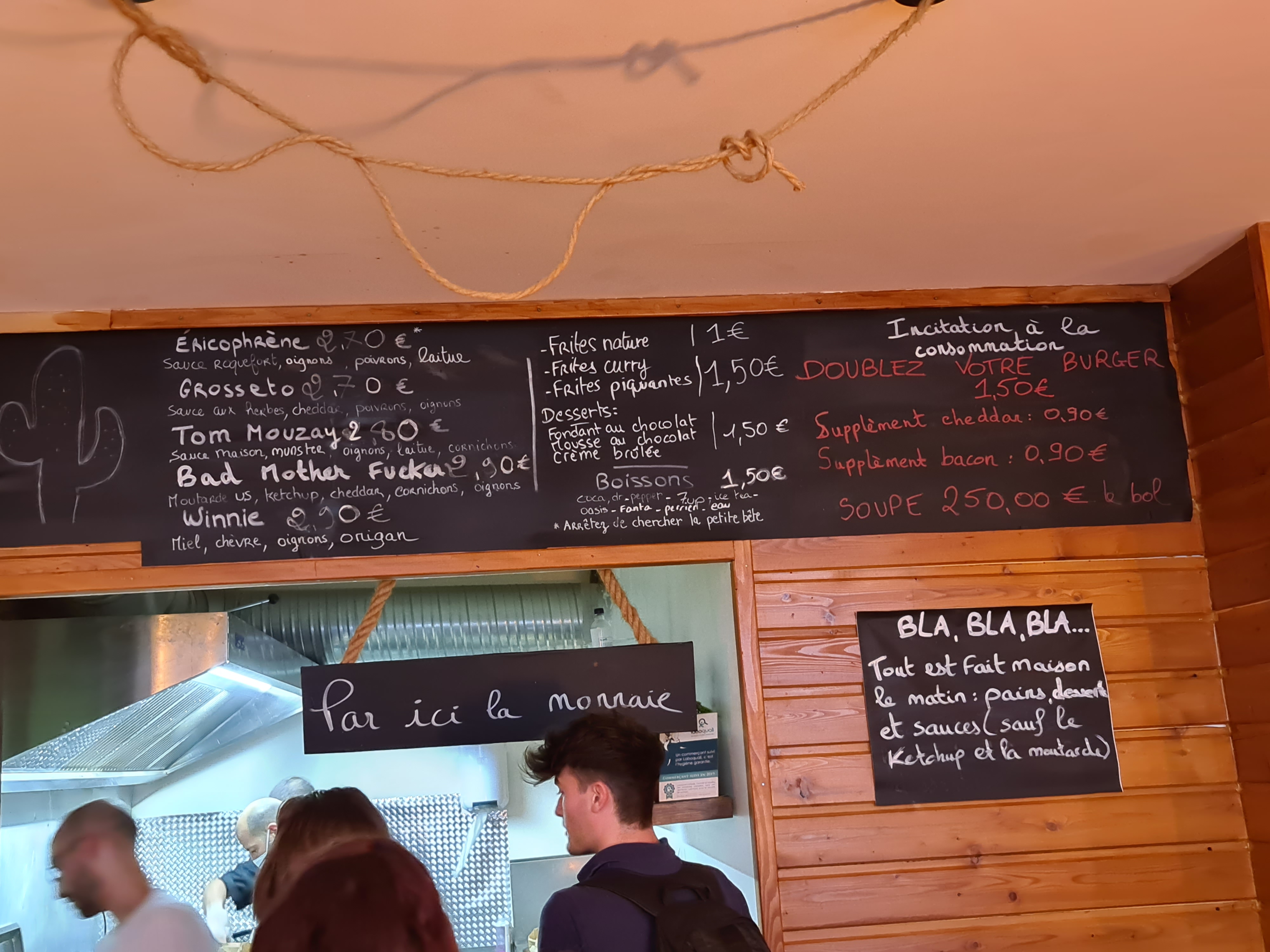 Les burgers sont bons, de bonne taille et bien juteux.. 3,20 le burger et si vous souhaitez un supplément c'est 80 centime pour du bacon que demander de plus ..on mange et on se casse.. malgré le slogan vous vous avez la possibilité de manger sur place il y a une vingtaine de places au maximum il faut savoir que le lieu est ouvert le matin et en soirée de 19h à 22h. Une portion de frites coûte 1 € 20.. Dans ce mini restaurant vous avez la possibilité de voir des messages écrits assez amusant.. par exemple vous avez une liste de personnes qui peuvent avoir des burgers à vie.. sur cette liste il y a des noms d'acteurs ou toute personne qui a joué dans la série Columbo ..