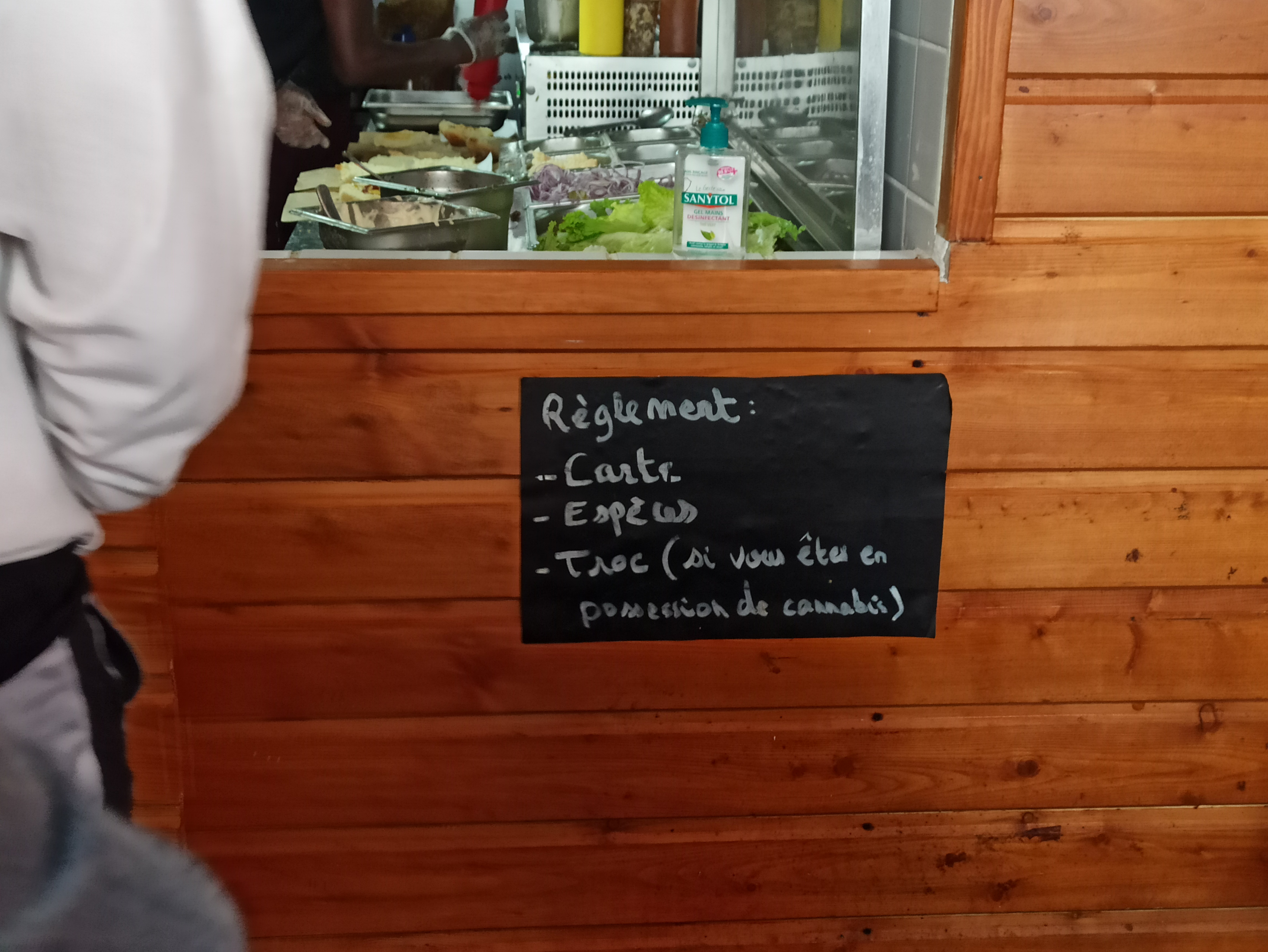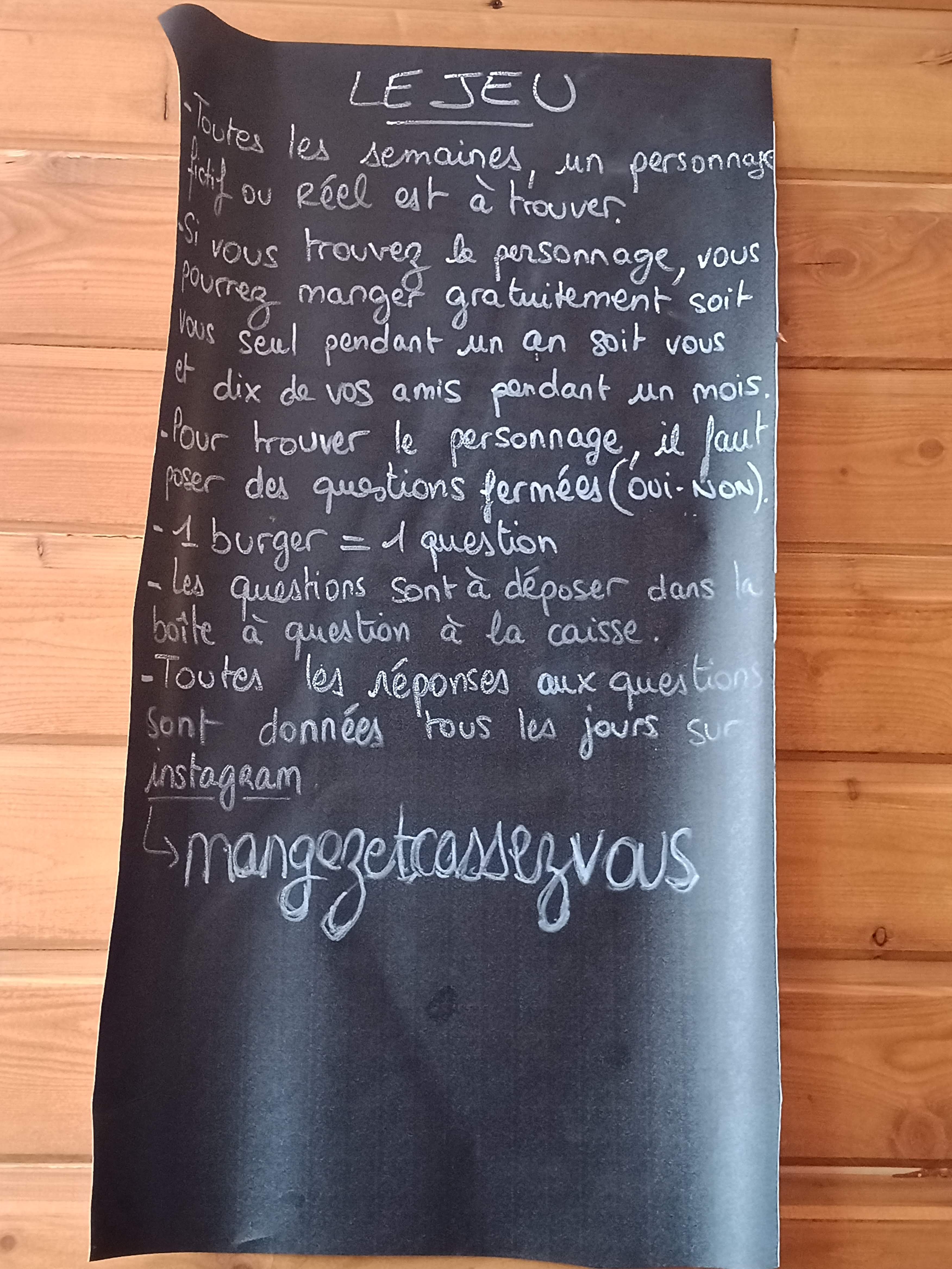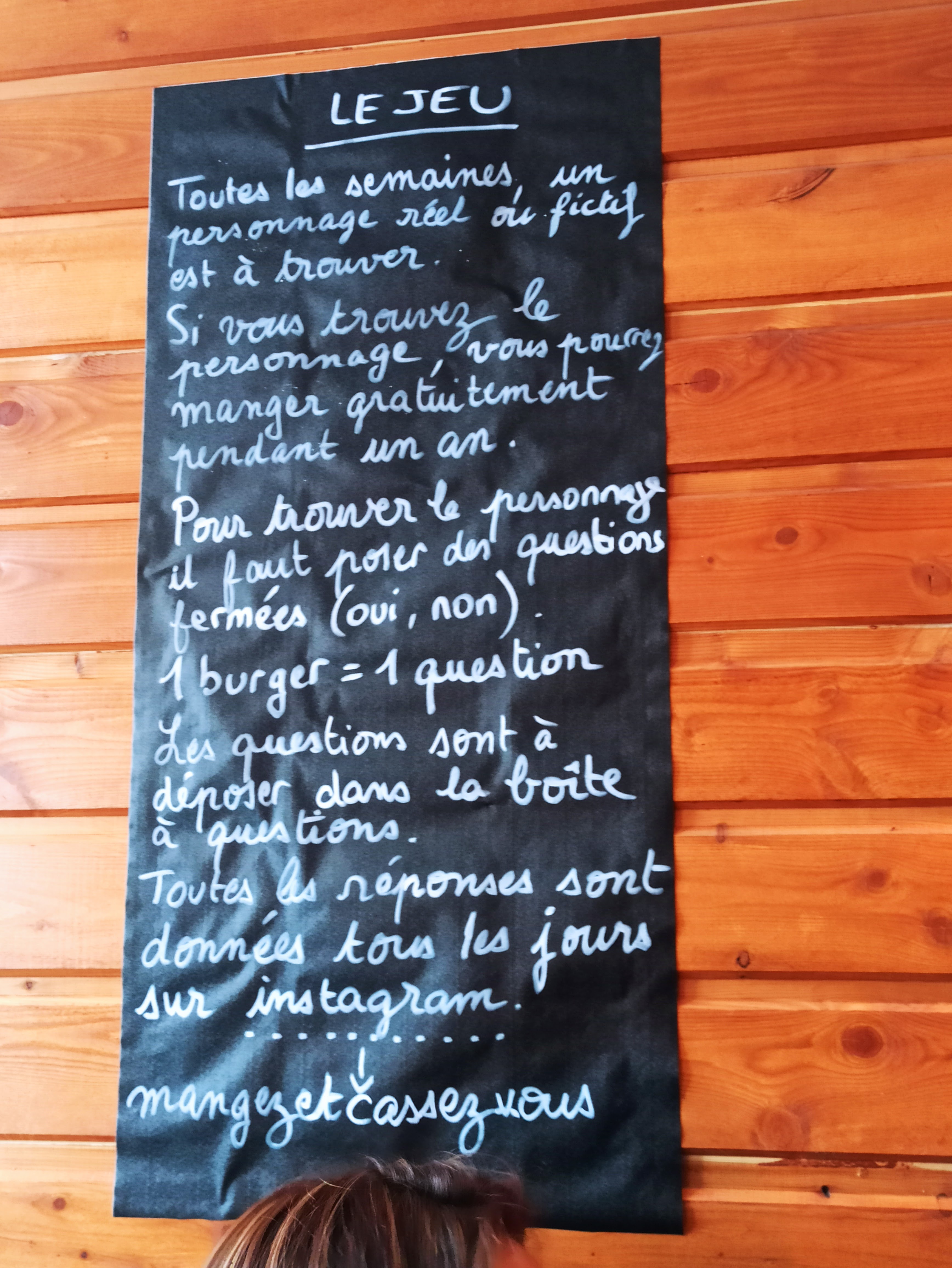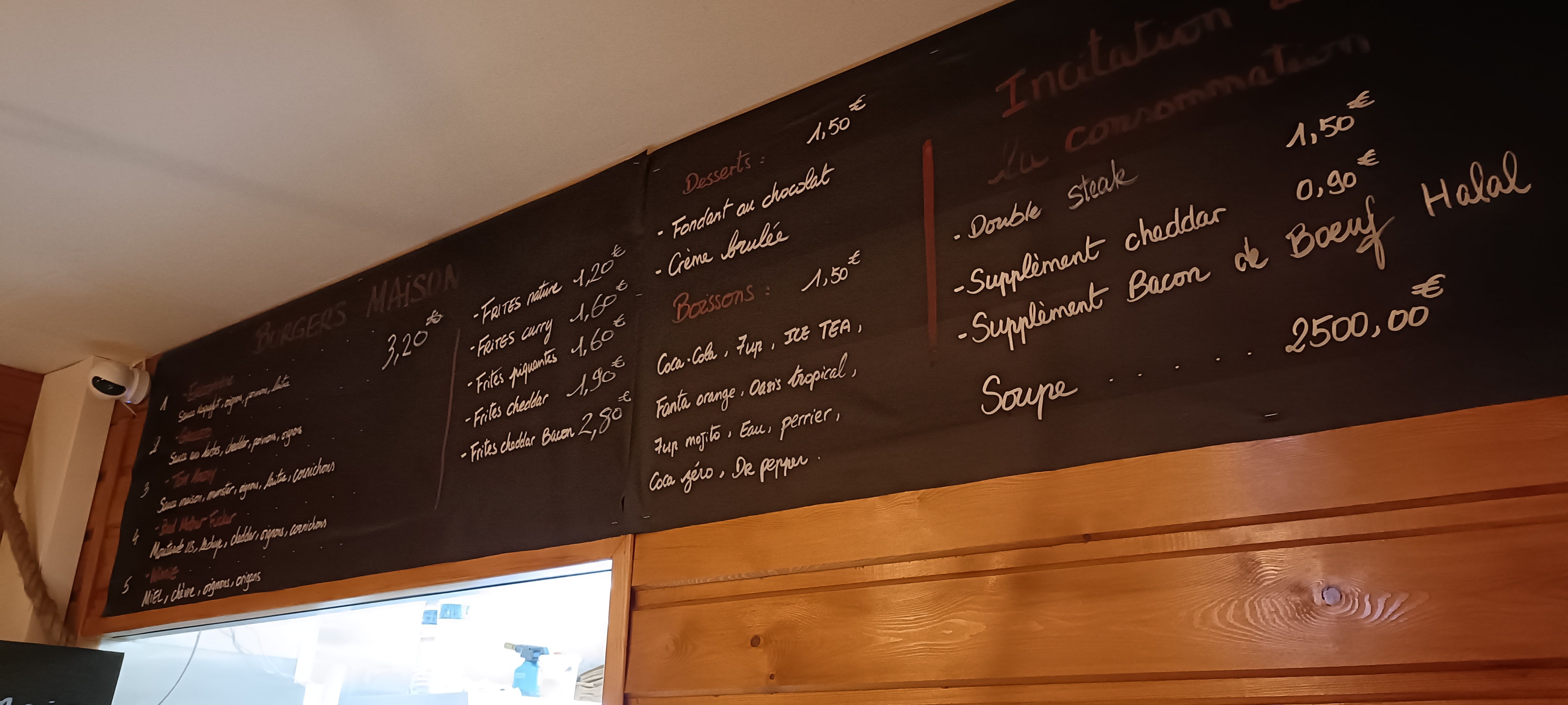 Les burgers sont bons, de bonne taille et bien juteux.. 3,20 le burger et si vous souhaitez un supplément c'est 80 centime pour du bacon que demander de plus ..on mange et on se casse.. malgré le slogan vous vous avez la possibilité de manger sur place il y a une vingtaine de places au maximum il faut savoir que le lieu est ouvert le matin et en soirée de 19h à 22h. Une portion de frites coûte 1 € 20.. Dans ce mini restaurant vous avez la possibilité de voir des messages écrits assez amusant.. par exemple vous avez une liste de personnes qui peuvent avoir des burgers à vie.. sur cette liste il y a des noms d'acteurs ou toute personne qui a joué dans la série Columbo ..
