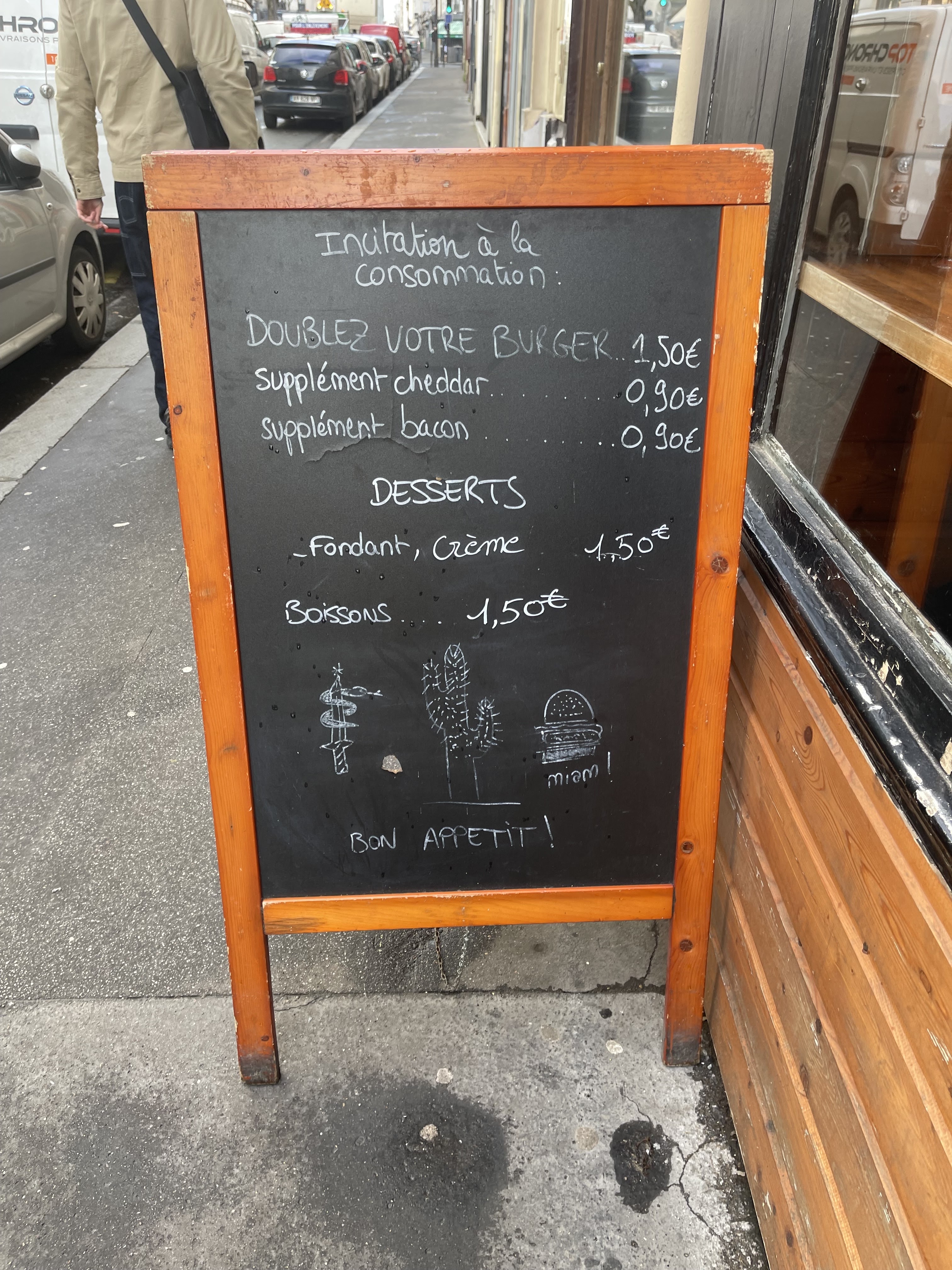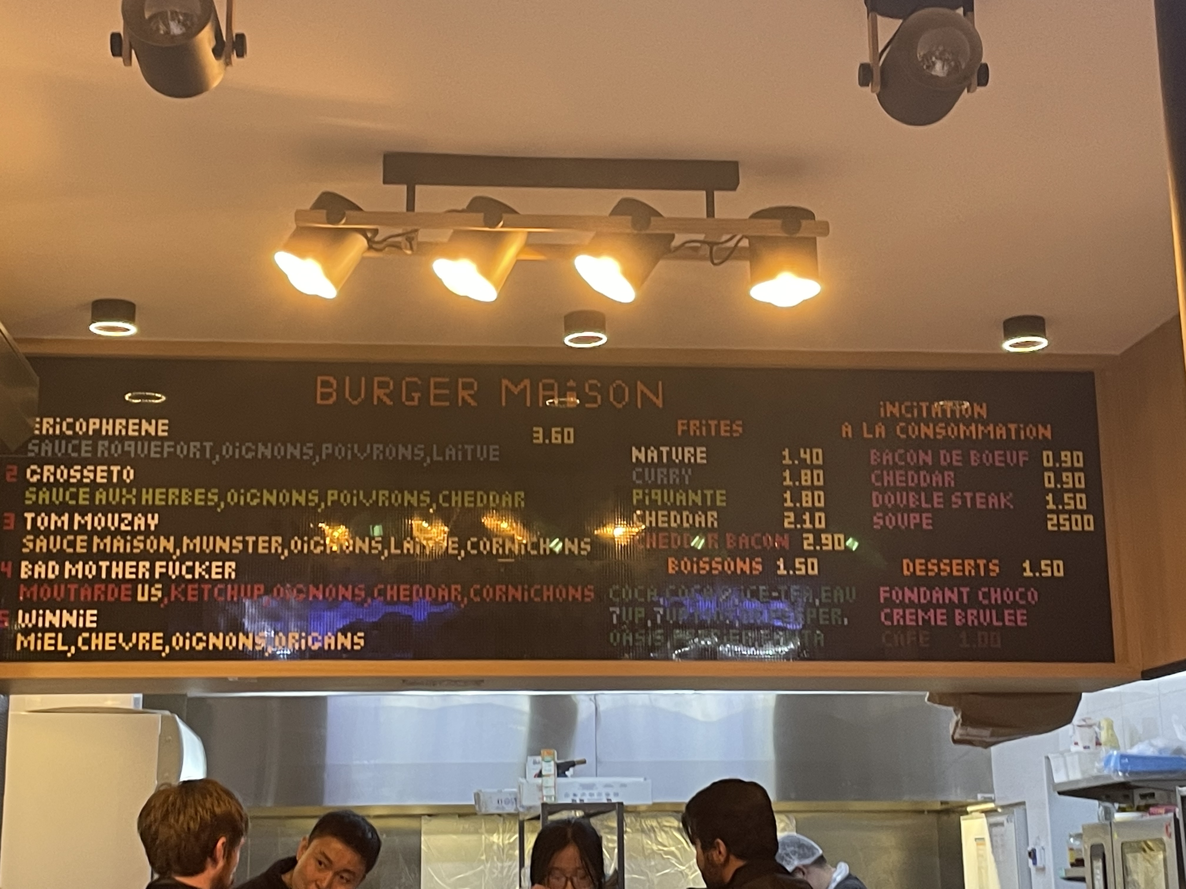 C'est 3,60e le burger. Pas cher, service hyper rapide. Par contre c'est pas non plus les burgers de l'année niveau goût. Mais entre ça et un burger a 15 euros... Ambiance sympa, équipe sympa.
