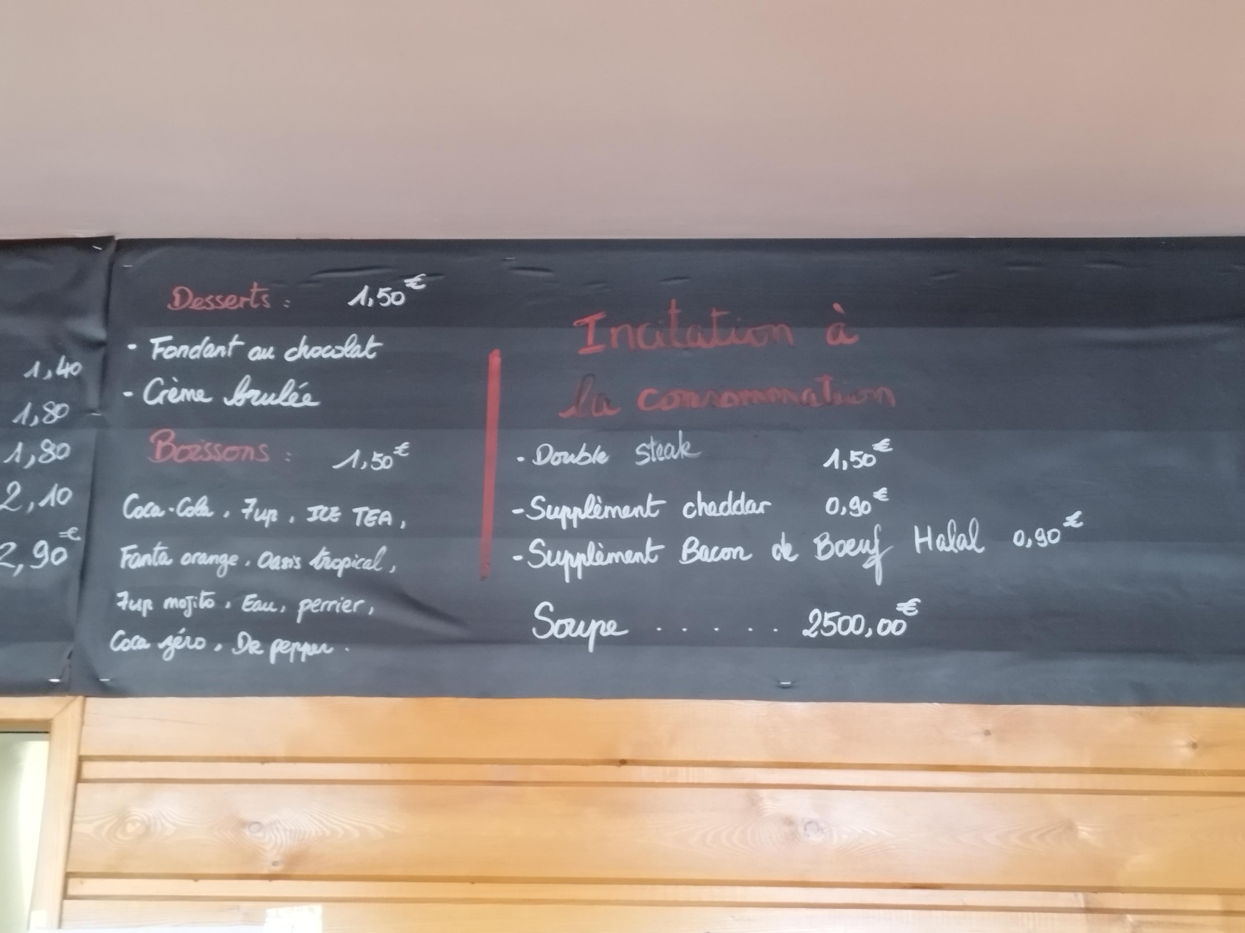 Je donne 4 etoile car le steak est sec et ils mettent pas trop de sauce histoire de rendre le burger moins sec Mais si non c'est trop bon L'accueil est au top Je recommande fortement Coup de coeur pour Le fondant au chocolat qui ne coute que 1,5 euro defiant toute concurrance :) Je vous ai partager le menu mise a jour 09/22 Ya toujours une queue aux certaines horaires Donc evitez les heures de pointe si non vous risquez une attente estimé a 25 min Ps : c'est halal ya la certificat juste devant la caisse que je partage ici Pour finir MANGEZ ET CASSEZ-VOUS :)