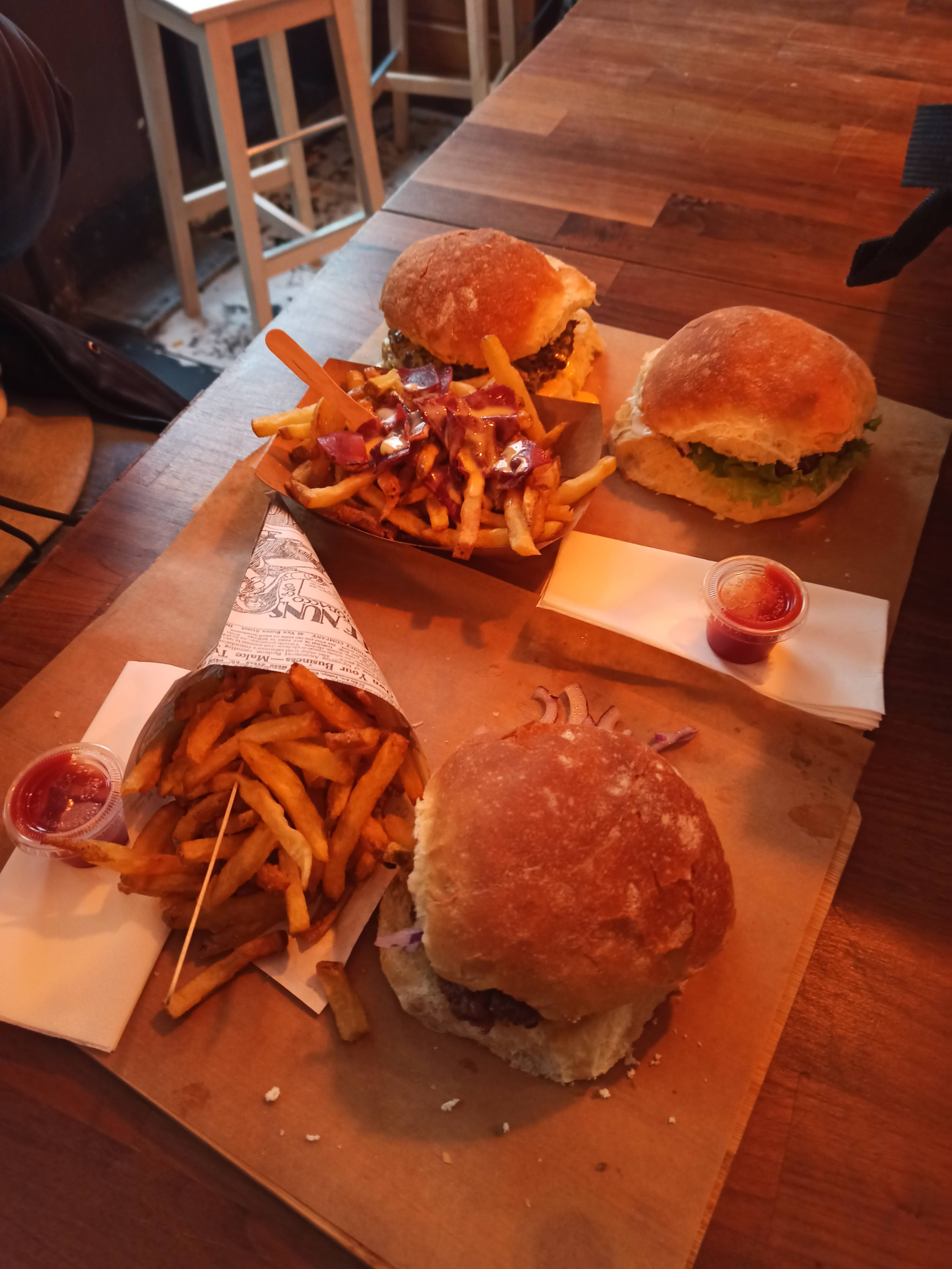 Les burgers sont vraiment très bon, même si ça manque un peu de sauce. Les frites vont avec du ketchup, bon point. Le restaurant est vraiment pas cher. Il n'y a presque pas de place mais endroit convivial. Je recommande.