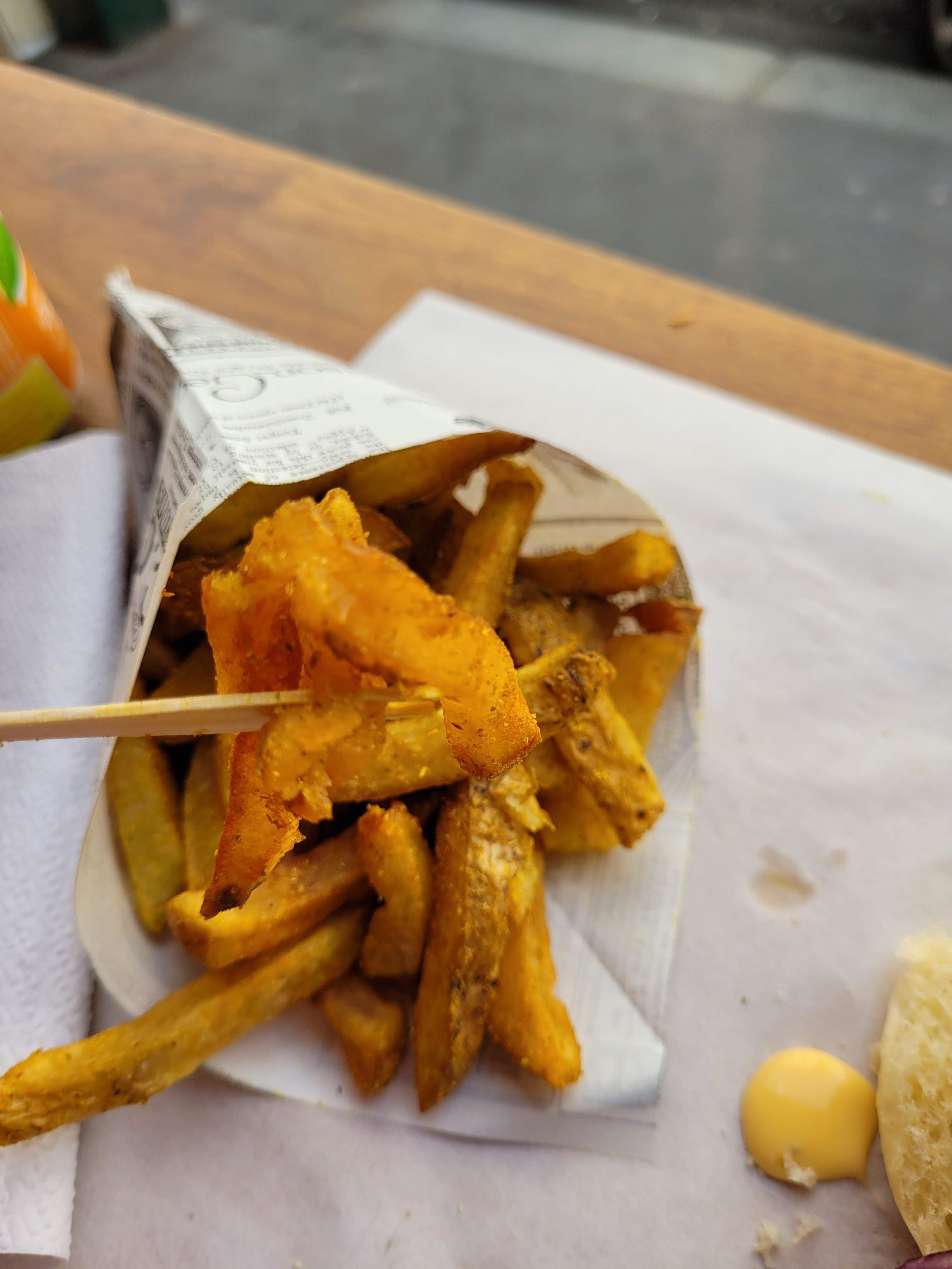 Le Concept génial. Les Burgers sont ultra savoureux et les frites maison impeccable, en plus des 3 saveurs proposé (nature ,curry et cheddar). Petit Bémol,la fil d'attente, et la difficultés à manger les Burgers sans en mettre partout,ou c'est moi qui c'est pas manger comme il faut.😅