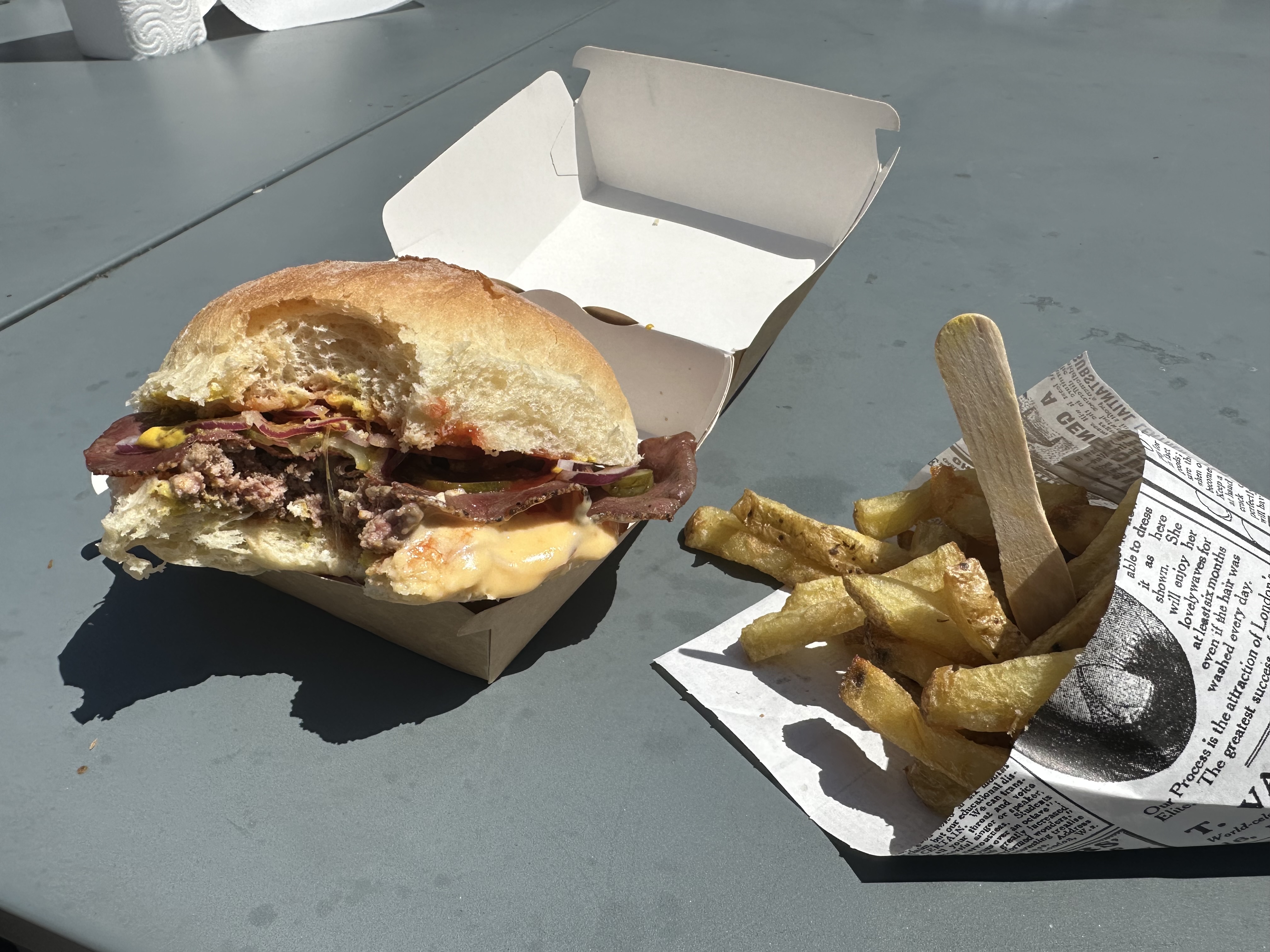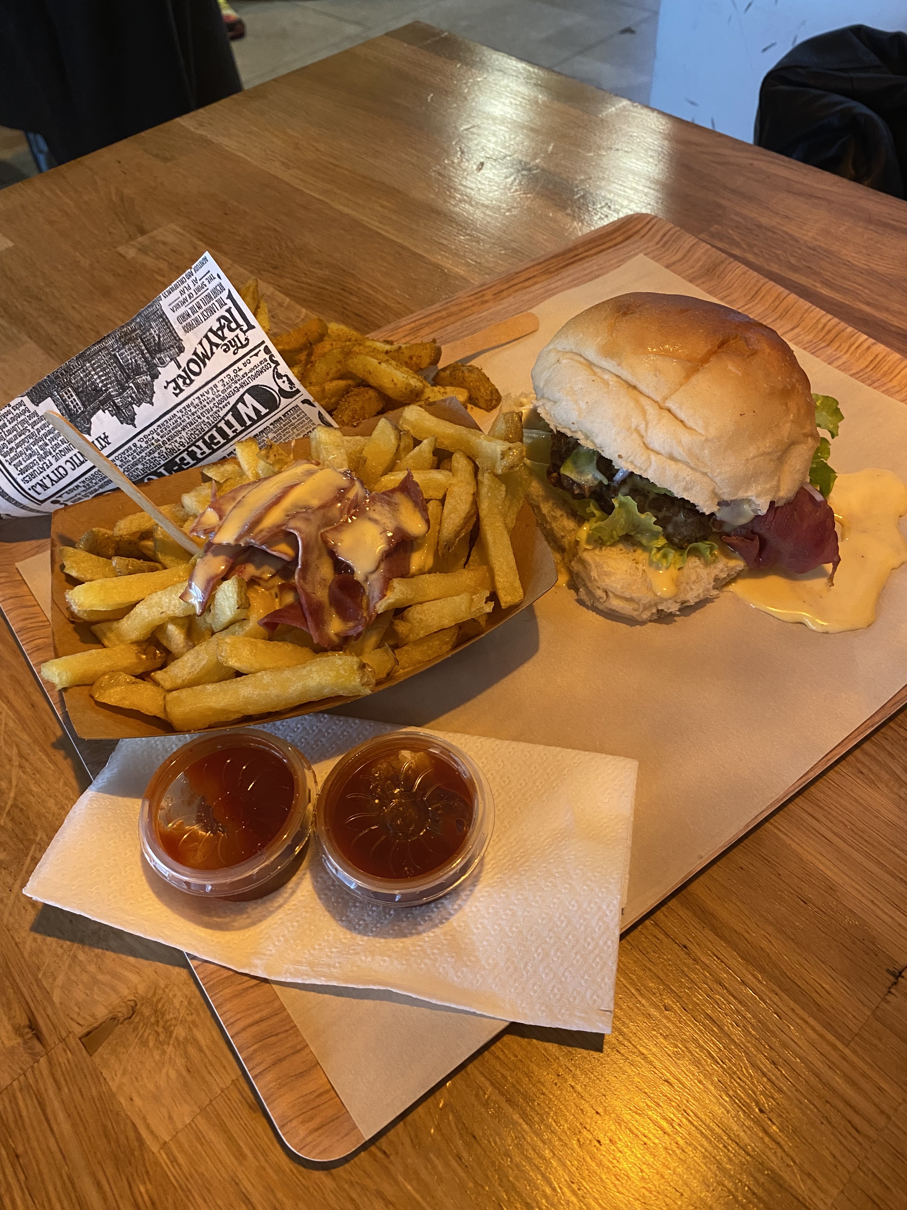 Le lieu est très petit , il n'y a que quelques places assises donc venez tôt si vous déjeunez sur place. À l'ouverture, c'est l'idéal pour ne pas avoir de queue Les burgers sont pas mal pour le prix. Sauf la viande que je trouve assez dure mais sinon ils sont très copieux et généreux en garniture. Les frites sont supers bonnes surtout celles au curry. Attention, avec les suppléments, la note grimpe vite mais on reste à un menu à 7e par pers environ ce qui est très convenable. Je ne recommande pas le cheedar qu'ils proposent avec. C'est écœurant. Bonne adresse pour manger sur le pouce pas cher.