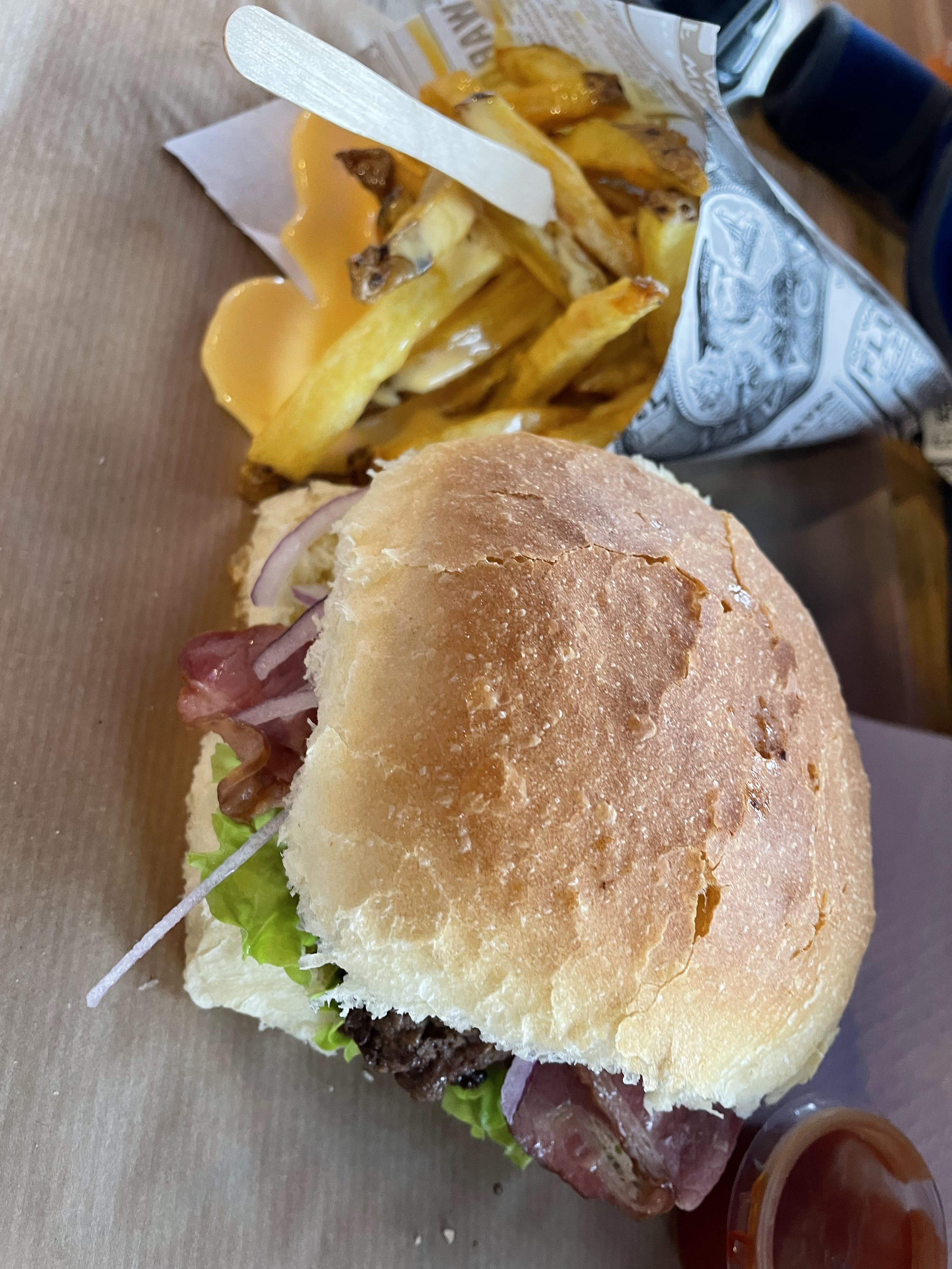 Burger délicieux par contre les frites étaient tombées dans un pot de sel... impossible de les manger correctement. Sans cette erreur, le repas aurait été parfait ! Le Burger est cuisiné qu'avec des produits frais, de qualité et en quantité ! 3,6euros le Burger, 2,8euros les frites avec cheddar et bacon. Le ketchup est super bon, attention ils ont pas de mayo ! Il y a 16 places assises à l'intérieur et des toilettes à disposition.