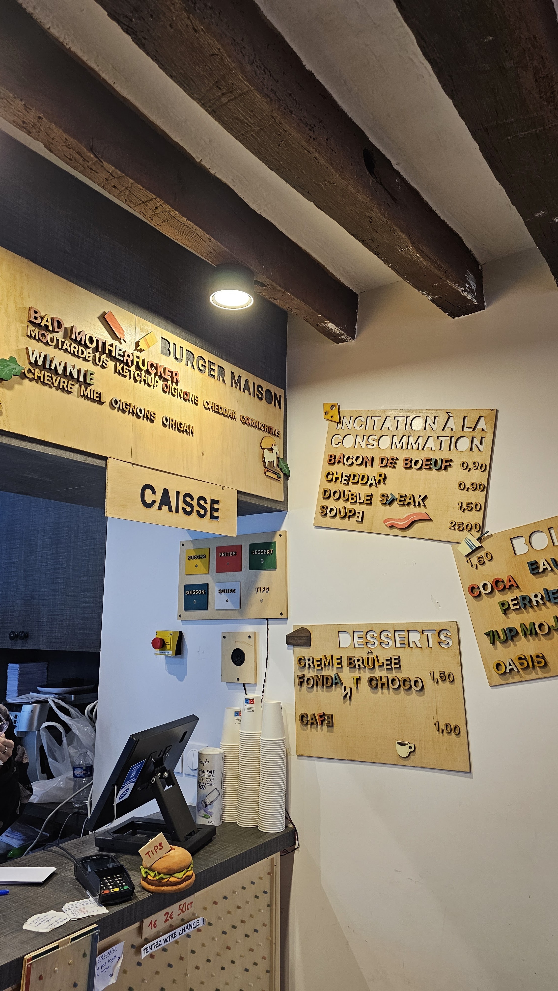 Pour le prix c'est vraiment très bien ! Moins de 4€ le burger, frites à moins de 2€. 4 tables de 4 personnes. Le but : manger rapidement et partir afin de laisser la place aux autres. On est servi extrêmement rapidement. Les frites au curry sont décevantes, les classiques doivent être mieux. Pour les petits budgets ou manger vraiment sur le pouce et rapidement c'est parfait !