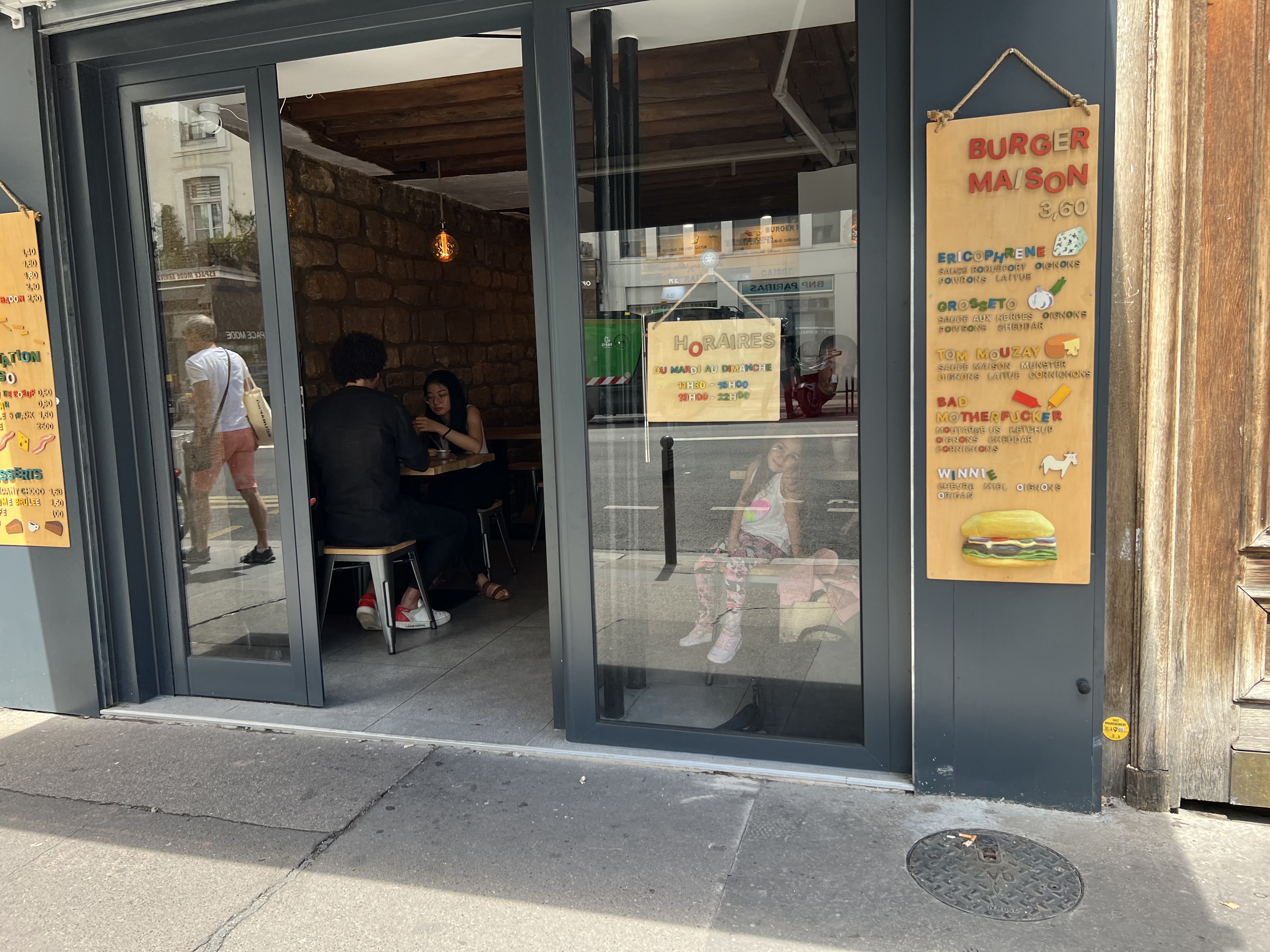 Accueil aimable et souriant viens d'ouvrir sur le faubourg saint Antoine Sommes venus en famille burger frites parfait rapide et efficace Je conseille vivement On a très déjeuner possibilité place assise. Bravo quand c bon faut le dire