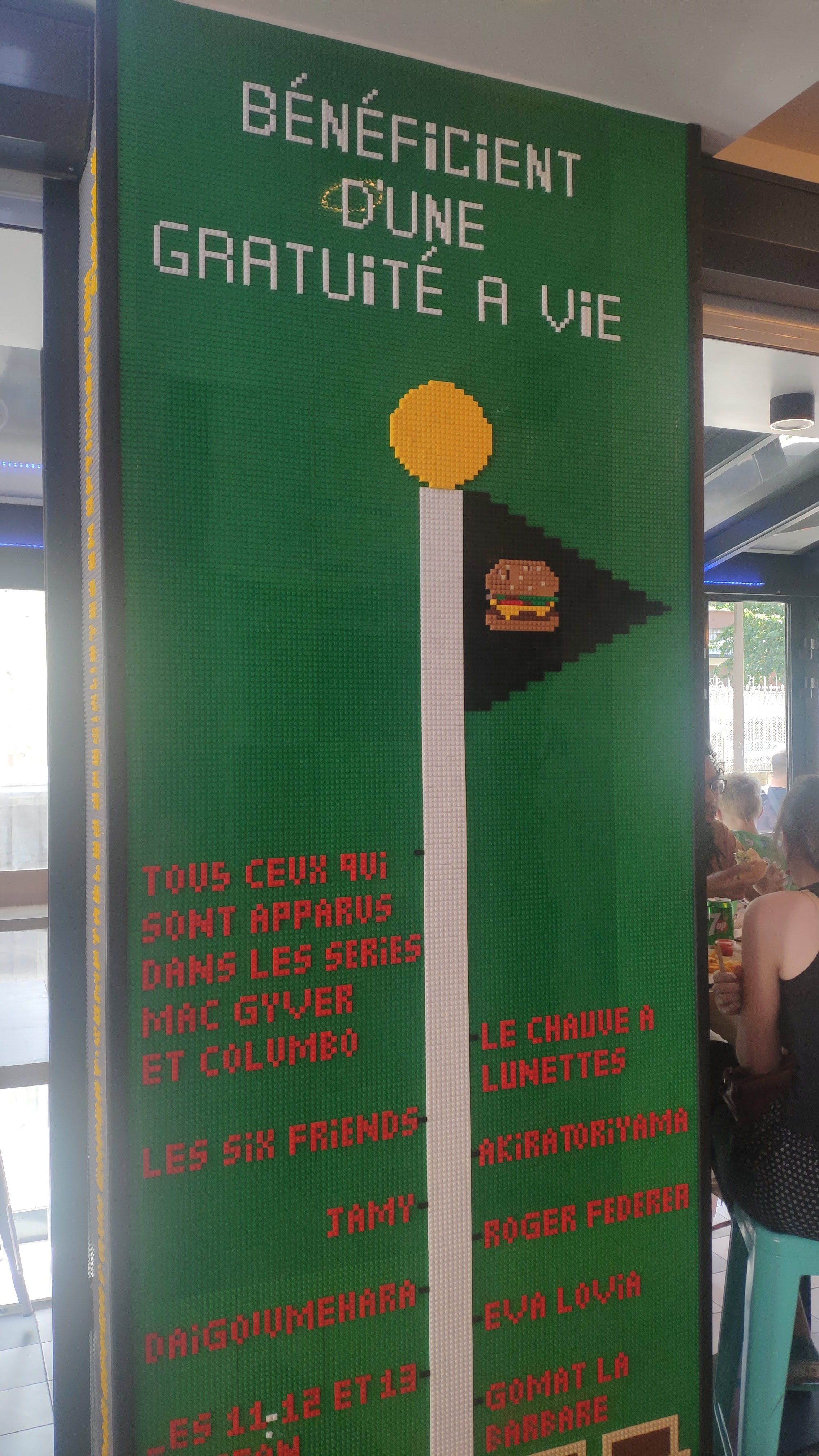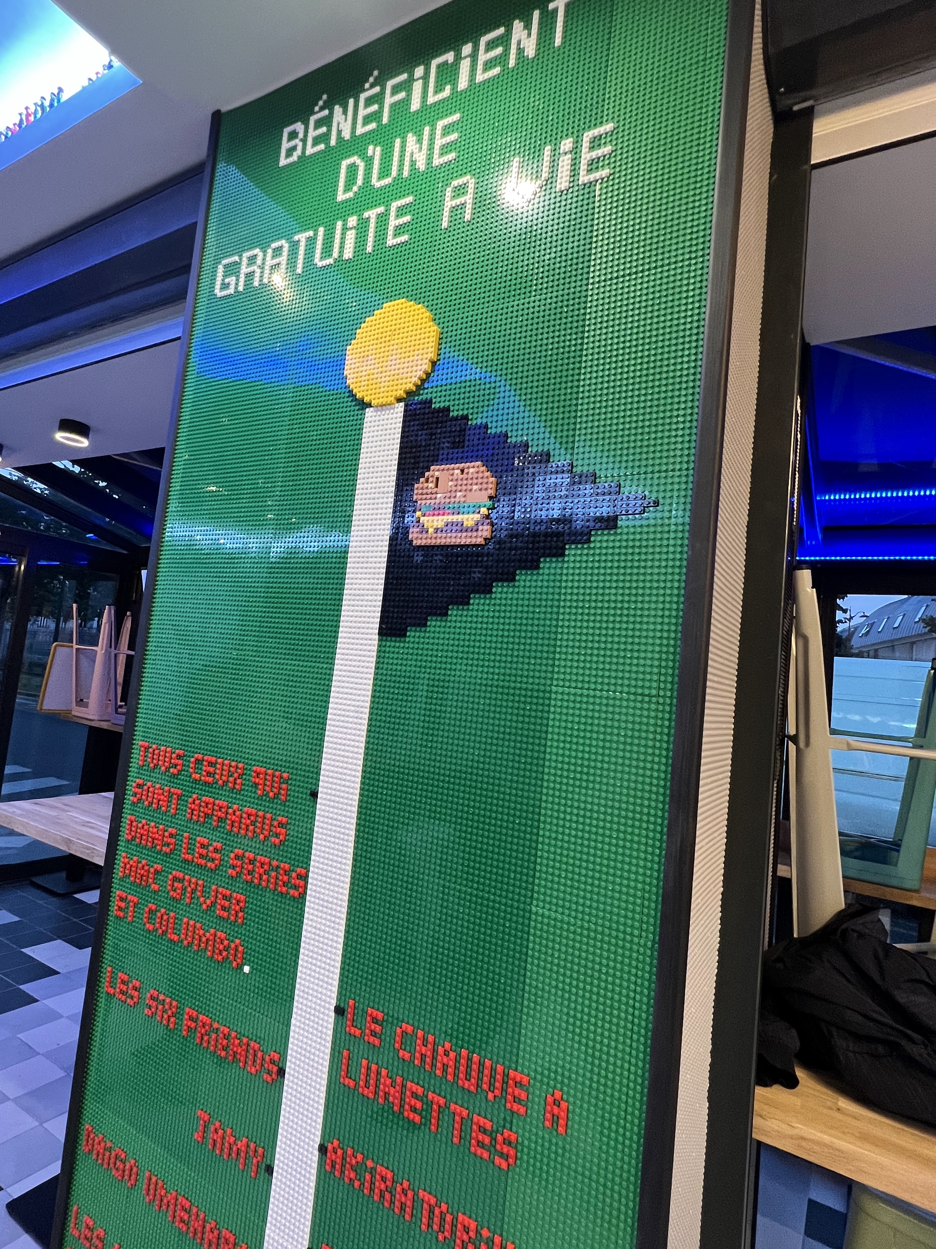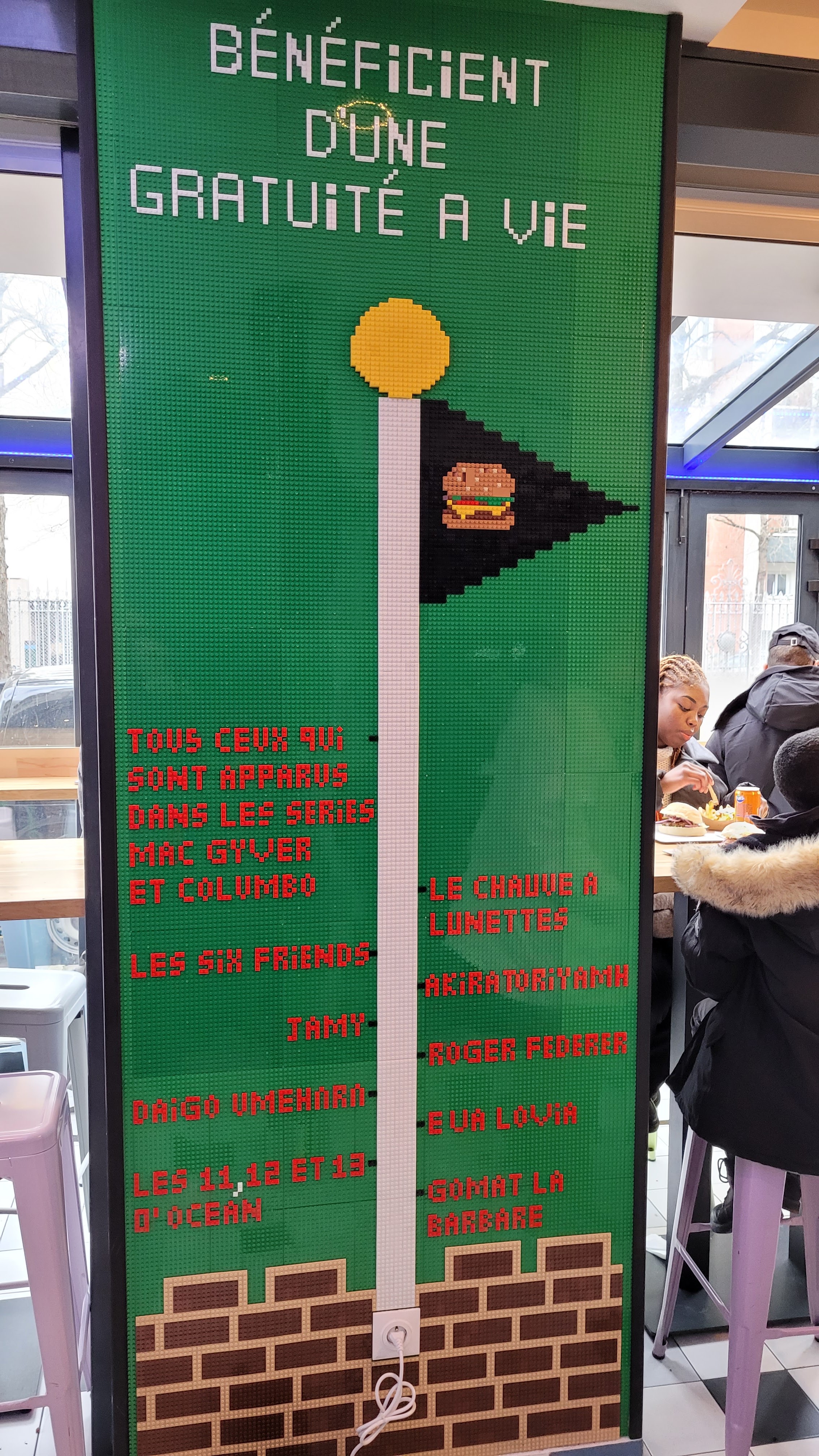 A proximité du métro Super déco Lego Bon choix de burger, frites, boissons et même desserts Pas trop d'attente Presque tout et fait maison Les burgers sont bon idem pour les frites bacon cheddar et le fondant est bien fondant Un point négatif ? La soupe un peu chère 😉 Pas de coca cerise et de mayo