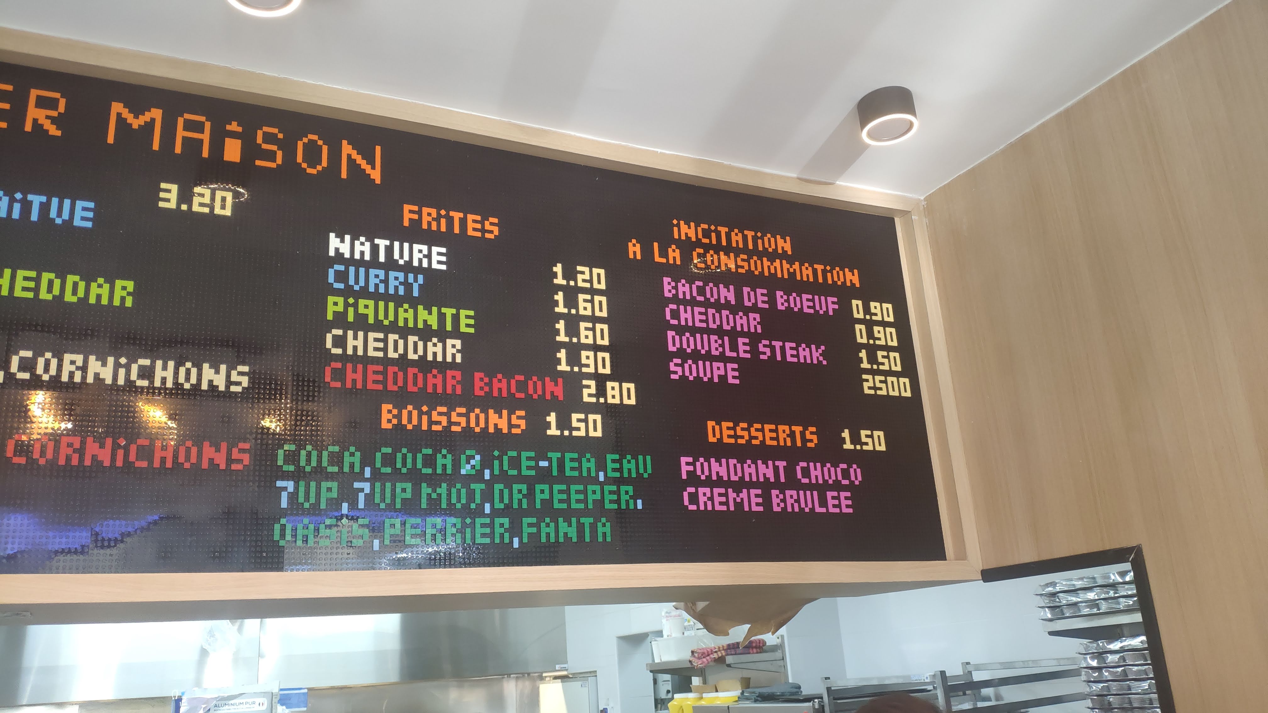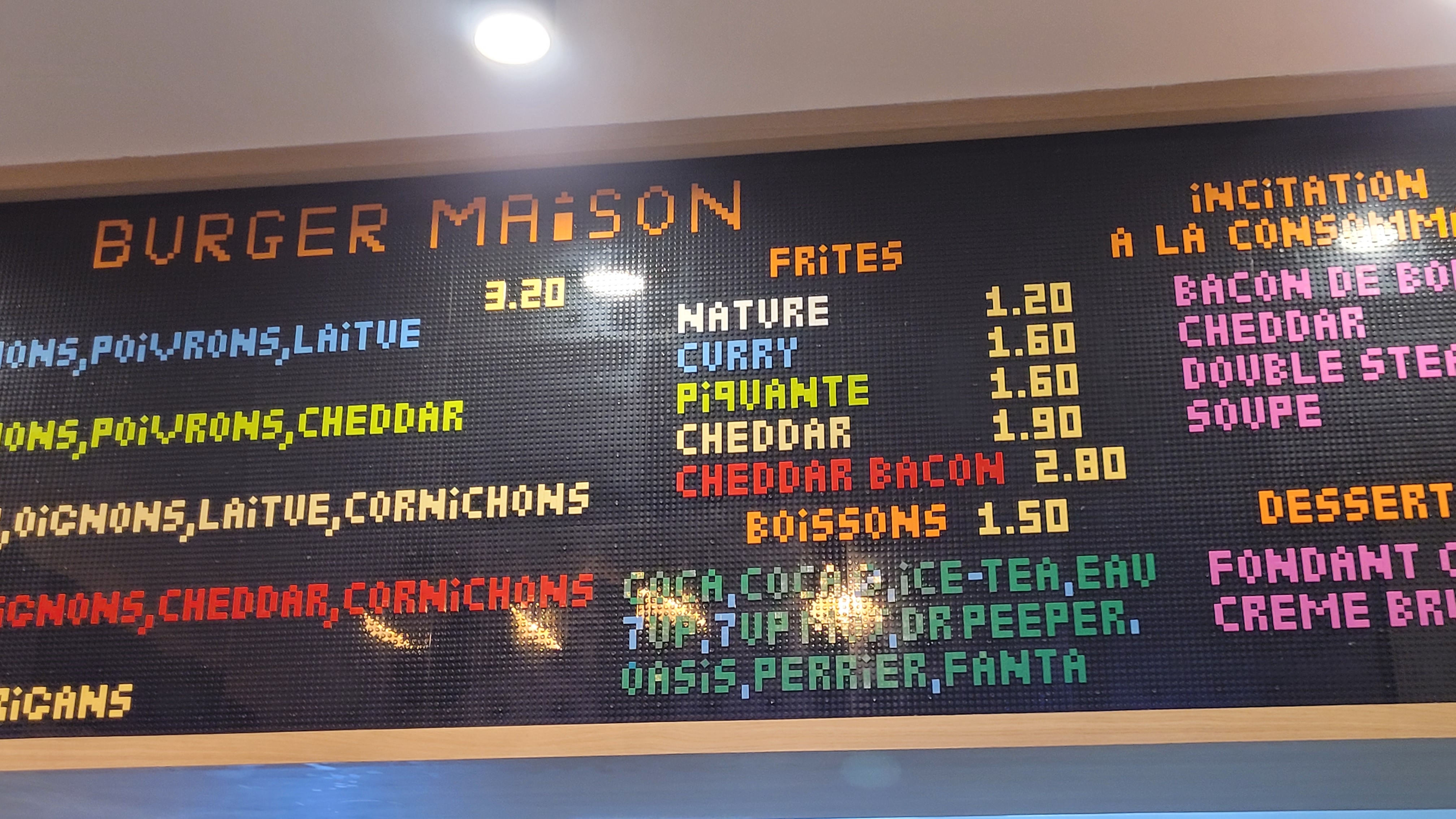 3,2€ le burger et 1,2€ les frites maison. Accueil sympa. Nous avons testé deux burgers . Bonne ambiance, déco Space invider et star Wars en lego, Venir très tôt. Burger délicieux : pain aéré léger et viande épaisse pas semelle comme mc Do ou grec... Le burger n'est vraiment pas petit, je n'ai pas pu finir mes frites, ne pas se fier aux photos où ils paraissent petit. J'y retournerai bien tous les jours ! Certificat halal en caisse pour ceux qui souhaitent.