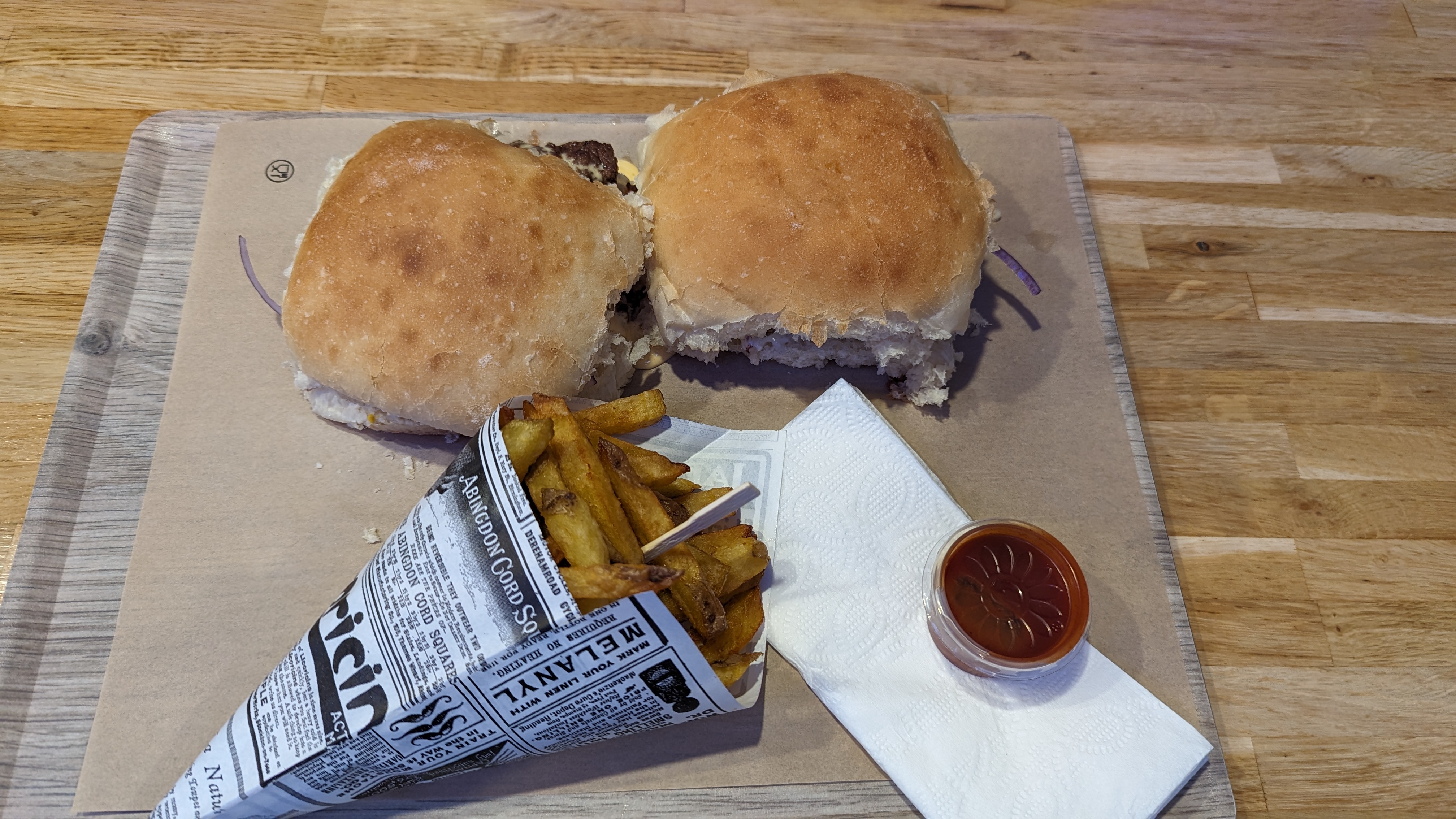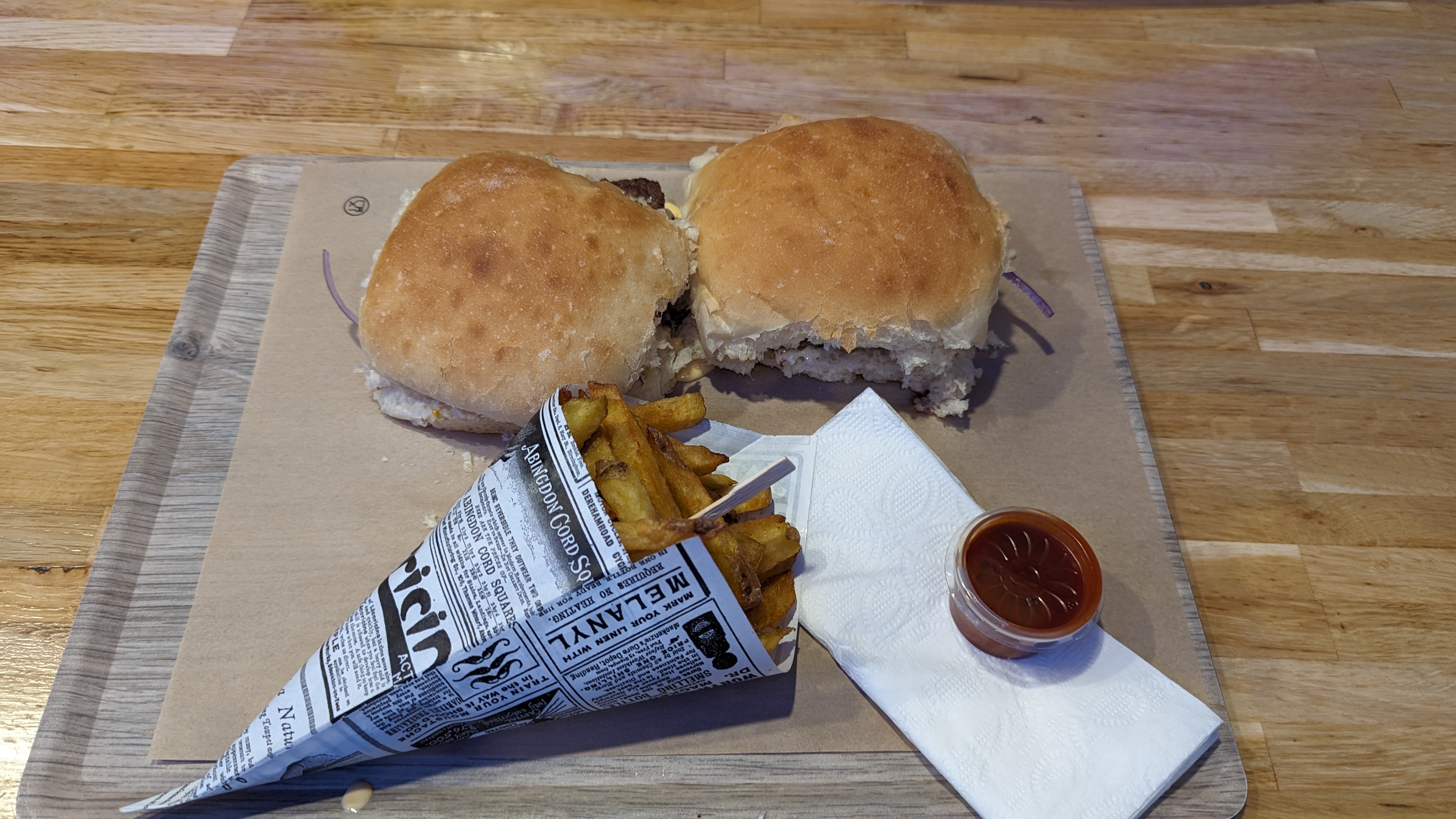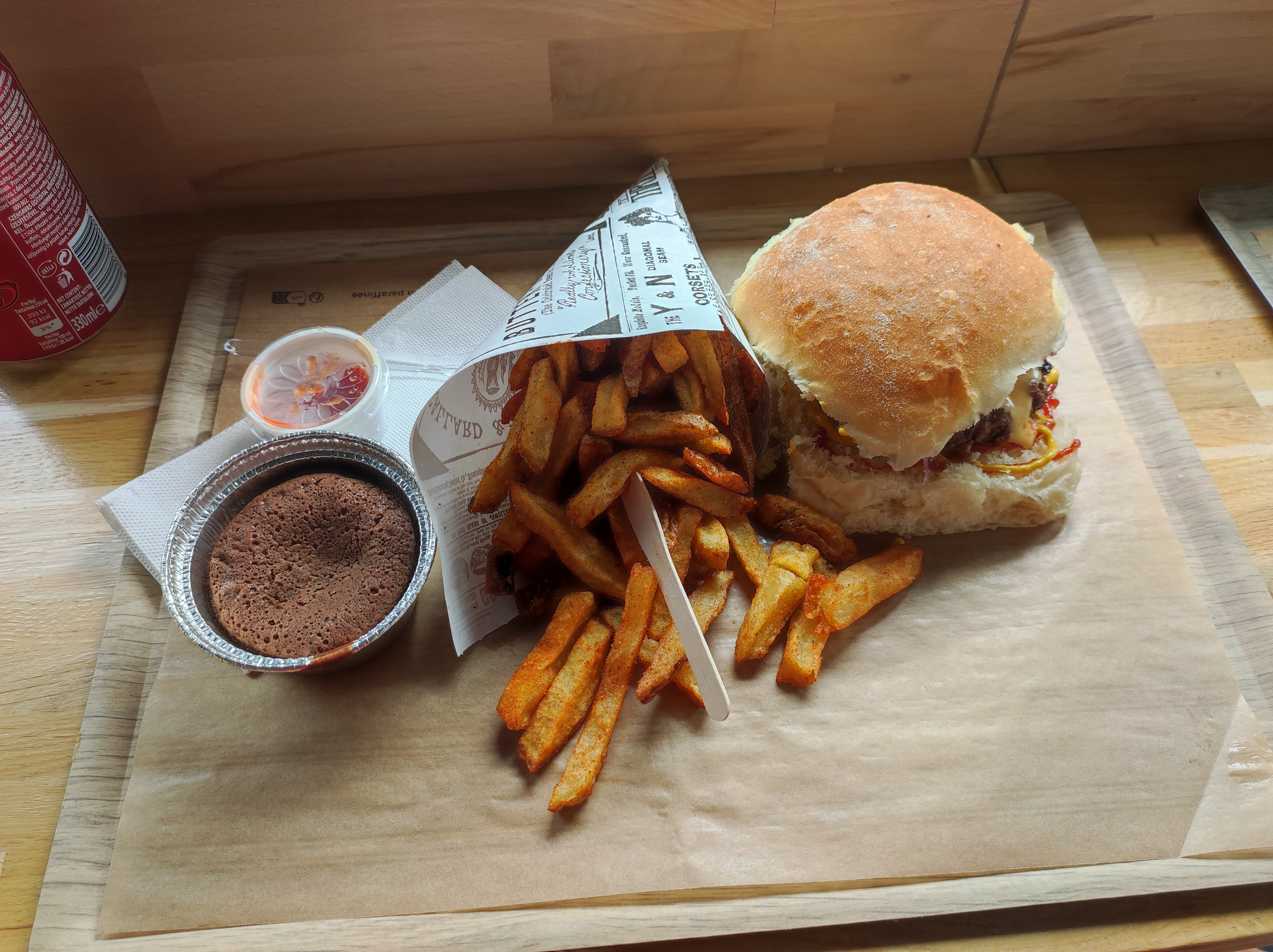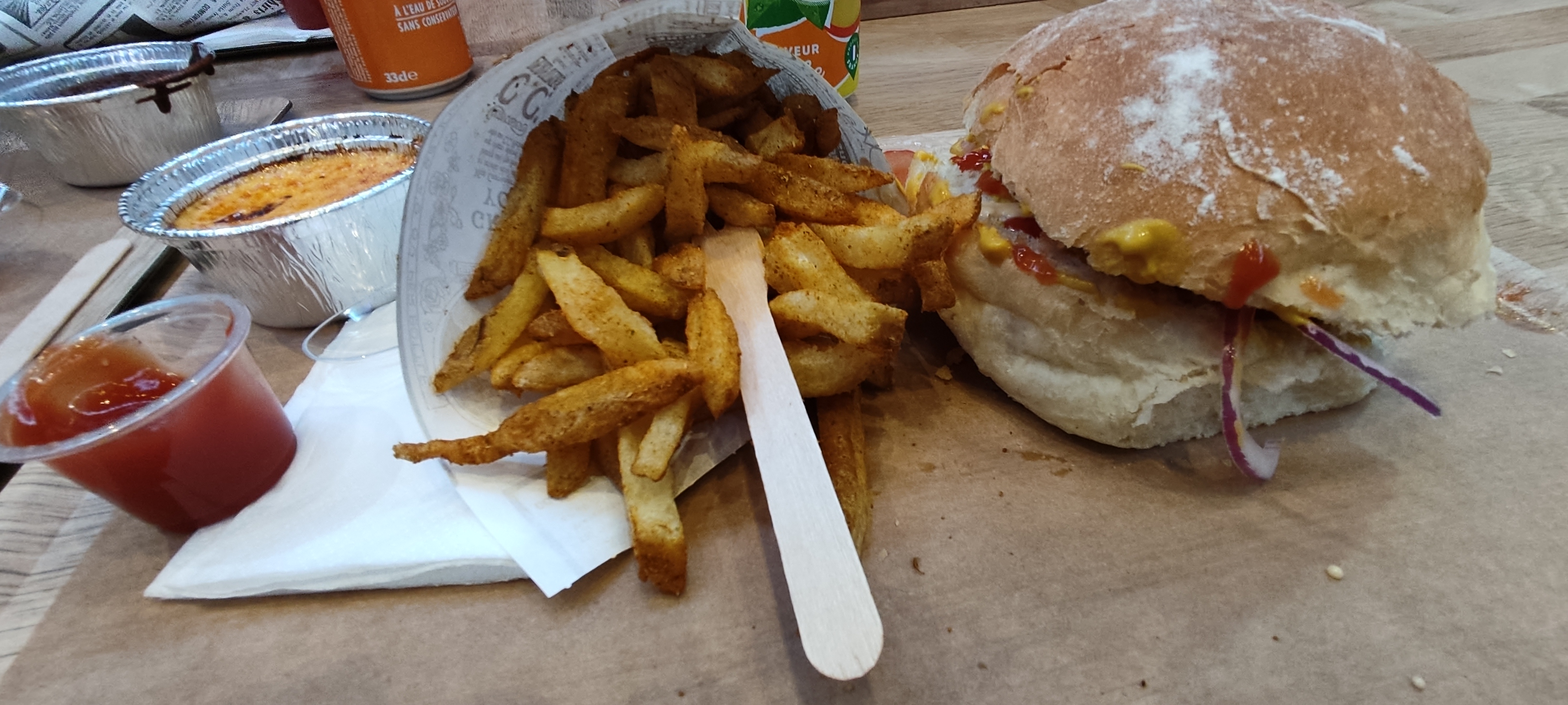 Le burger et les frites étaient ok mais vraiment pas pratique à manger avec les mains. Le problème est la sauce au fromage qui est hyper liquide et on en met partout. Il faudrait soit un emballage autour du burger soit rendre la sauce moins liquide.