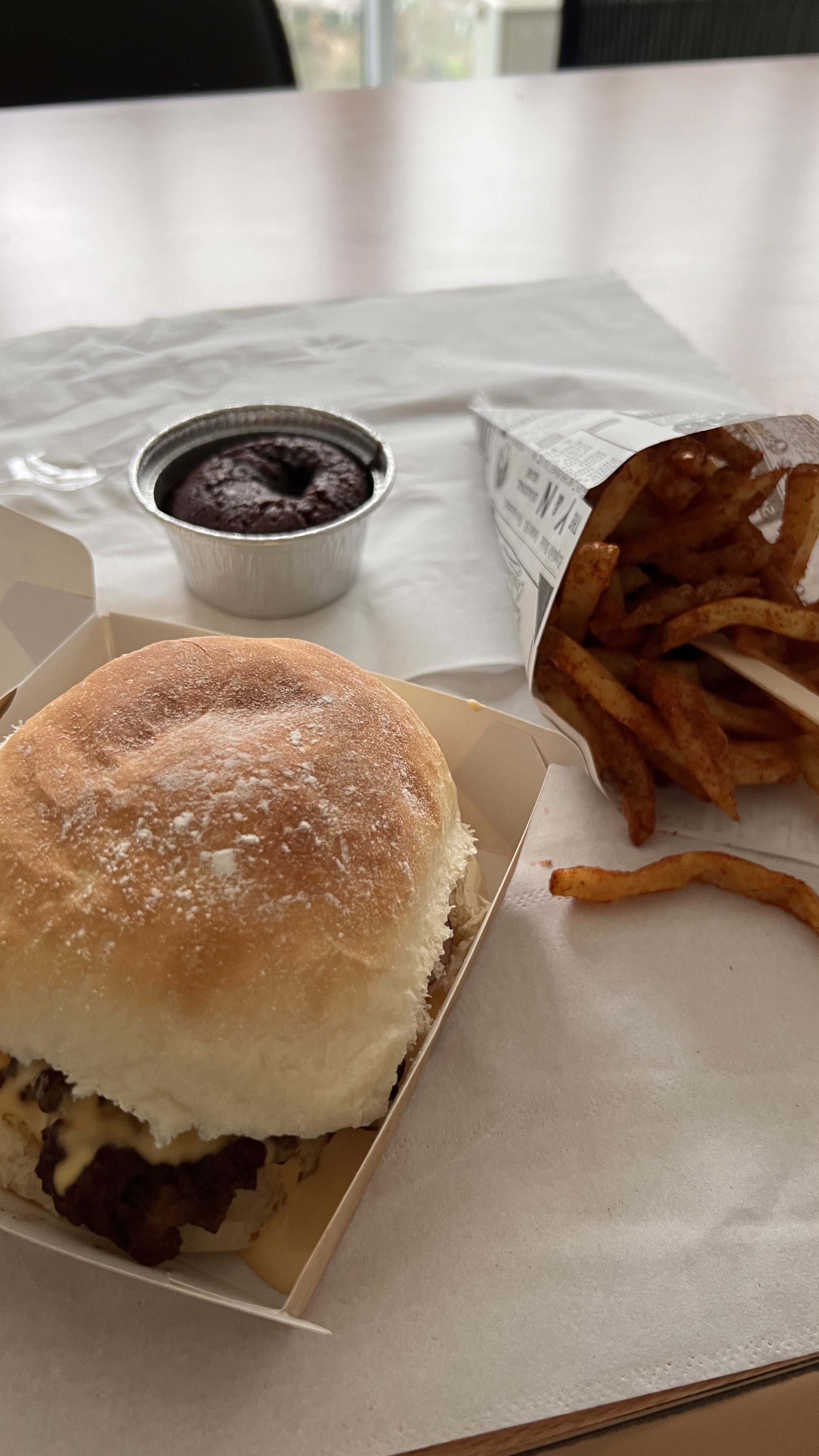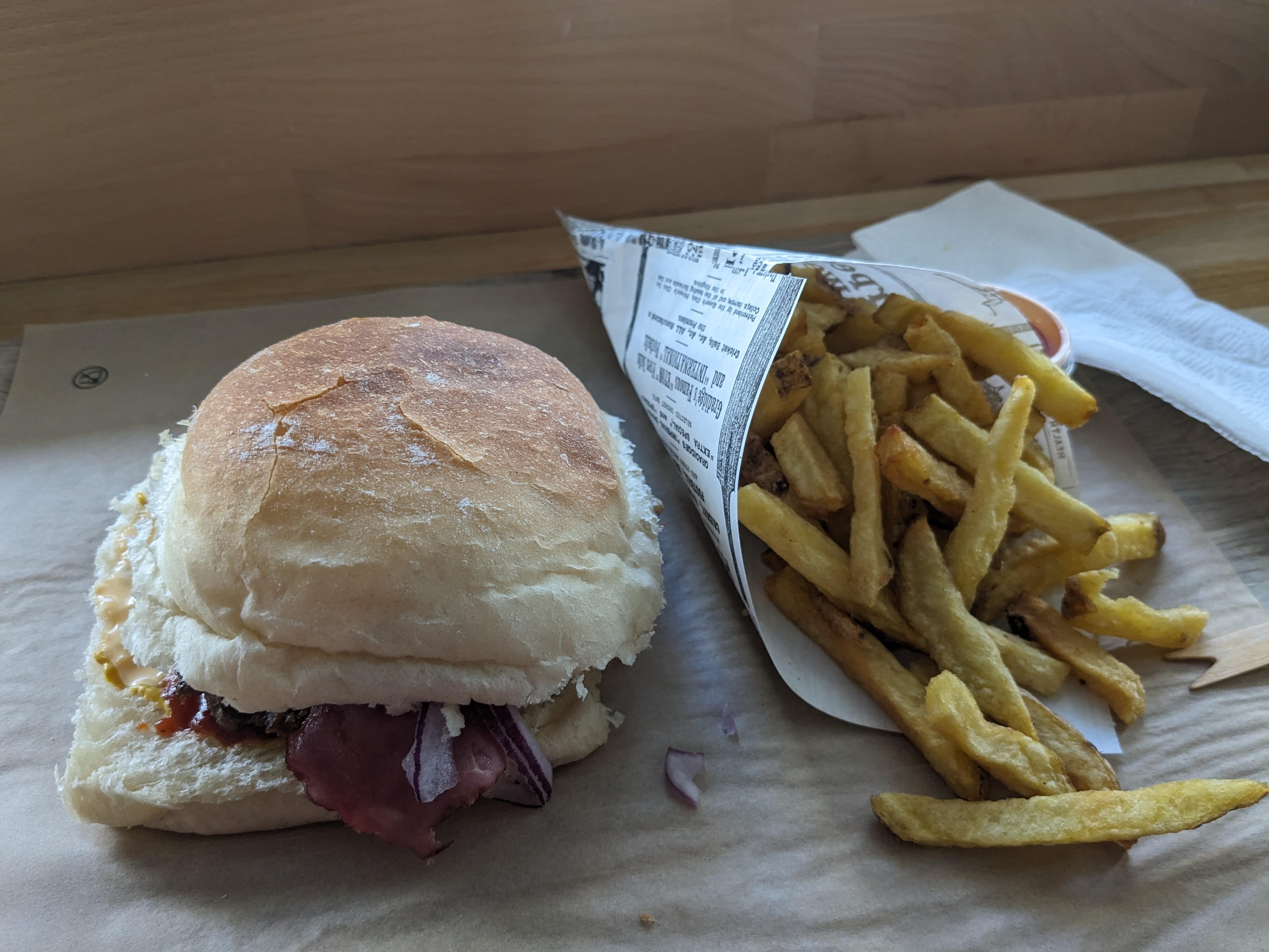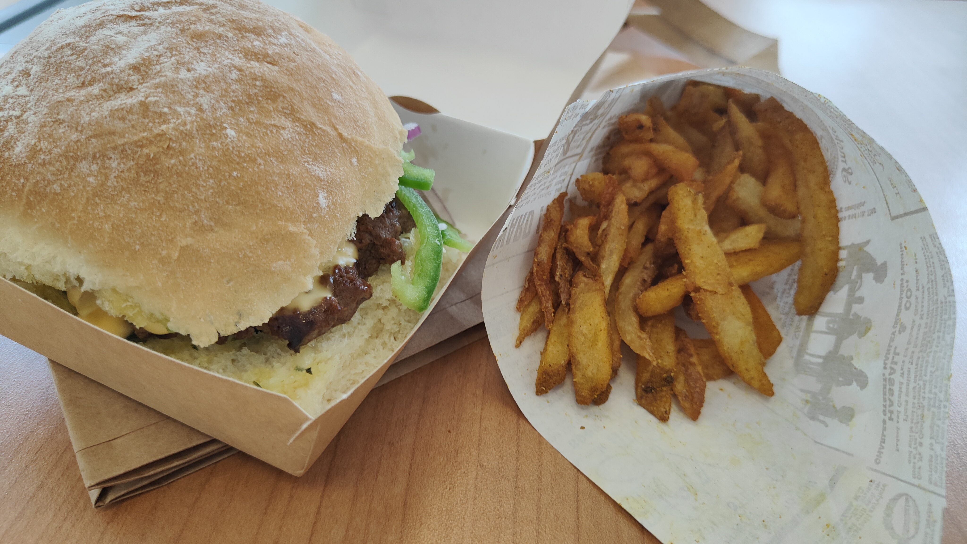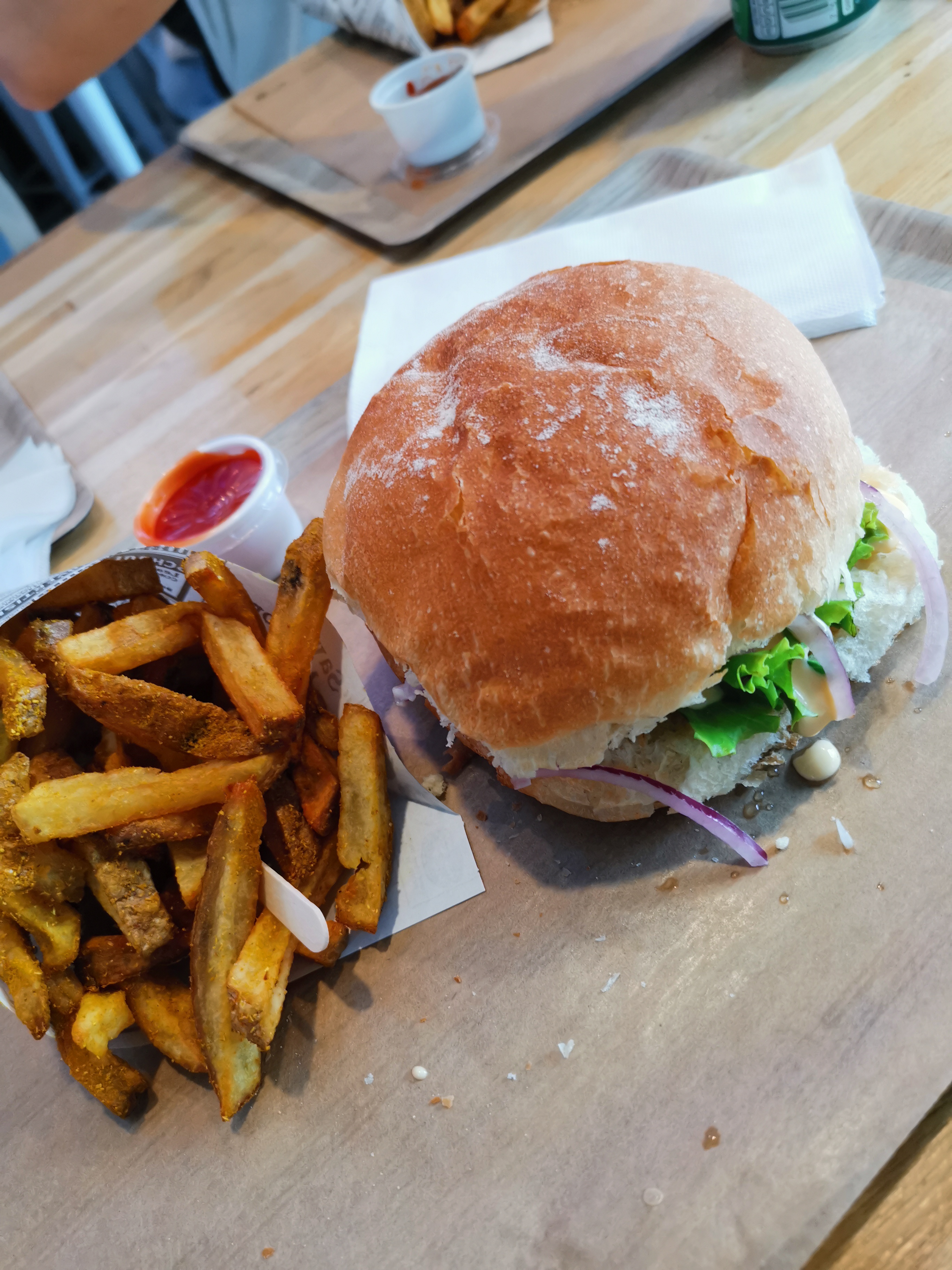 Le burger et les frites étaient ok mais vraiment pas pratique à manger avec les mains. Le problème est la sauce au fromage qui est hyper liquide et on en met partout. Il faudrait soit un emballage autour du burger soit rendre la sauce moins liquide.