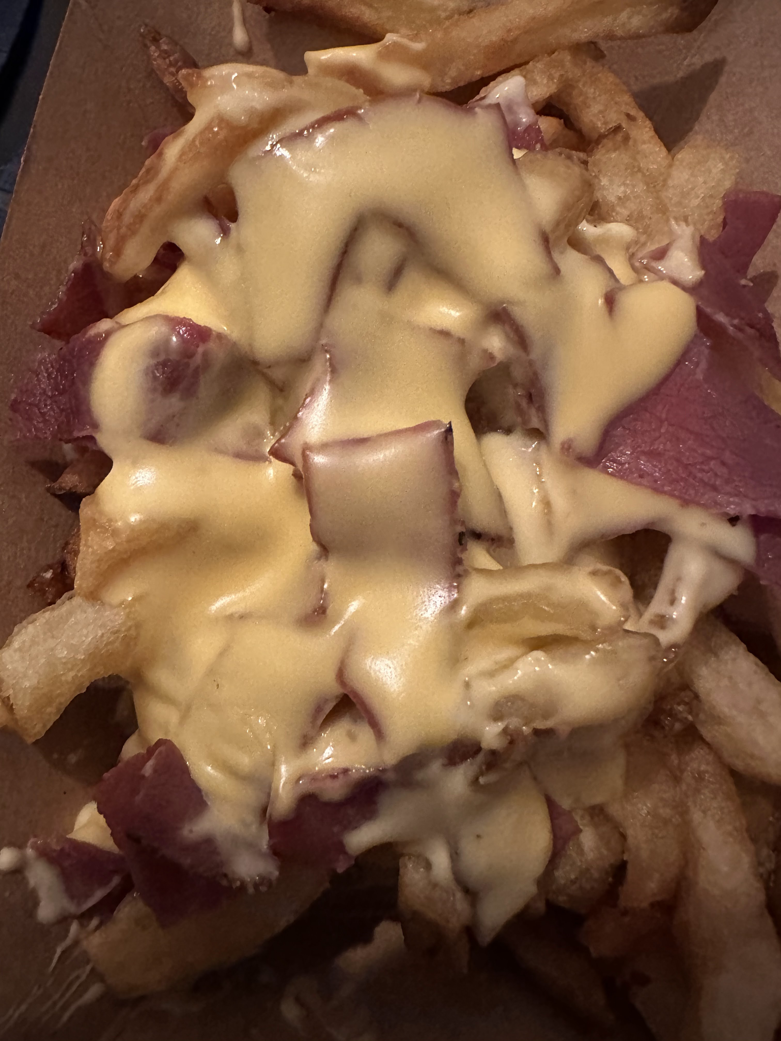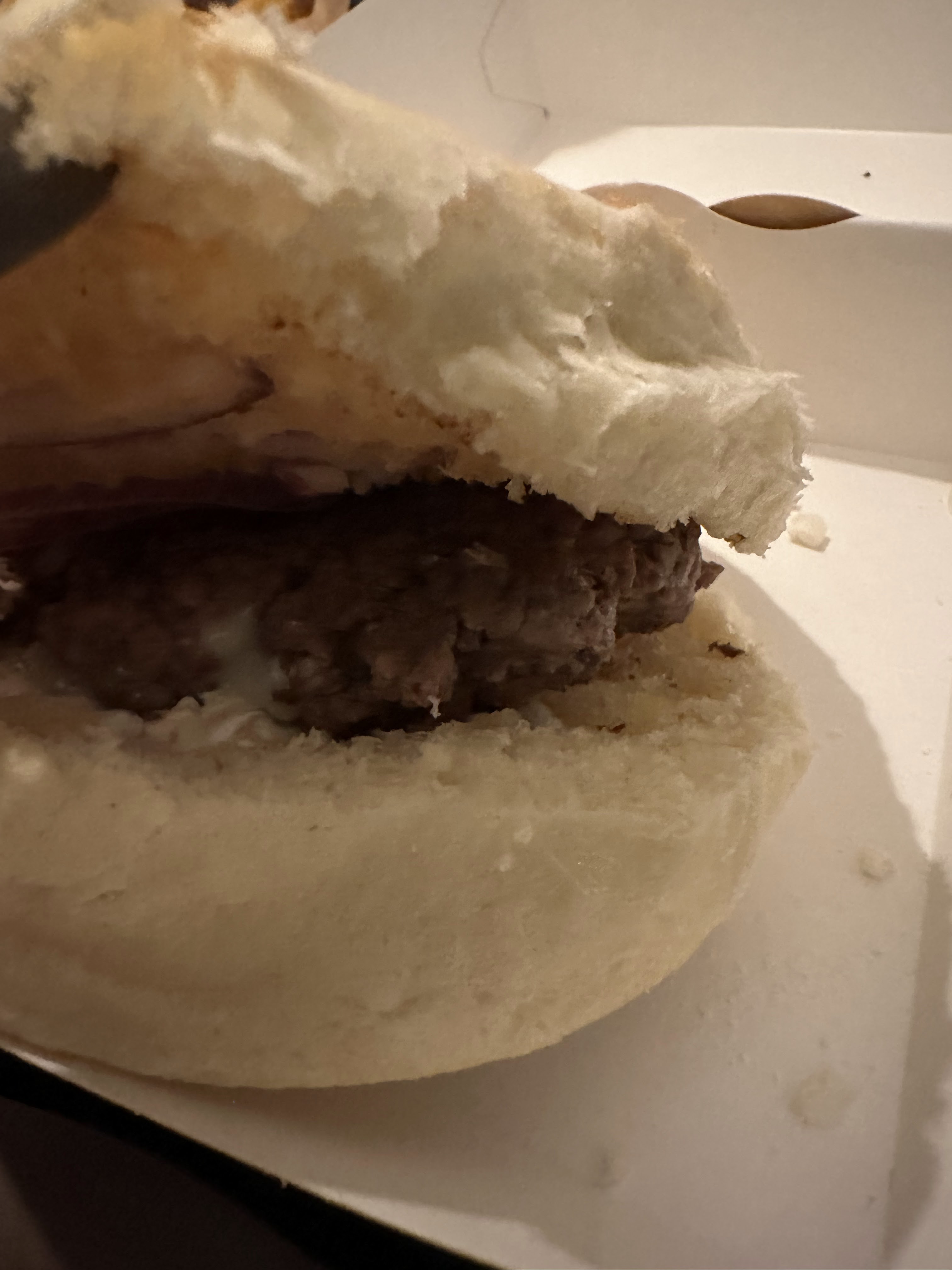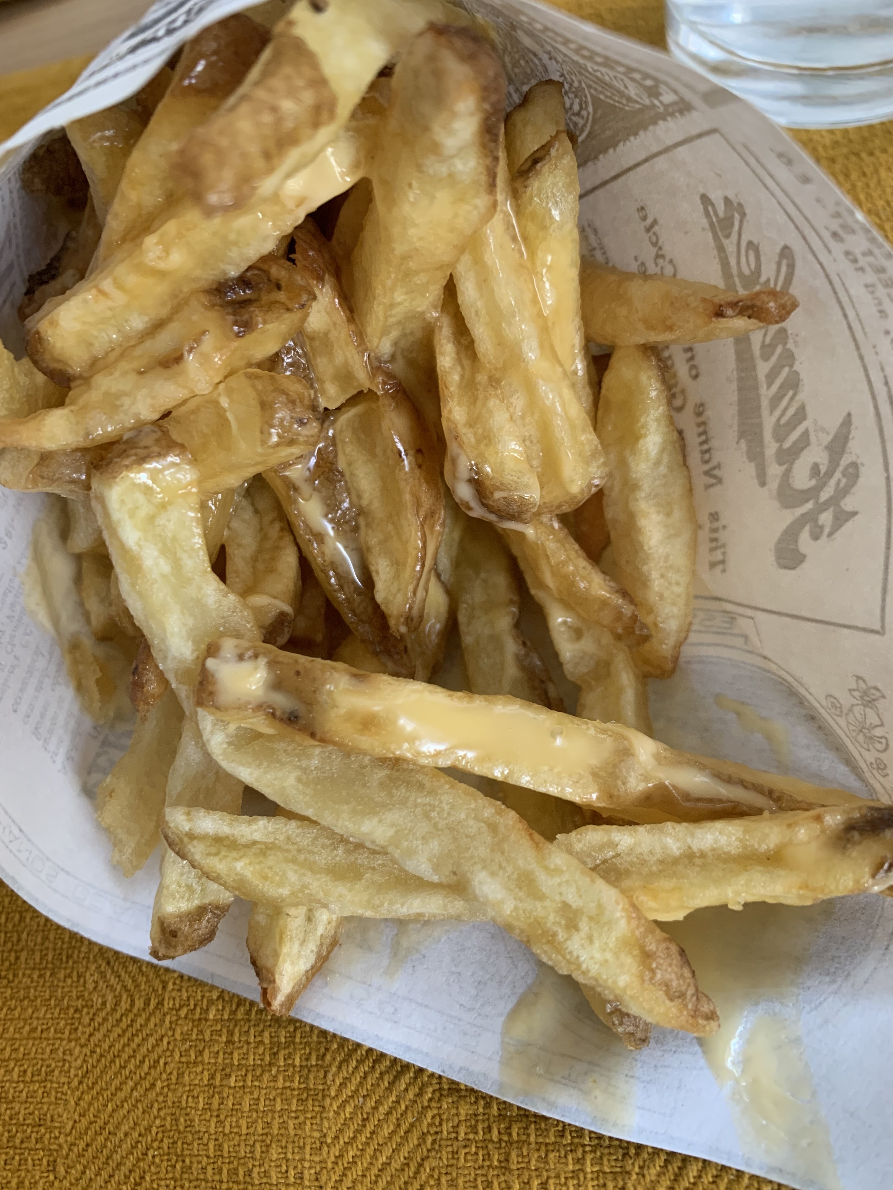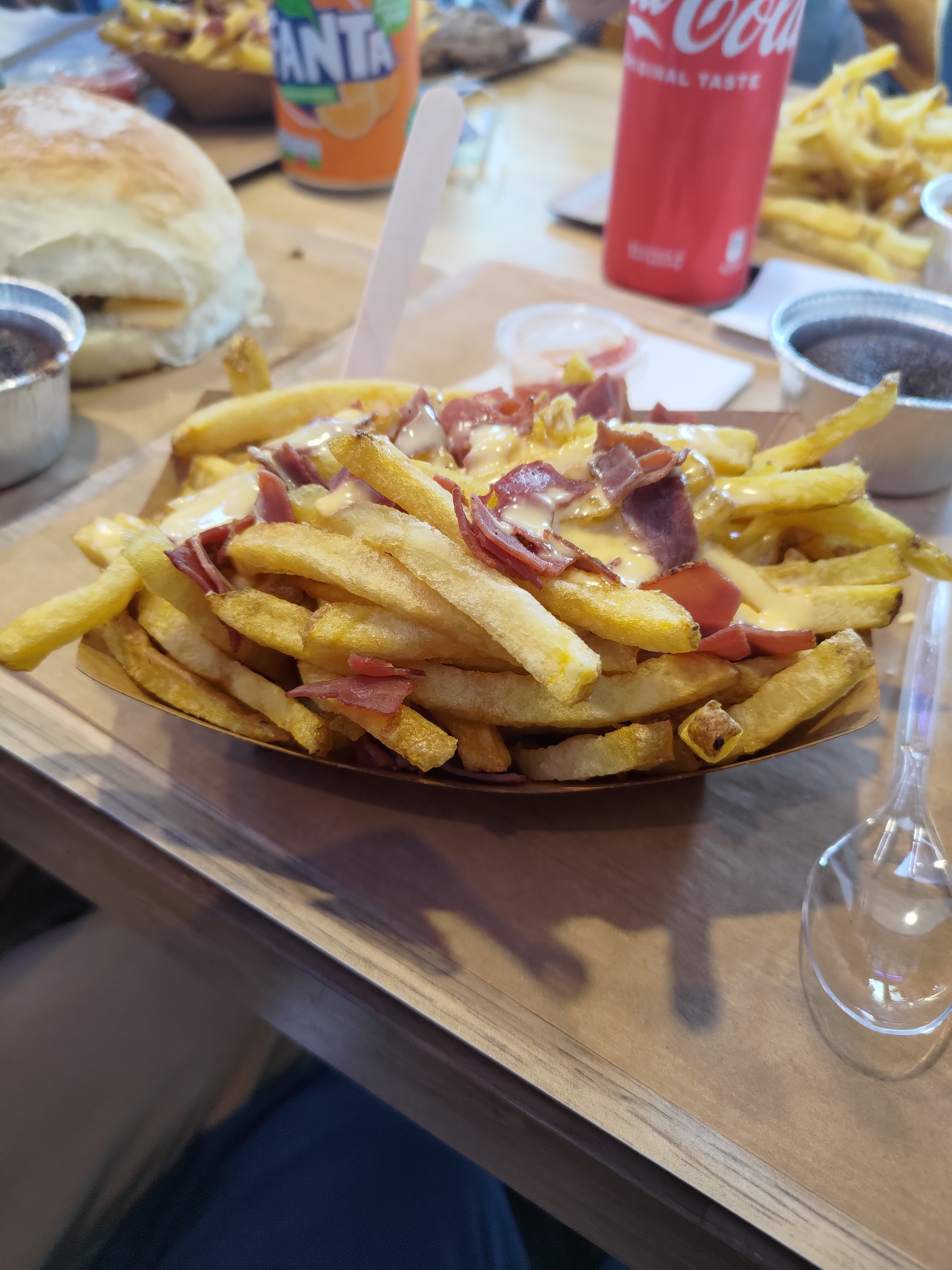 Le burger et les frites étaient ok mais vraiment pas pratique à manger avec les mains. Le problème est la sauce au fromage qui est hyper liquide et on en met partout. Il faudrait soit un emballage autour du burger soit rendre la sauce moins liquide.