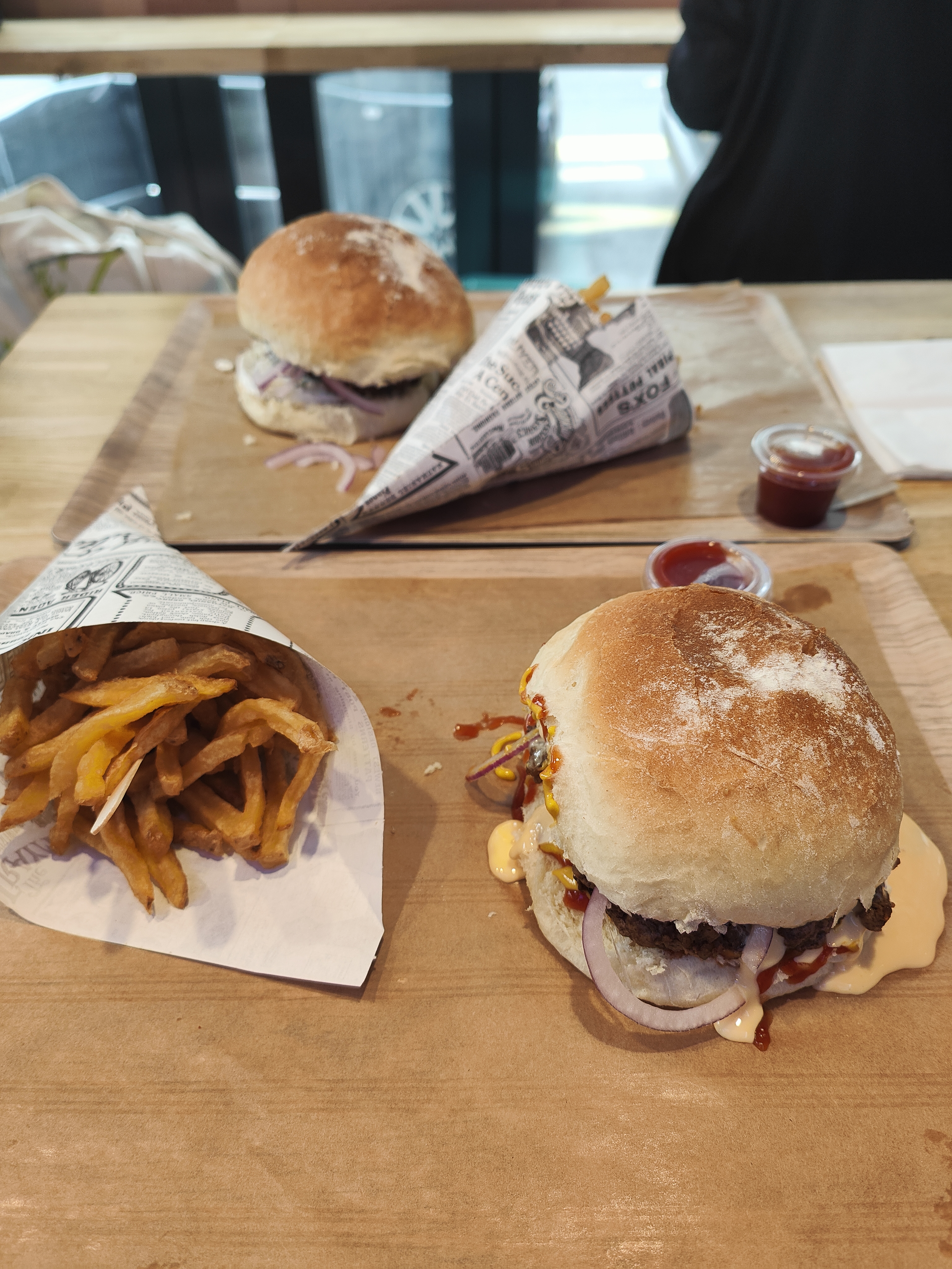 Très bon (cheddar et frites folles) mais burger pas si pas cher que ça ~5€ avec la viande donc le prix de 3€30 n’est pas vraiment très respecté car bon.. le burger au sauce et au légume sans rien c’est pas très ouf