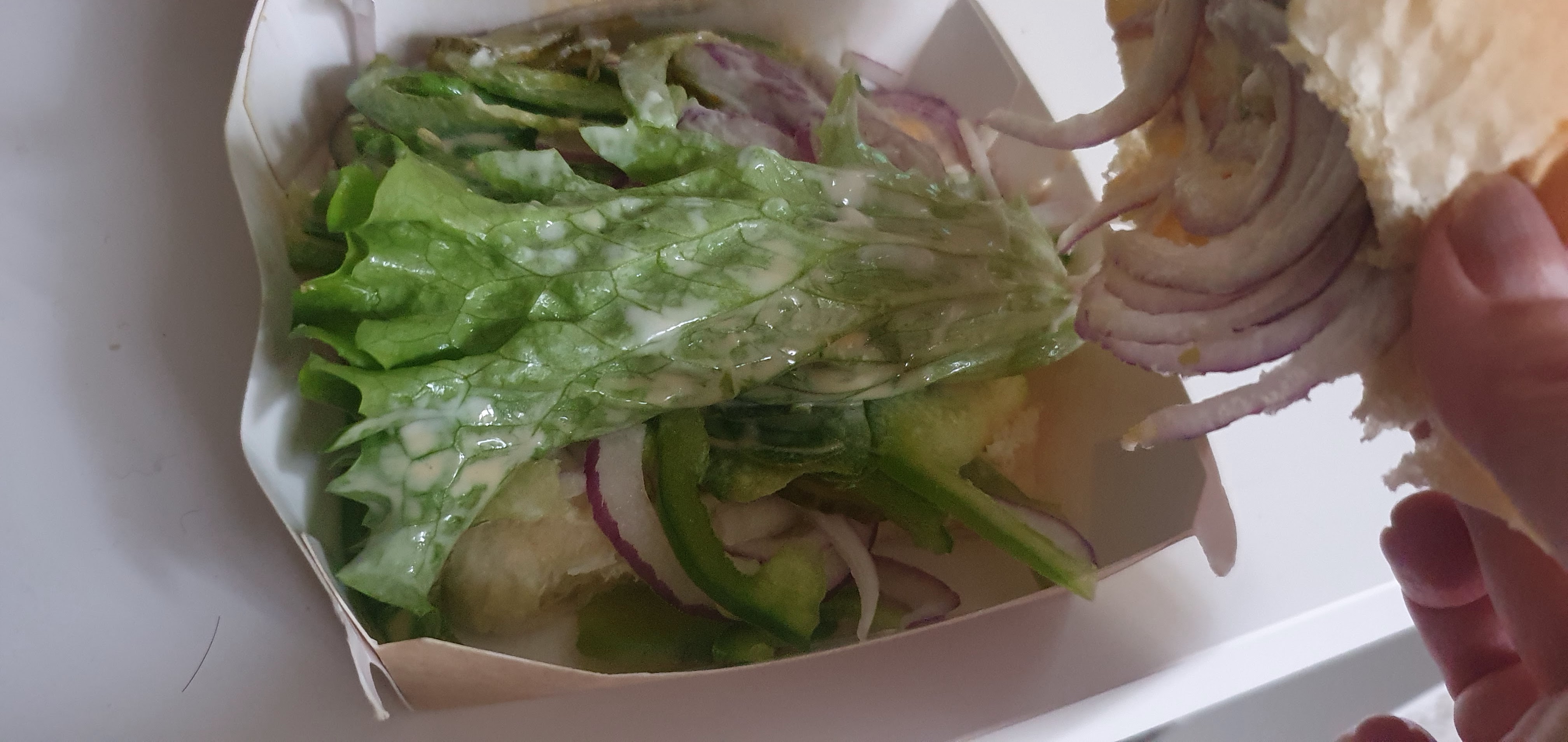Burger « veggie » dans lequel le steack est remplacé par salade tomate oignon, j’ai bien le seum, heureusement que c’est pas cher