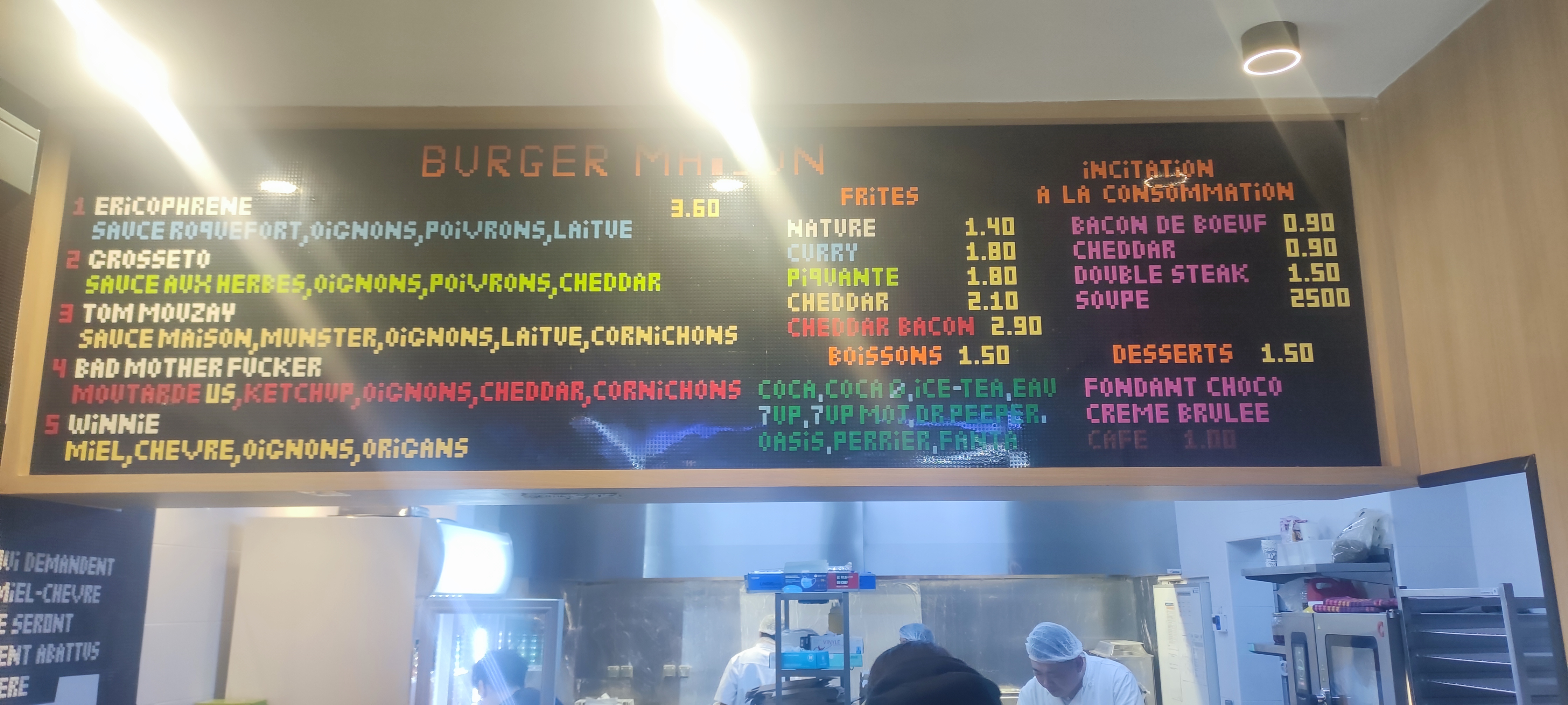 Très bonne adresse pour déguster des burgers vraiment pas chers et de très bonne qualité ! La décoration est très sympa, à base d'Undertale et Lego J'ai testé le Bad MF, pain de très bonne qualité, viande plutôt bonne, et bien généreux, comme on aime ! Les frites, pas grand chose à dire dessus, bonne qualité. La sauce ketchup est industrielle ça c'est dommage, et pas de mayonnaise :( Le fondant au chocolat est maîtrisé, c'était très bon compte tenu du prix ! J'en reprendrai un à chaque fois que je viendrai :); Je recommande et reviendrai !
