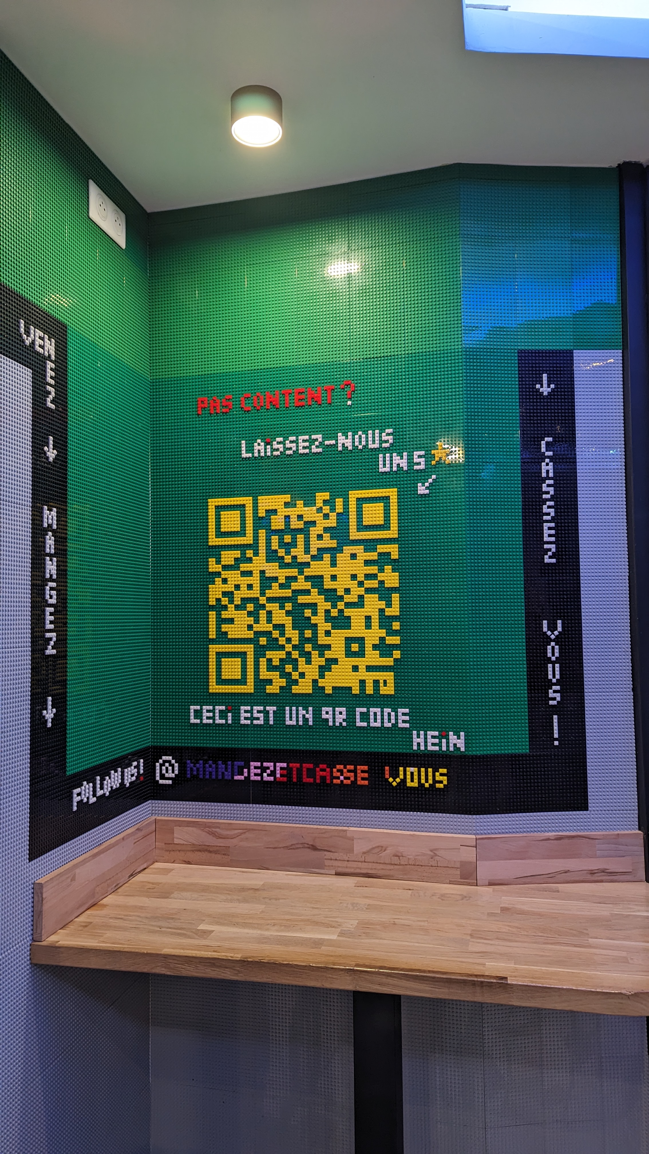 Restaurant qui fait le job. On y va pour un burger, on a un bon burger pour pas cher. La déco à base de Space invaders, lego .. est plutôt sympa. Concernant le service et l’ambiance tout est résumé dans le nom du resto : j’ajouterai juste « mangez BON et cassez vous. »
