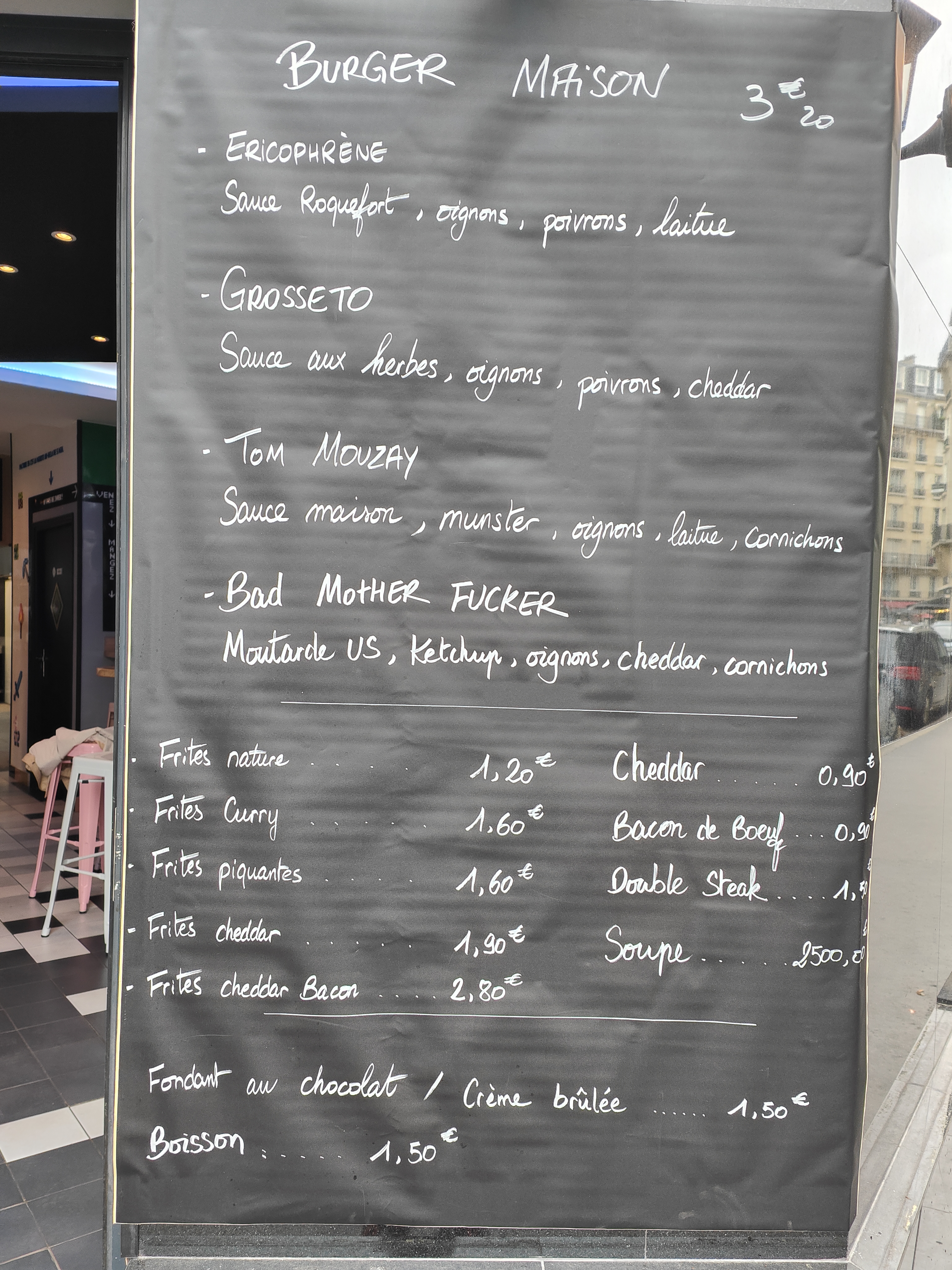 Unique à Paris et ailleurs. 6.5 euros le menu hamburger maison frites maison incroyable mais vrai. Personnel agréable, lieu sympa. A découvrir.