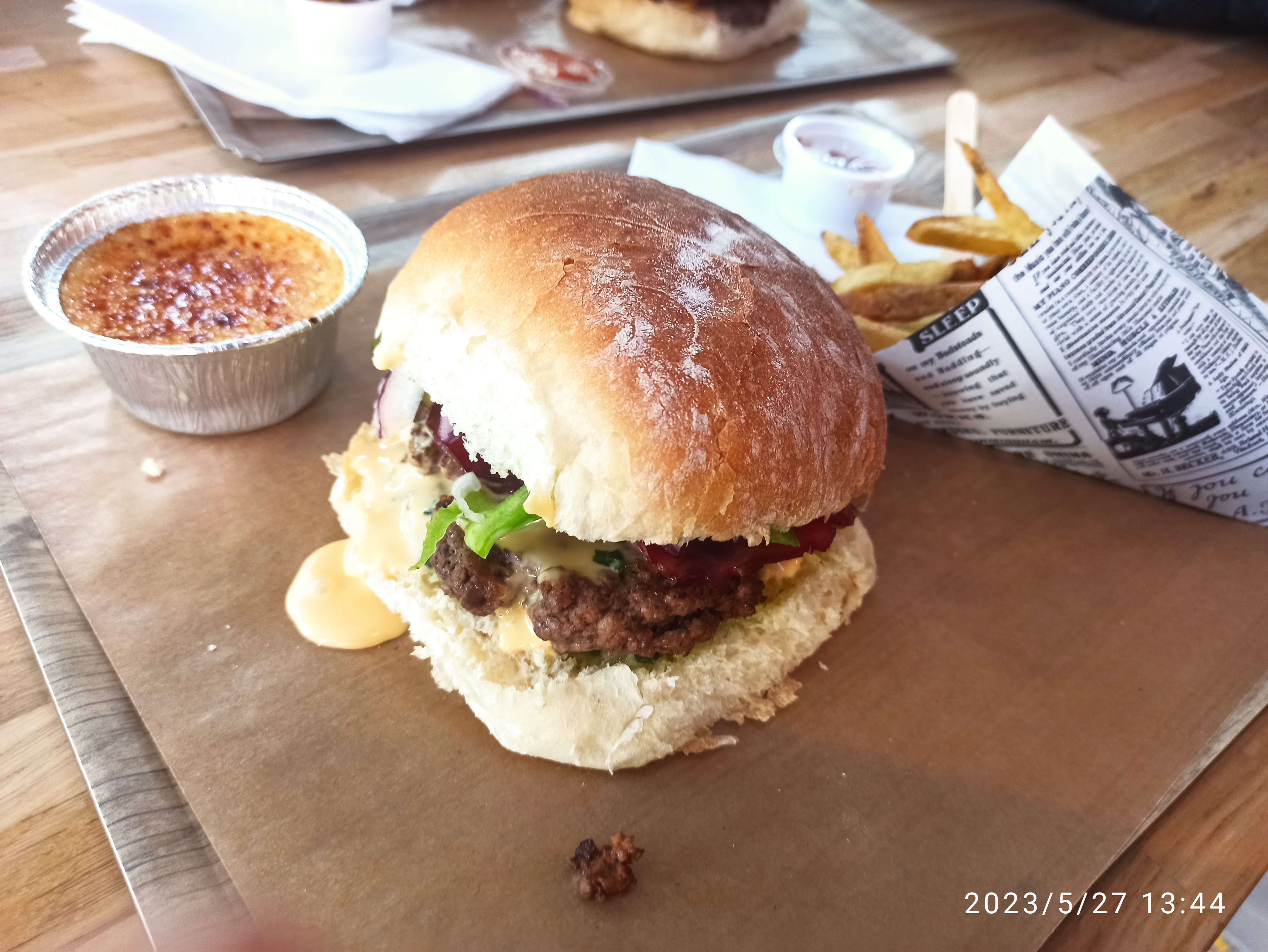 Très bon du bon burger brut frites maison avec cheddar bonnes aussi 1 peu grasse mais on aime ça ! Service agréable et rapide, La déco décalée est cool Crème brûlée maison très bonne aussi