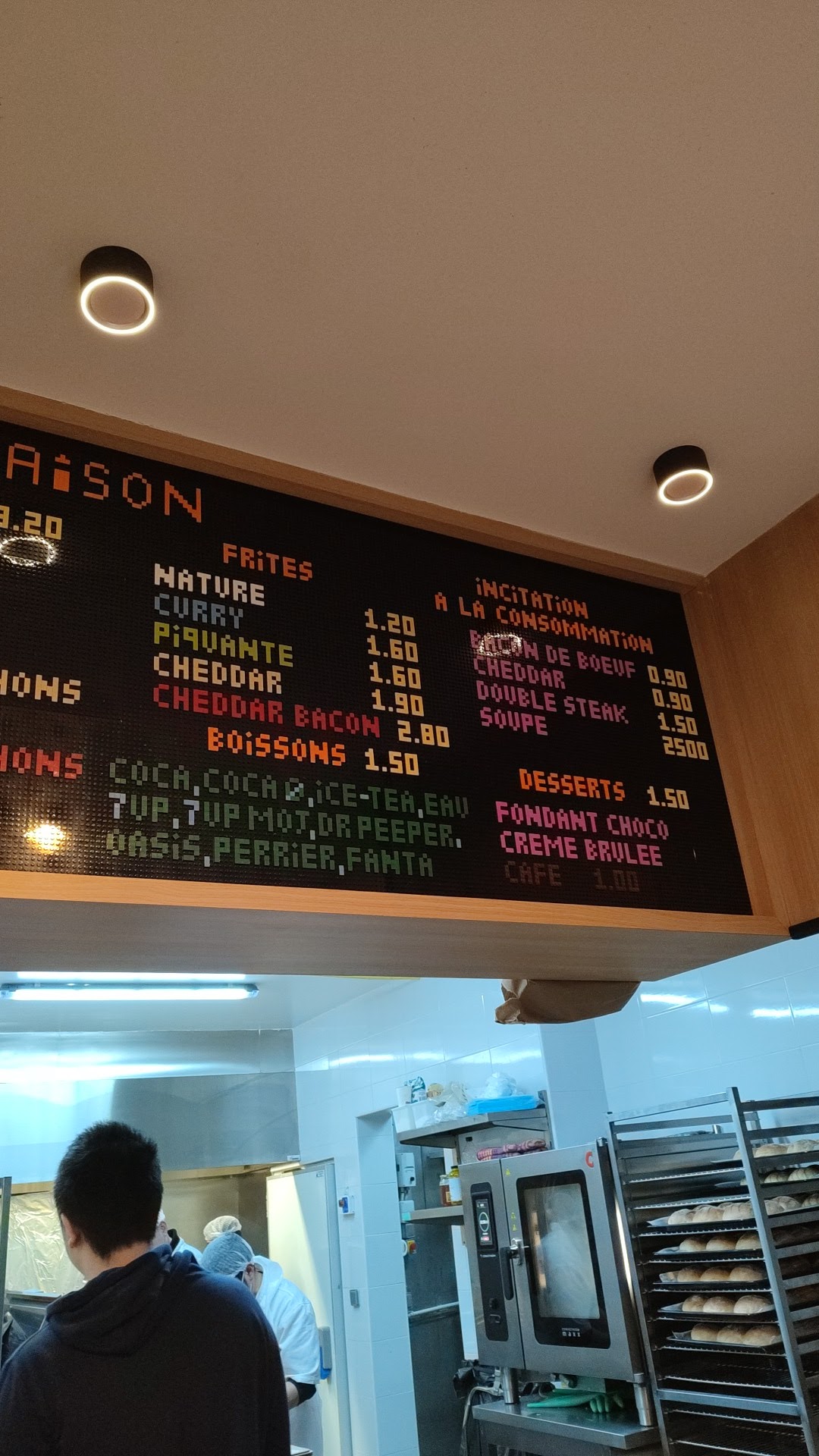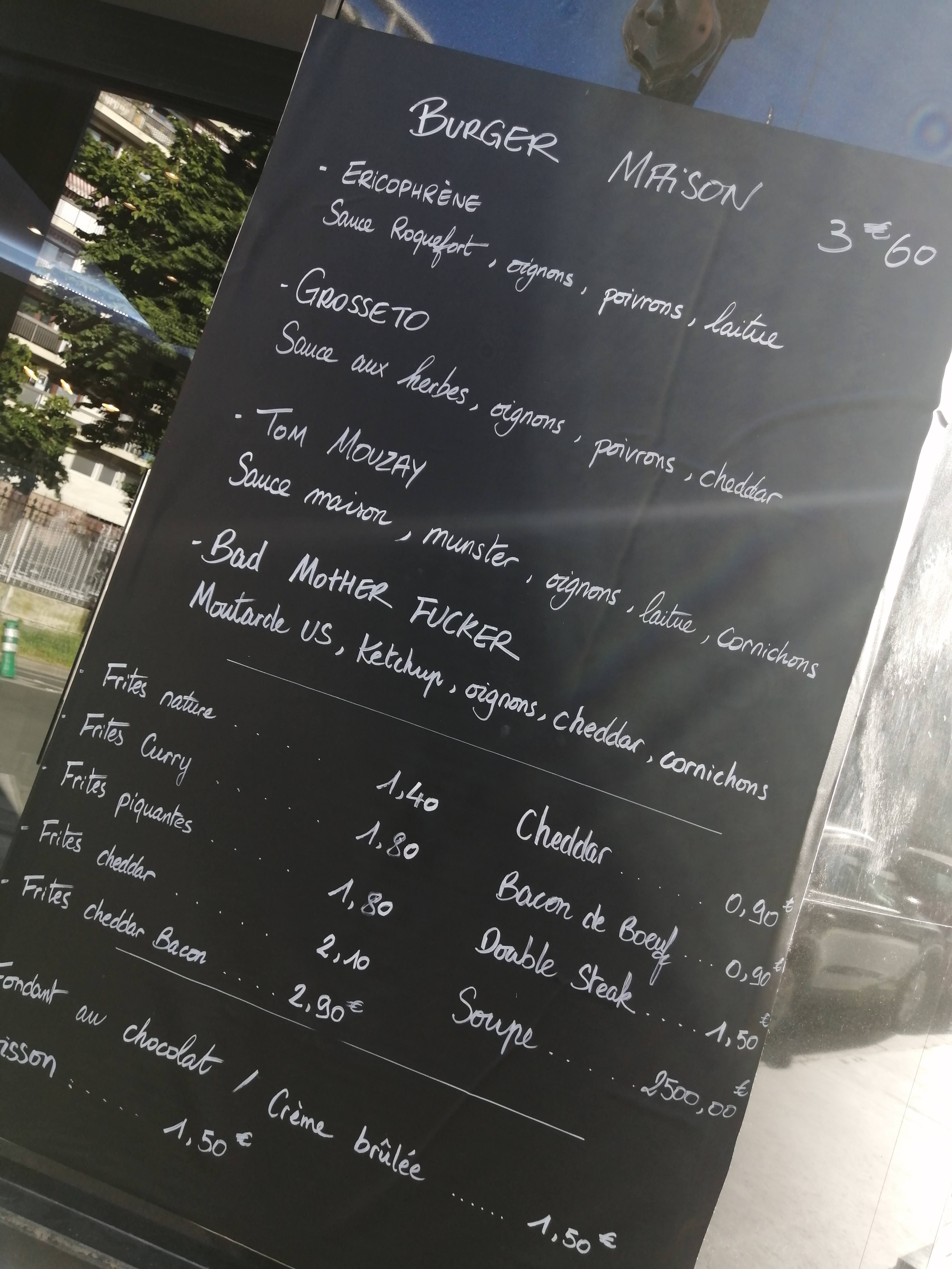 Agréablement surprise! Le burger a 3,60, le corner de frites à 1,60€, prix très attractifs et qualité au rendez vous. Le pain, le steak et les frites sont faits maison (si rare de nos jours). Les ingrédients sont frais (poivrons, tomates…) je recommande !!!