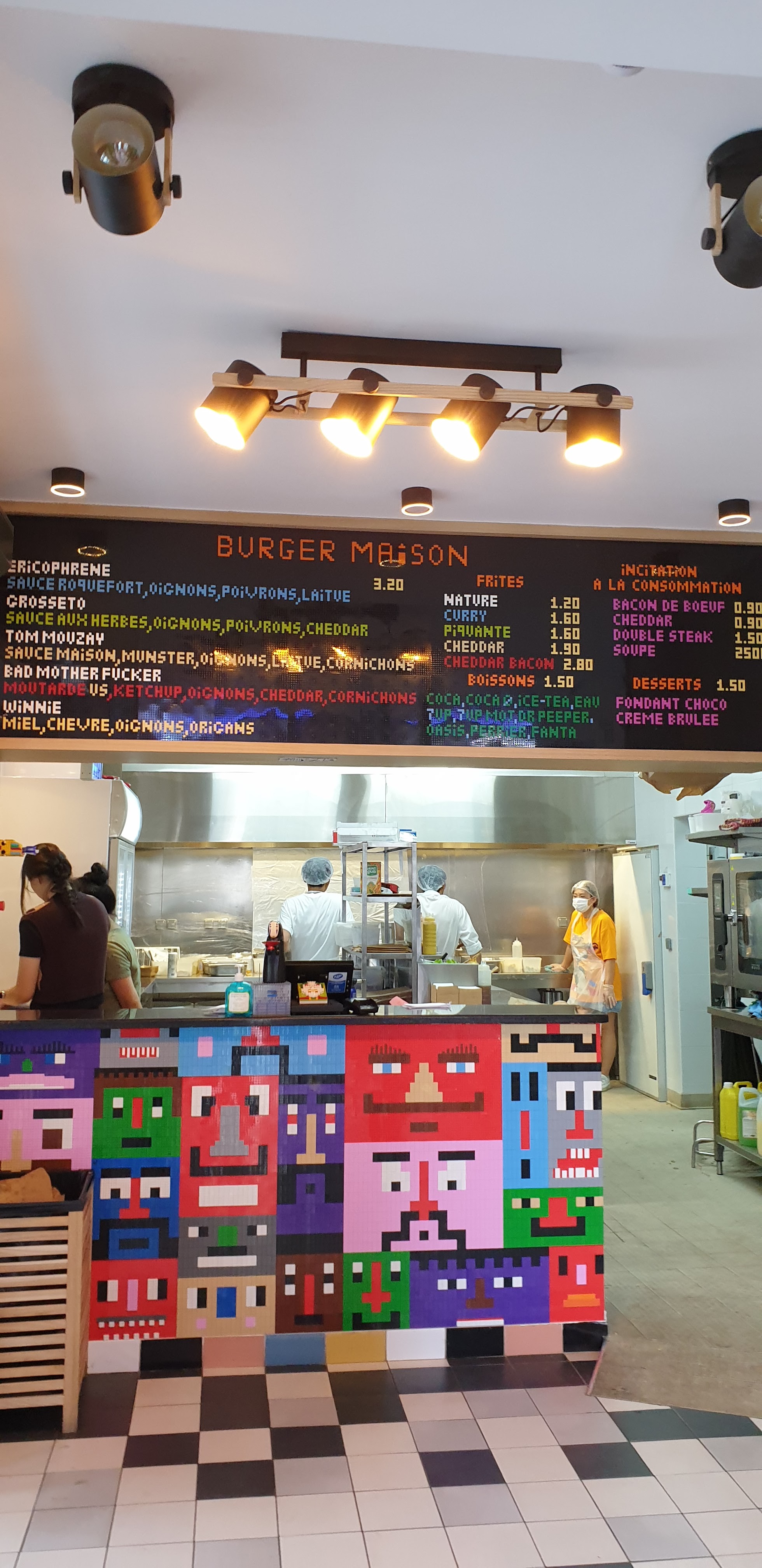 Burger maison à 3.60€, frites à 1€40 et boisson à 1€50 ! Pour 6.5€ vous avez un menu complet bien meilleur que dans la plupart des fast good ! Un peu de monde à l'arrivée mais ça défile rapidement :) Et Une déco sympa avec des legos !! Une adresse à tester !