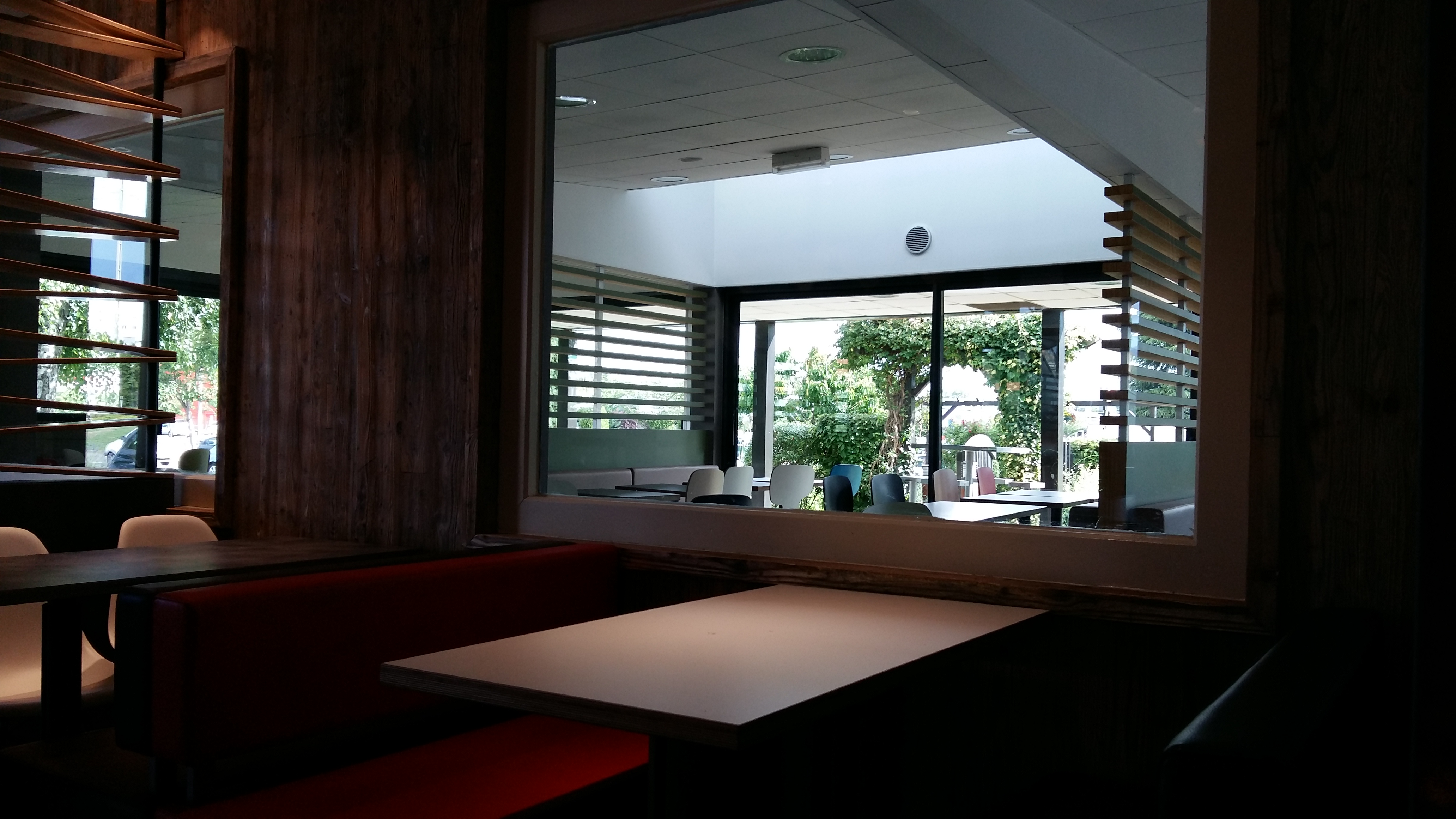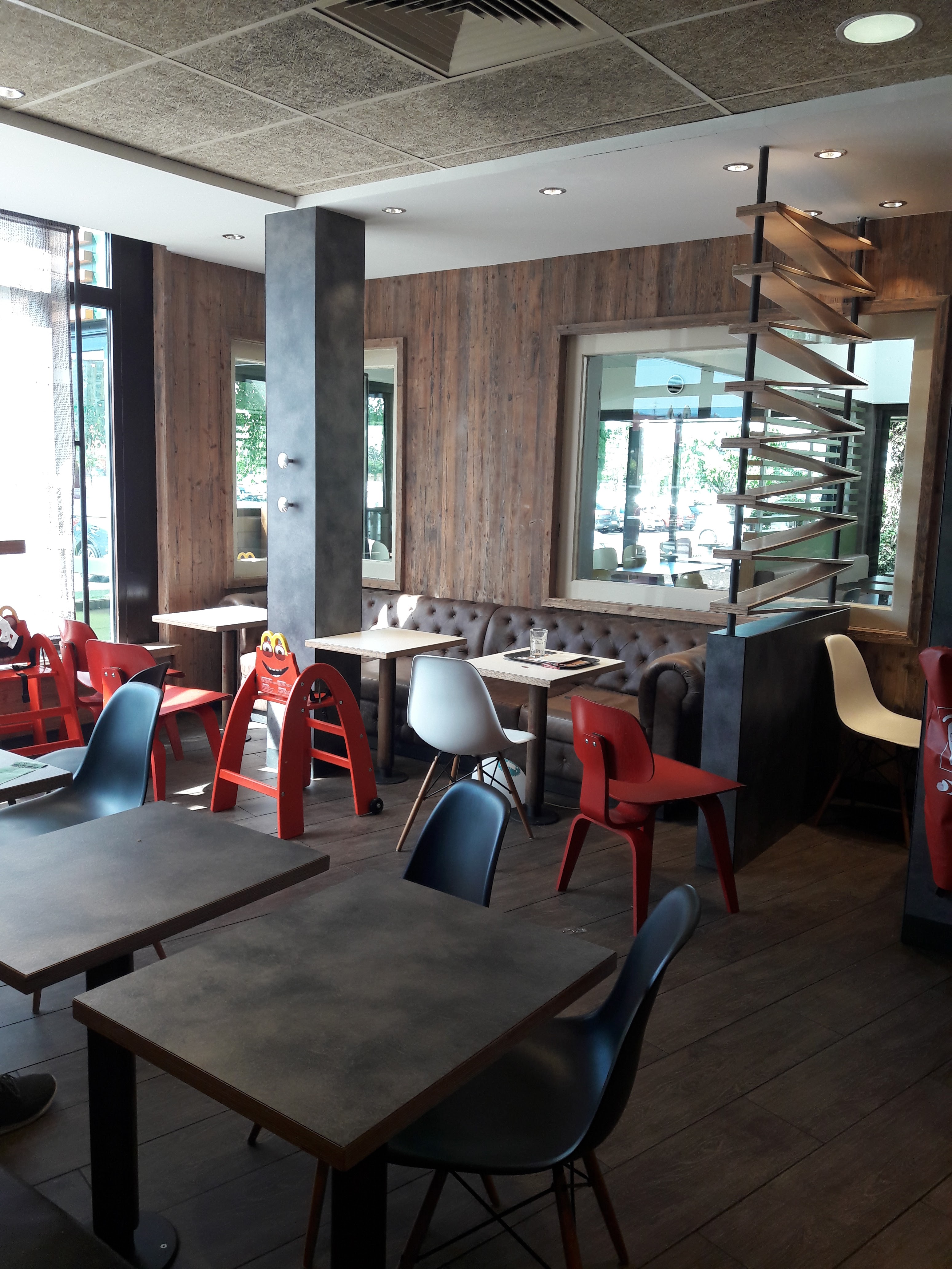 Grand, extérieur sympa et intérieur très tendance. Personnel agréable. Pour les enfants, une pièce complètement dédiée à l'étage mais avec accès par l'extérieur. Bornes de commandes très accessibles. Service assez rapide.