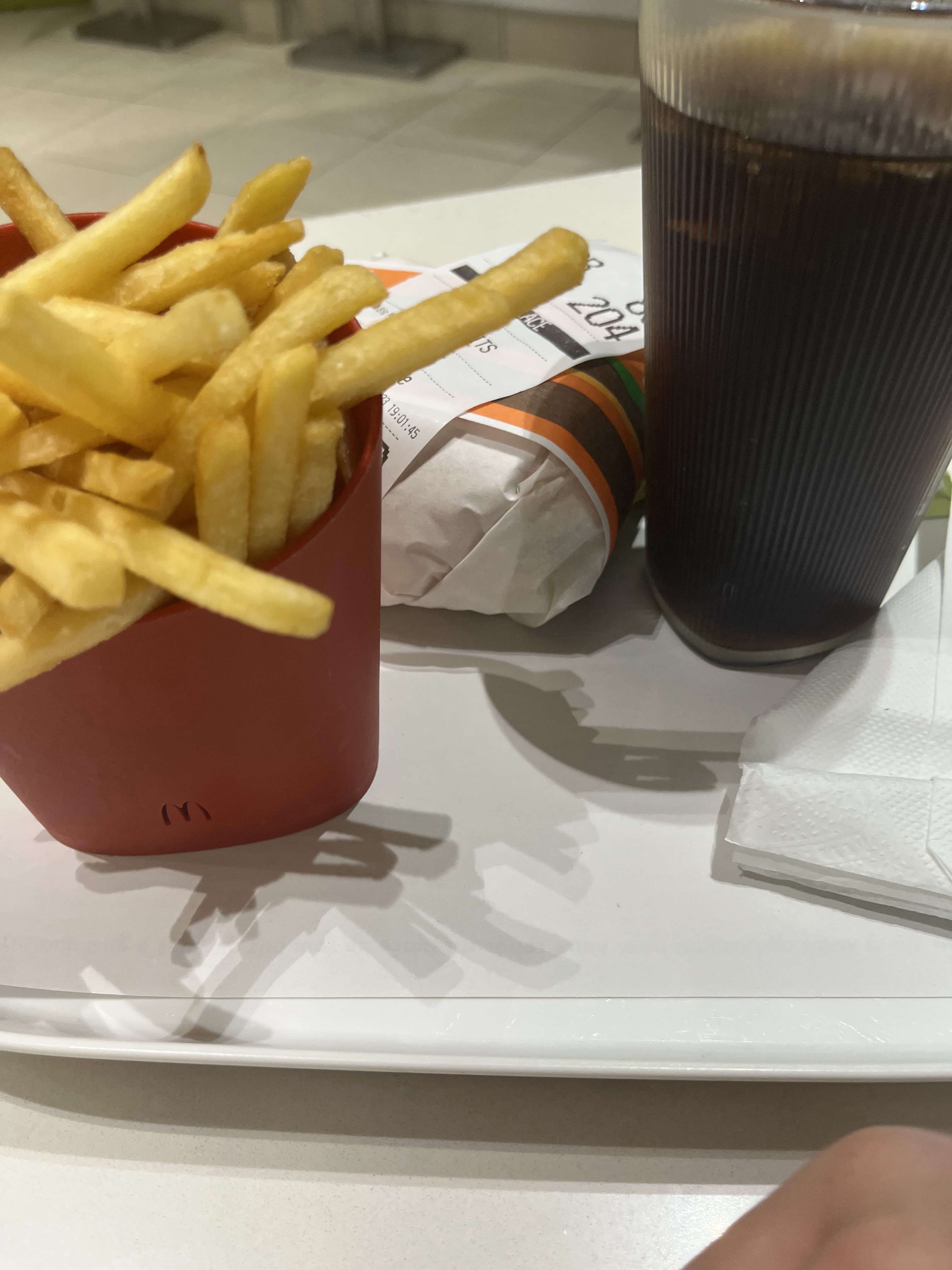 Franchement 000 on est mal servis je paie un menu a 6€ pour avoir des fritte de menu enfant on me sert 3 plateau sans sopalin je recommande un hamburger on me sert 10 sopalin franchement je reviendrai plus dans ce MacDo
