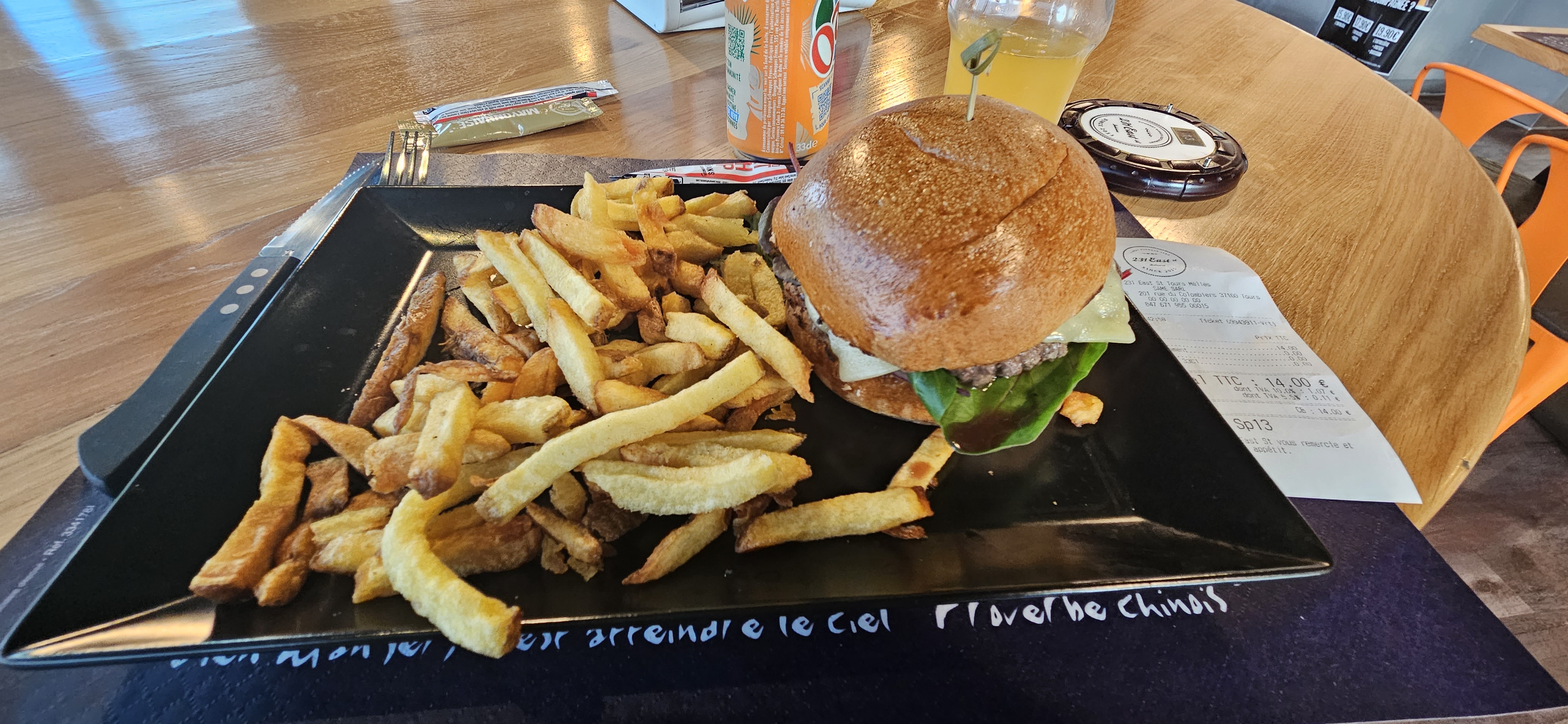 Lieu propre serveur très gentil serviable souriant même un qui courer pour servir tout le monde et les burgers excellent frites maison très bonne , je confirme pas les critiques d autres clients qui exagèrent vraiment.