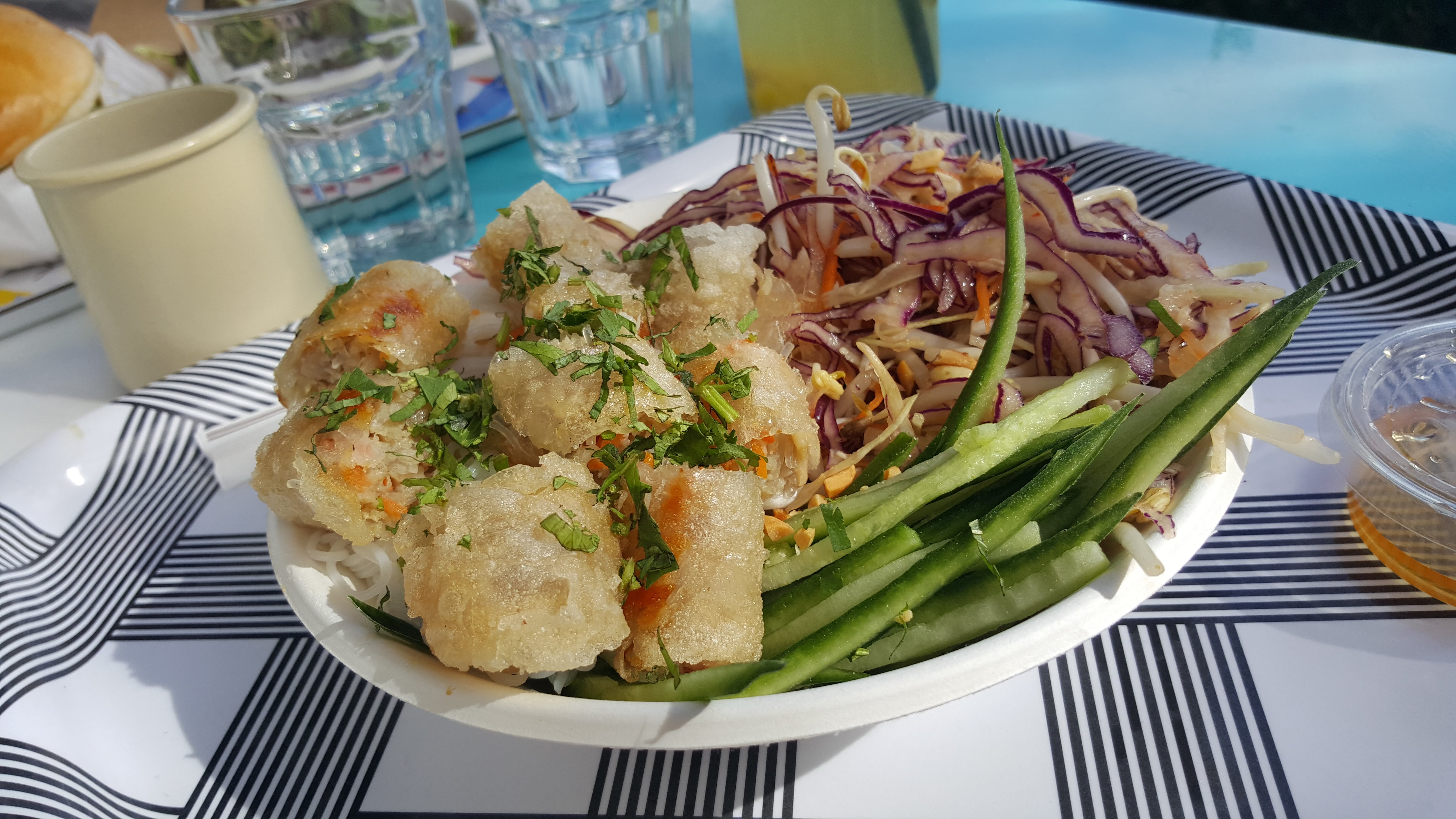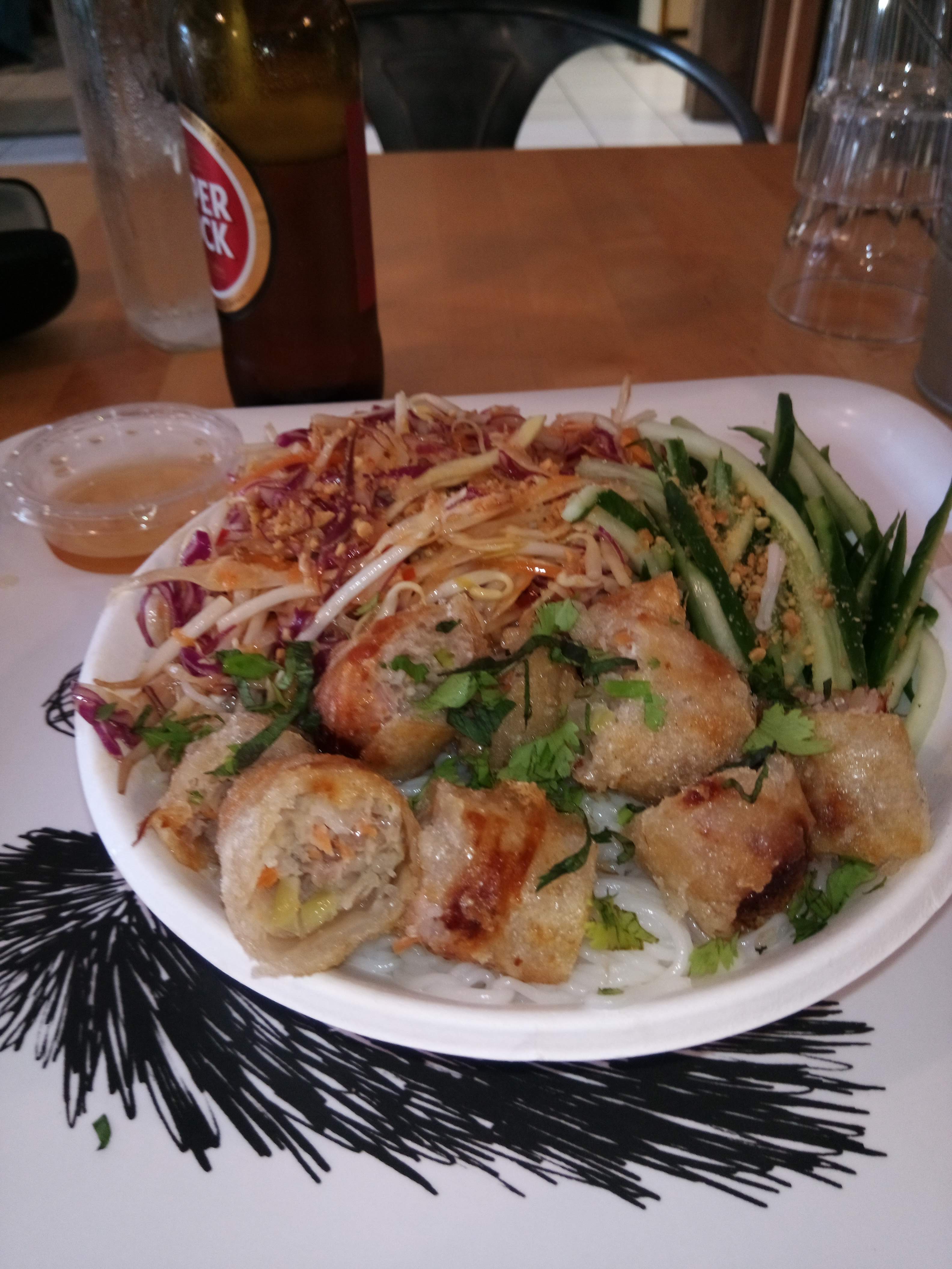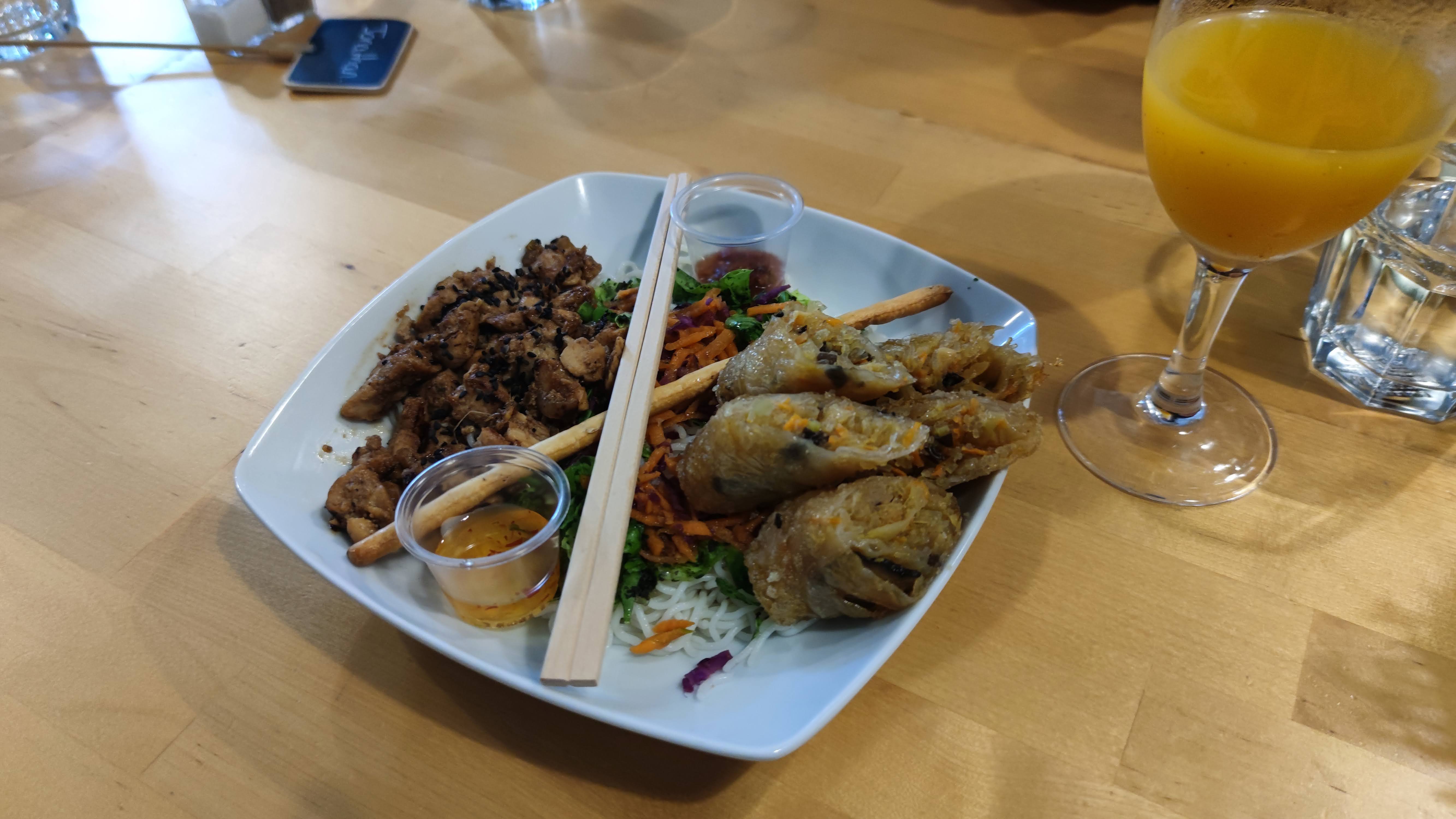 Excellente salade O Quan aux saveurs asiatiques avec des morceaux de nems croustillants.