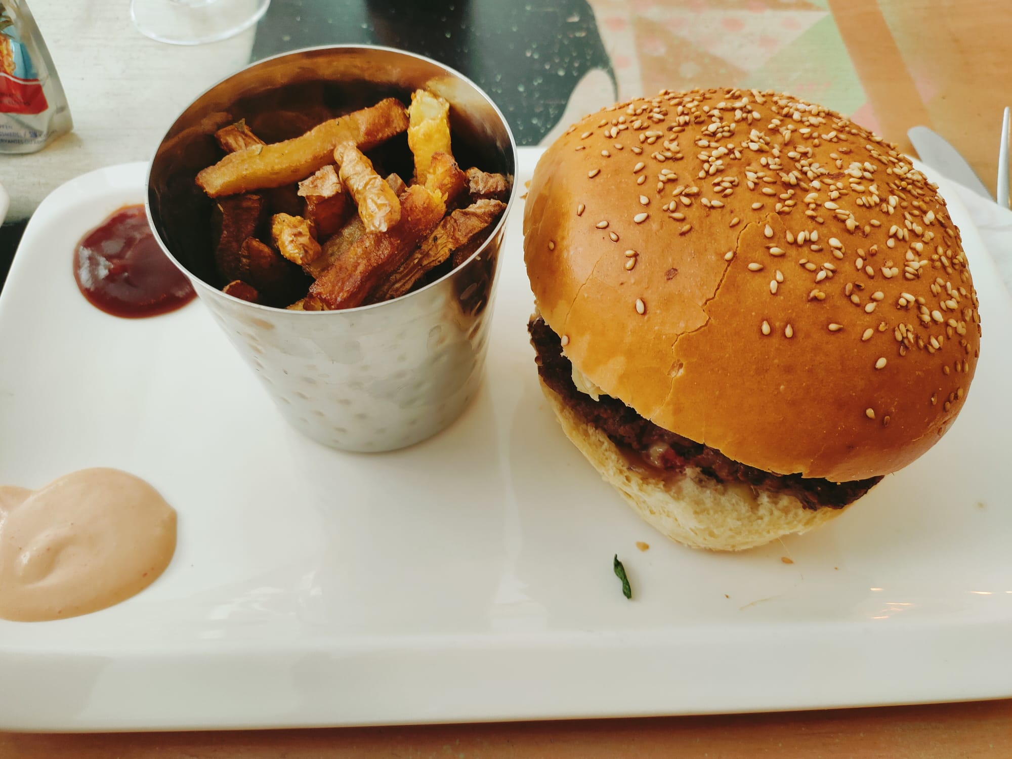 Très bon burger et bon accueil mais salle pour manger inadapté pour personnes avec poussette et le mobilier n’est pas adapté à la pièce sentiment d’être à l’étroit et odeur désagréable…