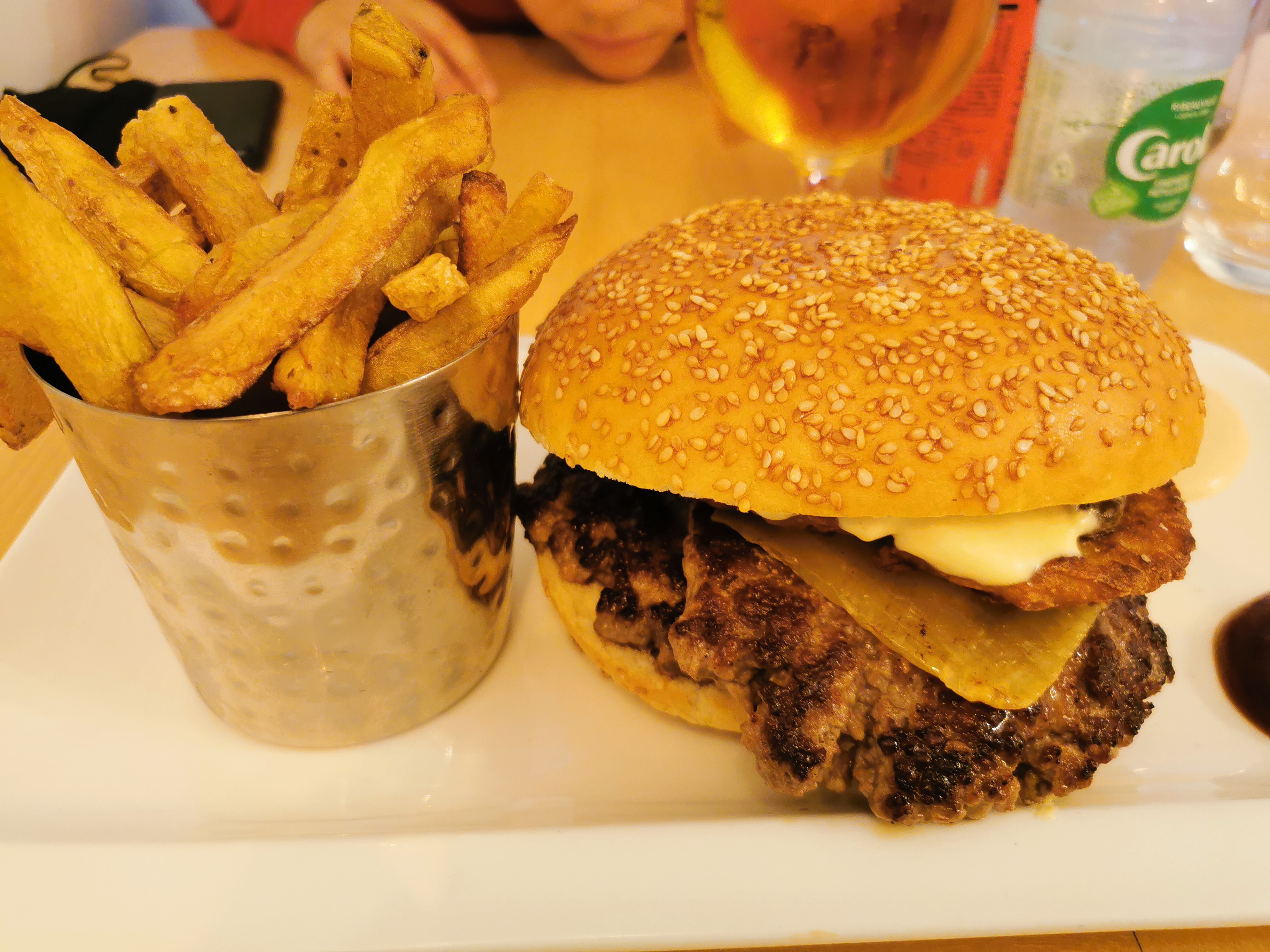 Un double burger à tomber , le pain au top la cuisson de la viande respectée. Le munster frit délicieux. Les frites un peu molles sûrement au fait de la livraison. Je recommande.