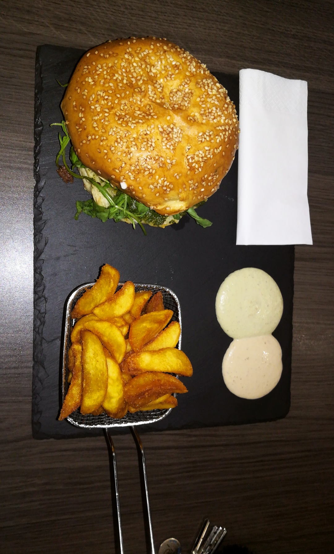 Pris en livraison par le site Web du restaurant tres bien fait et agréablea utiliser. Commande à 15h pour 19h30 ,arrivée froid à 20h00. Les frites sont cabossées. La viande est bonne mais le reste ... trop de pain à mon Goût. Et la cuisson demandée n'a pas été respecté.