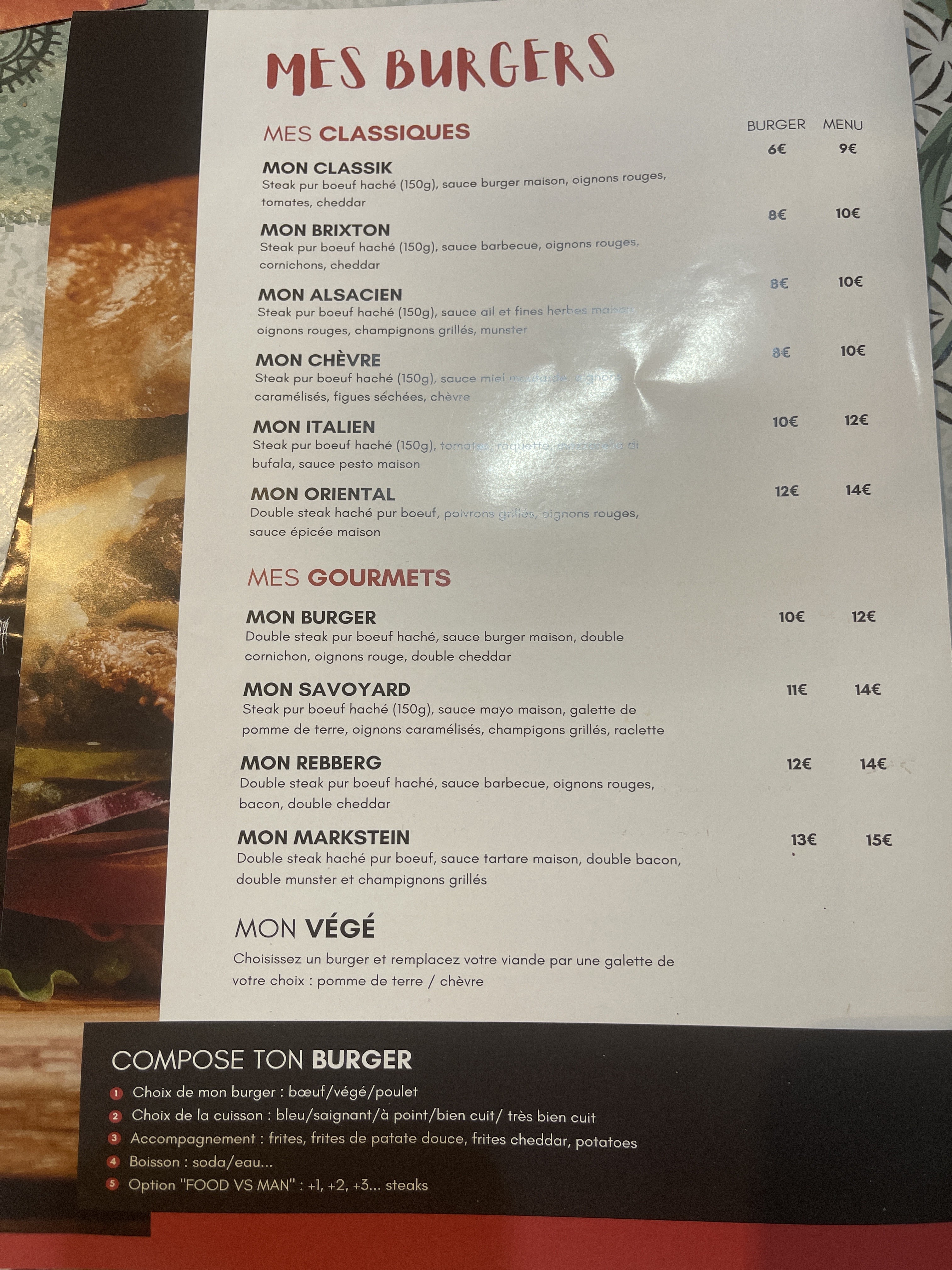 Burgers fades et insipides. Steak spongieux rempli d'eau, fromage sans goût (on cherche le munster et le reblochon), oignons caramélisés (ils sont juste tout blanc et plein d'eau aucun assaisonnement). Le pain est bon ainsi que les frites de patates douces. Tiramisu c'est juste de la crème fouettée sans goût, rien à voir avec un tiramisu.