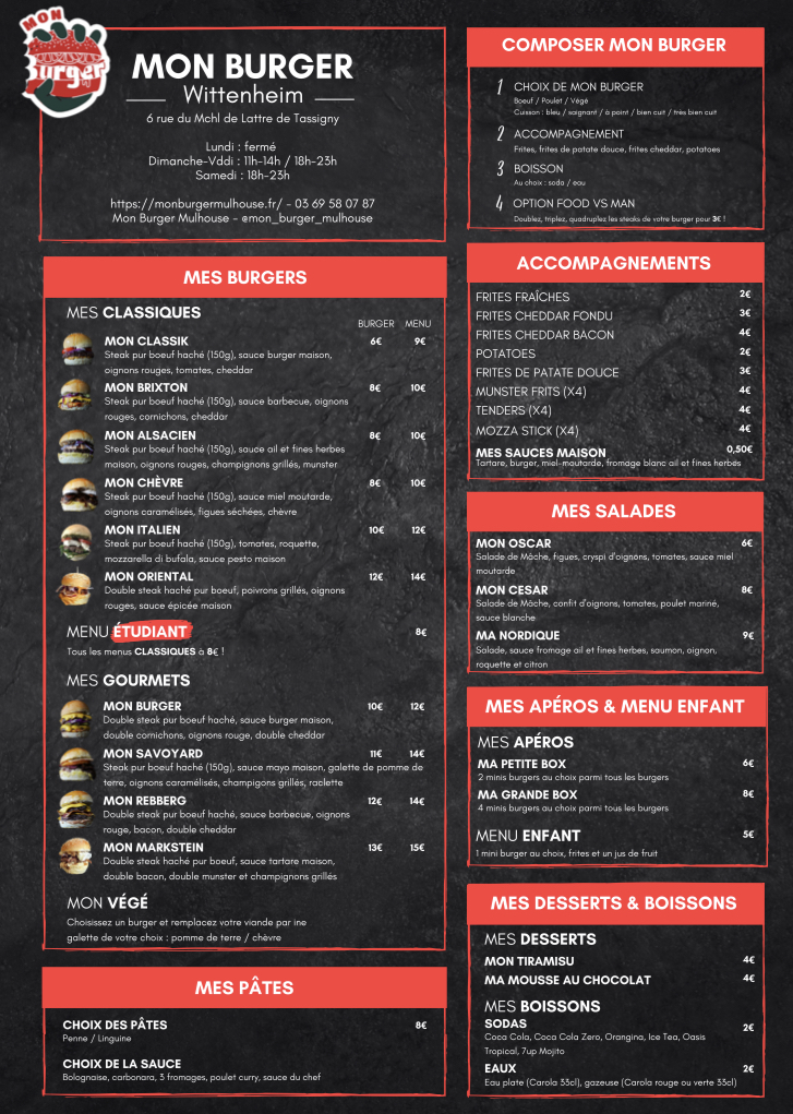 Une première pour nous chez Mon burger, nous avons commandé sur uber eats et retiré la commande. Commande préparée à l'heure, personnel super sympa. Nous avons commandé 4 menus burger klassic et franchement pas déçus. Portion généreuse, ingrédients frais, pain maison, steak pur boeuf, sauce maison, nous nous sommes régalés. Je vous le conseille, bien mieux que les burgers de grande chaîne alimentaire et pas plus chers.