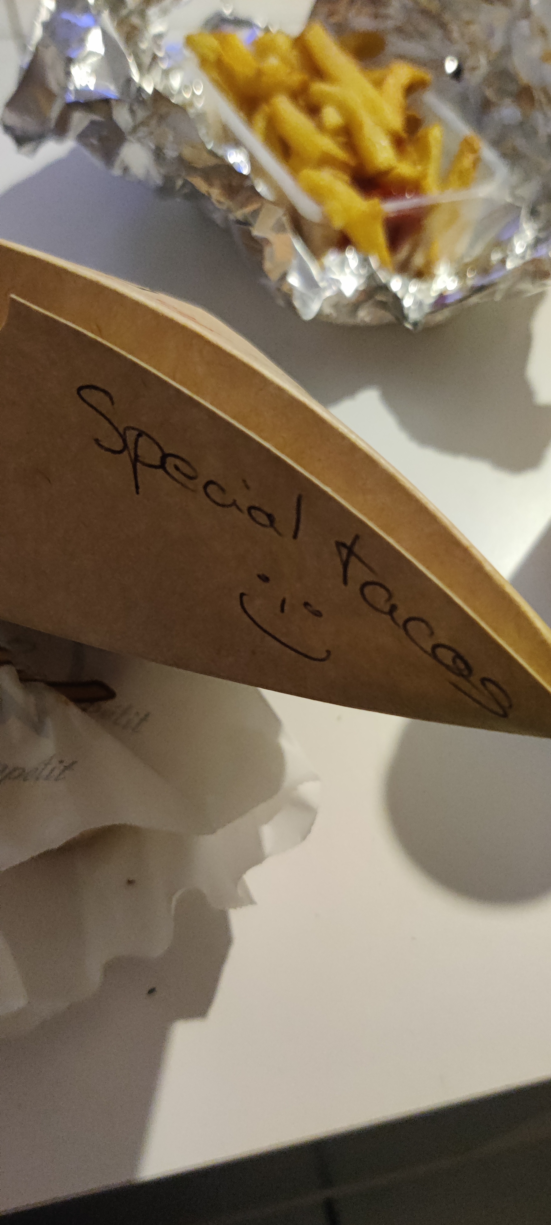 Nous somme venus pour deux tacos et ils sont super bon servit avec des frites maison, le top nous sommes super content