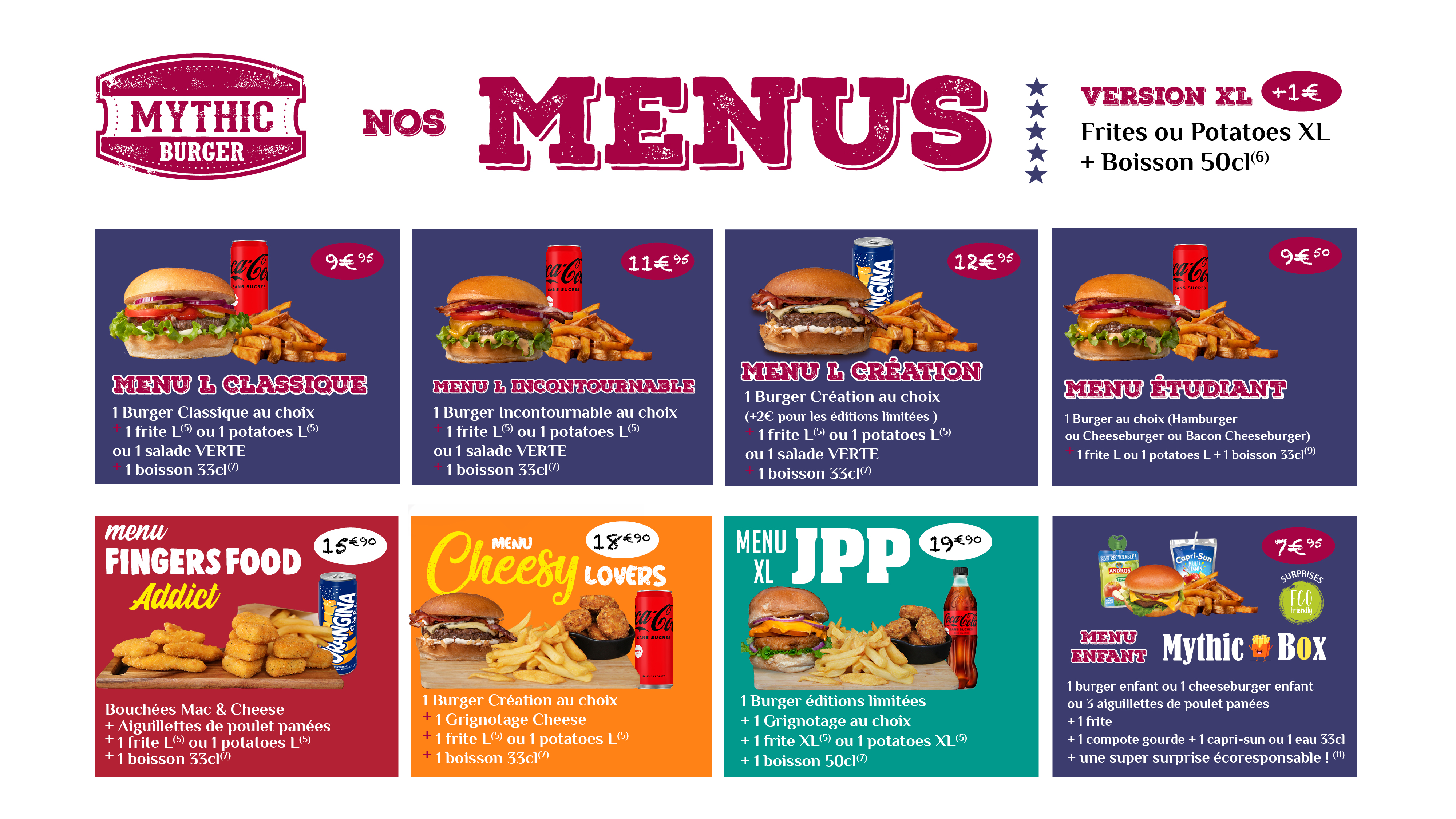 3 menu 41 euro .... hamburger sec et pas appétissant .... 1 ere et dernière fois que nous commandons .... rien de mythic...