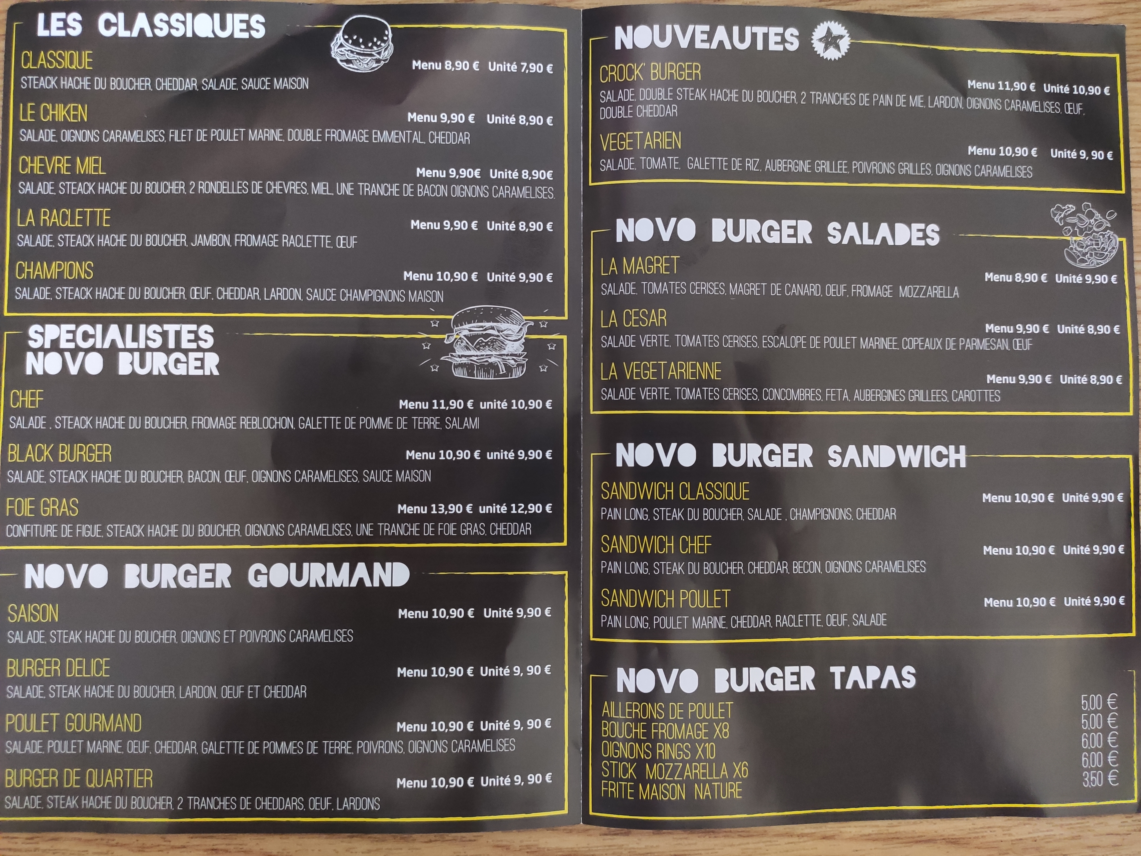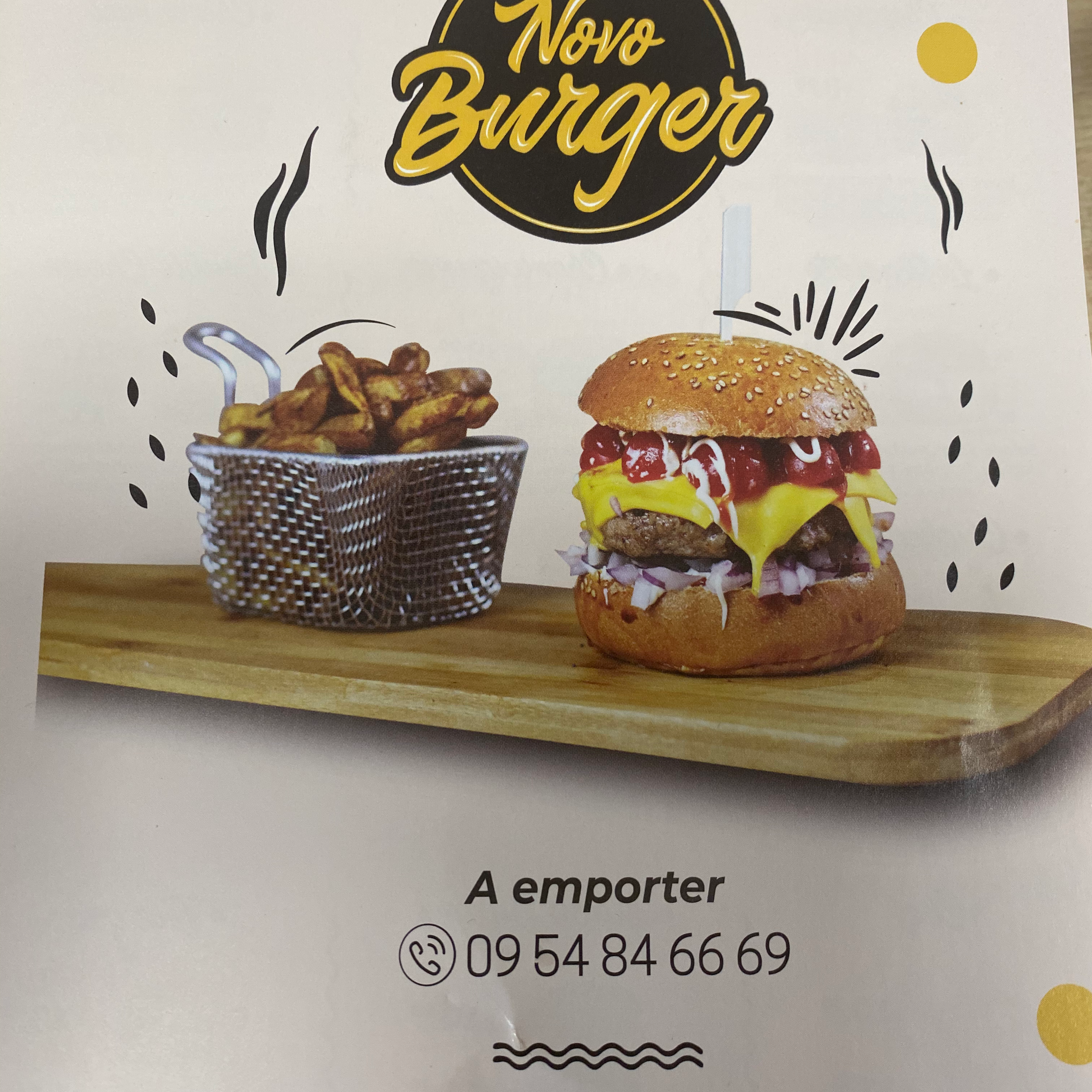 Juste de la bombe merci pour ce delicieux diner !!! premiere fois qu'on y va et pas la derniere on c'est littéralement régalé hamburger super copieux et gouteux frites maison excellentes rapidité de préparation vraiment novo burger vous etes au top à très vite 👋👋