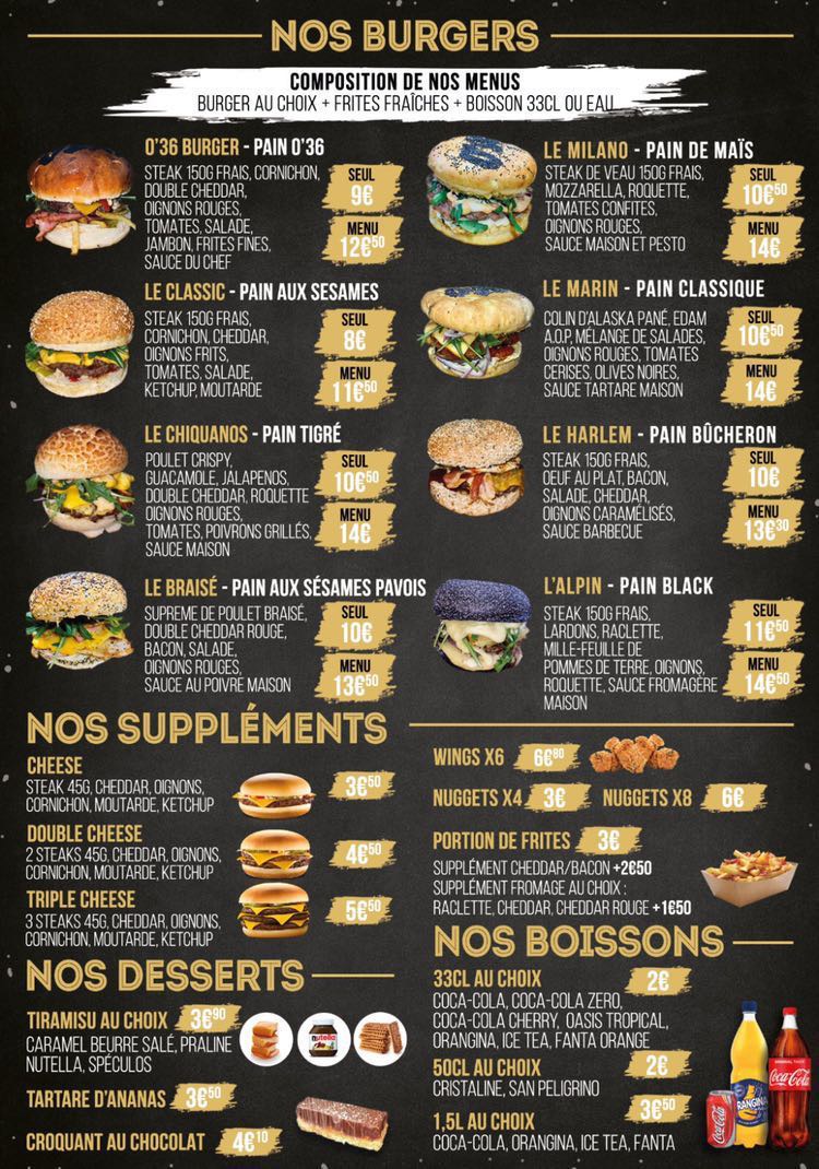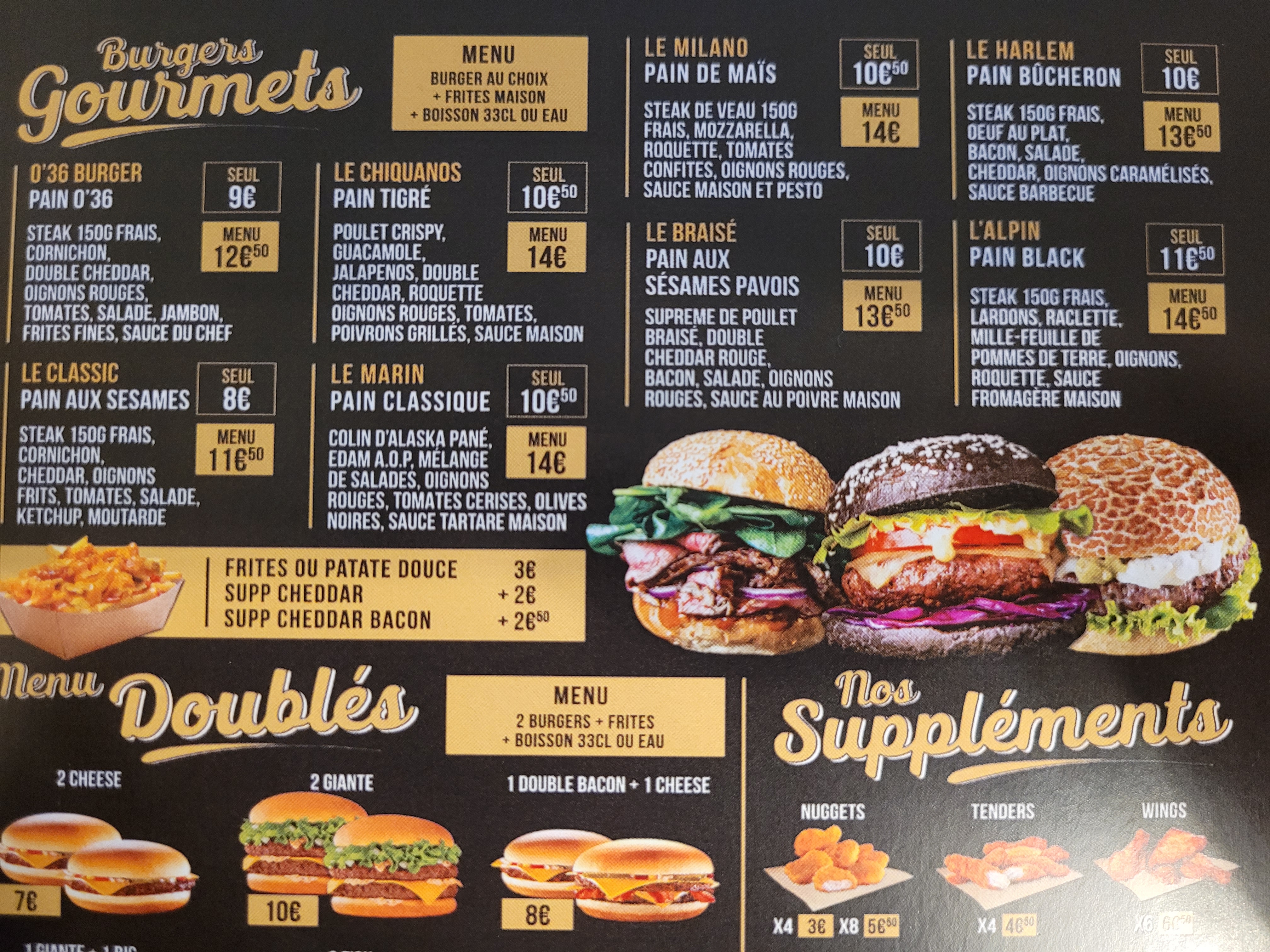 J'ai pris burger o'36 et le Milano ils étaient Excellent , trop trop bon viande et pain de qualité, à recommander sans doute.Merci à vous!!