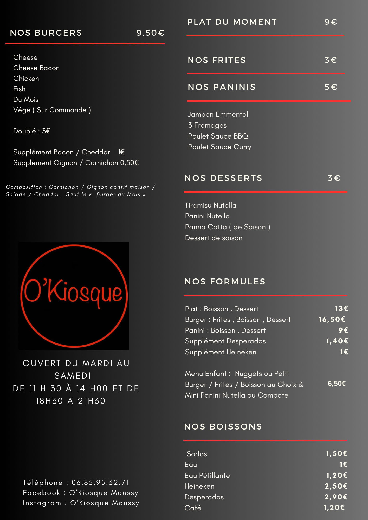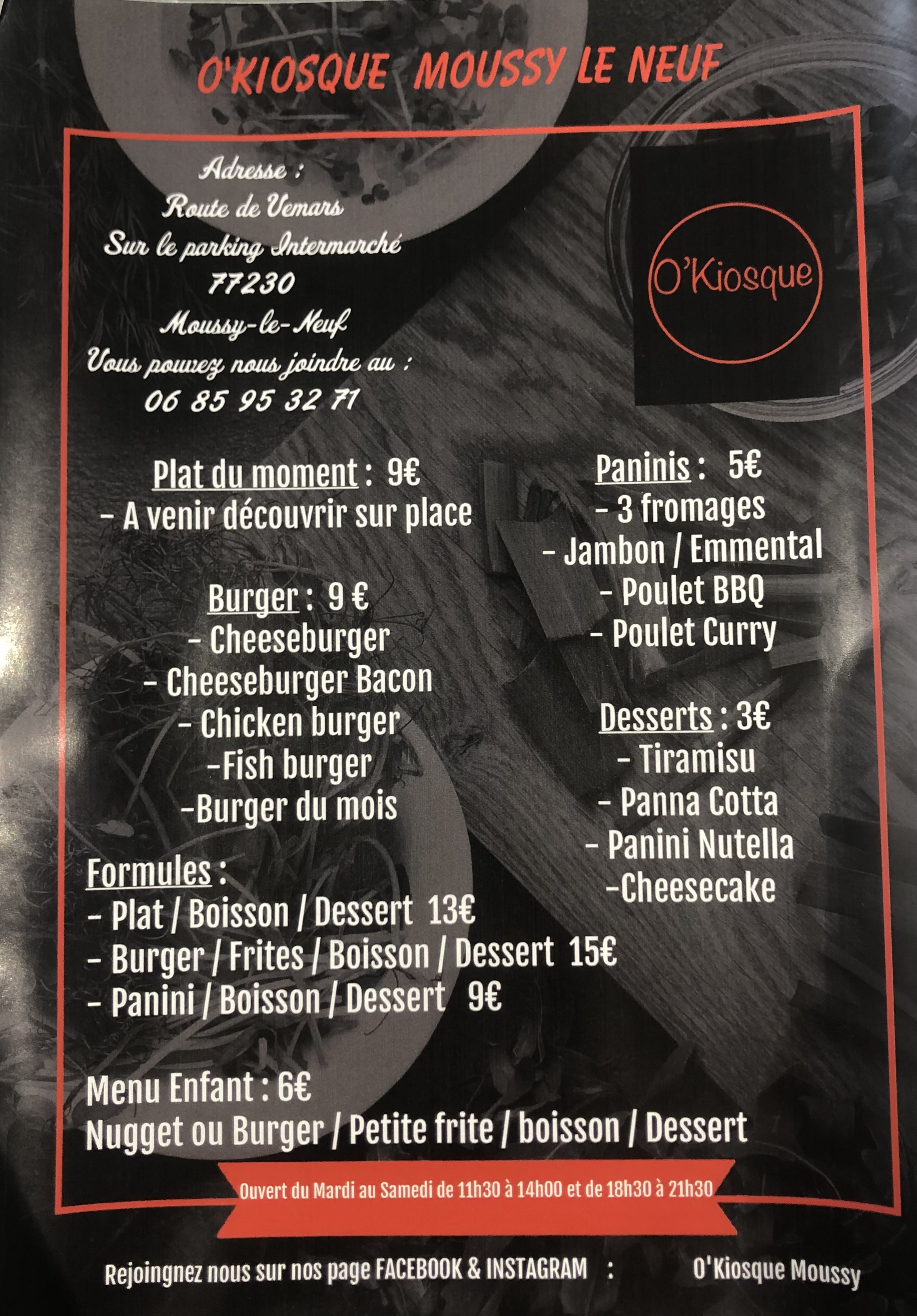 Voici toutes les informations sur le Restaurant de hamburgers O’kiosque qui ce trouve au Rte de Vemars Parking Intermarché, 77230 Moussy-le-Neuf (77). Sur cette fiche vous trouverez les photos, l'adresse, les horaires d'ouverture, le numero de téléphone et les avis clients.Vous pouvez églement rédiger un avis si vous le souhaitez en bas de page.