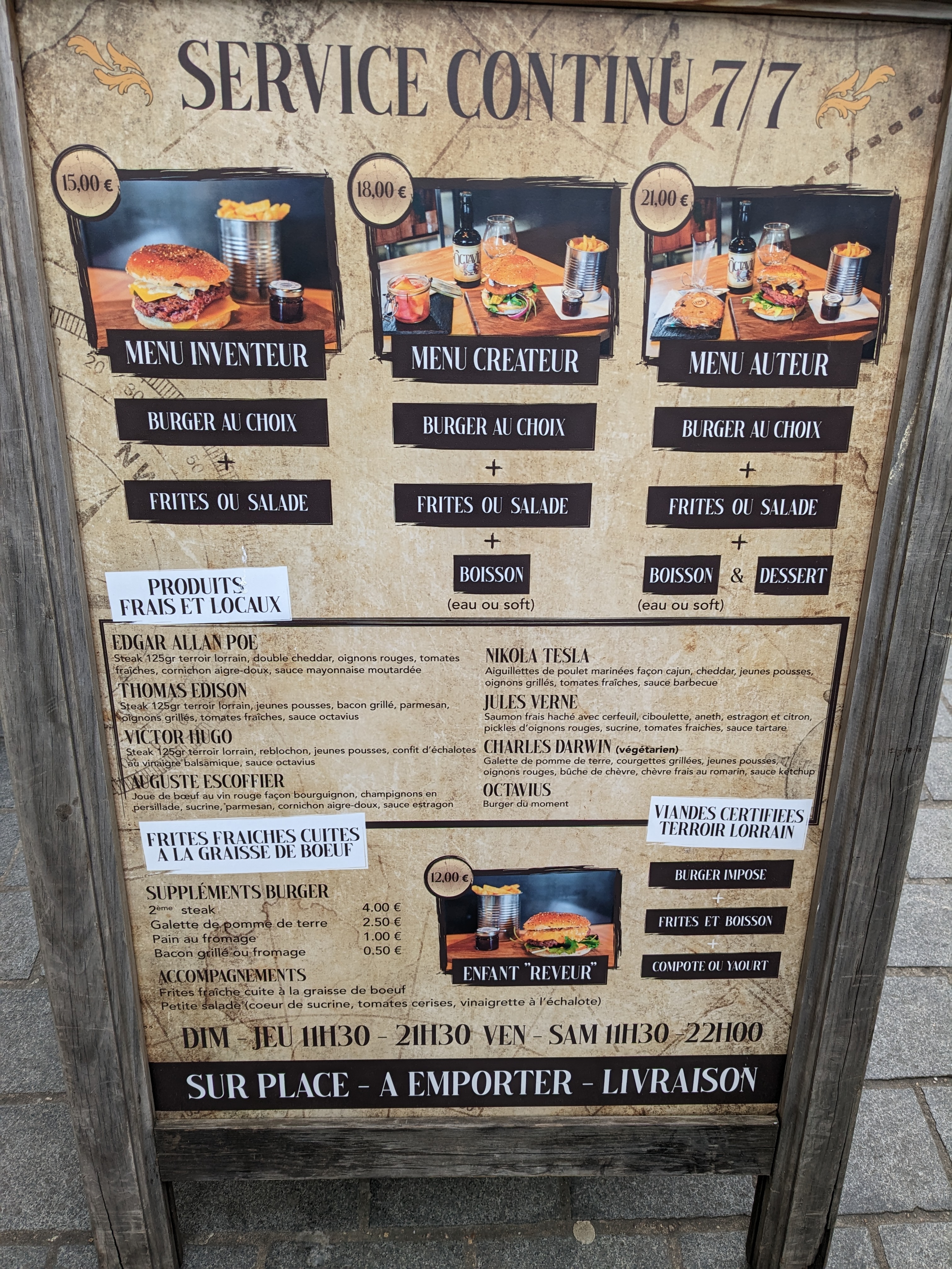 Je viens d’arriver à Nancy, j’ai connu ce restaurant grâce à Internet et je me dois de dire que c’est l’un des meilleurs burgers que j’ai mangé de ma vie ! Les frites excellentes, la sauce excellente, le burger excellent. Vous pourriez penser que ça s’arrête là, mais non, même les desserts ont été succulents ! Je n’ai rien à rajouter, je ne comprends pas pourquoi les gens ne se marchent pas dessus pour rentrer dans ce restaurant. La grande classe !