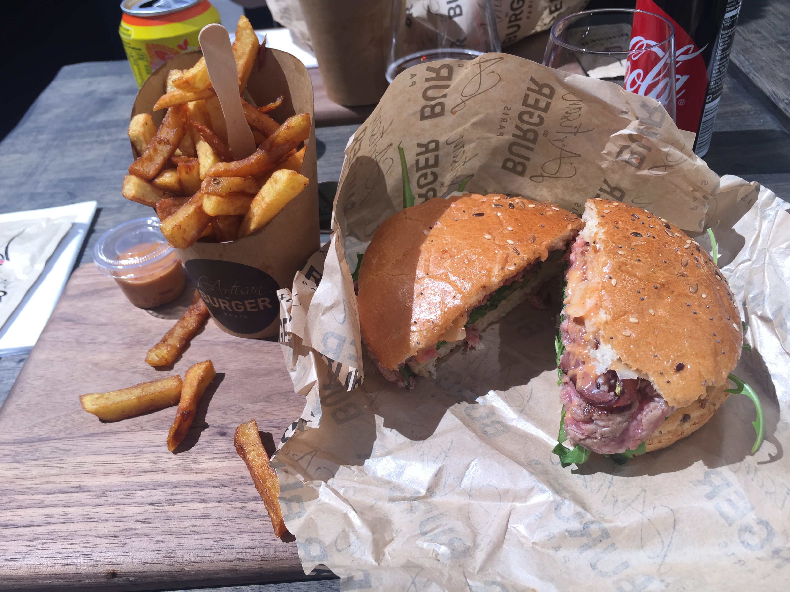 Pas de service, faut aller commander et trouver sa place. De grandes tables qu'on partage avec d'autres, c'est du coup assez convivial, et ça permet de faire des connaissances. Par contre, de si grandes chaises, collées les unes aux autres, on s'y sent un peu à l'étroit. Hamburgers très bons, très fins, et on ne ressort pas avec une sensation de lourdeur. Les gros appétits, il vous en faudra deux. Les frites sont justes hallucinantes, parfaites. Edit : la qualité a sensiblement baissé à ma dernière visite. Pour le prix plutôt élevé, ça ne vaut plus tellement le coup.