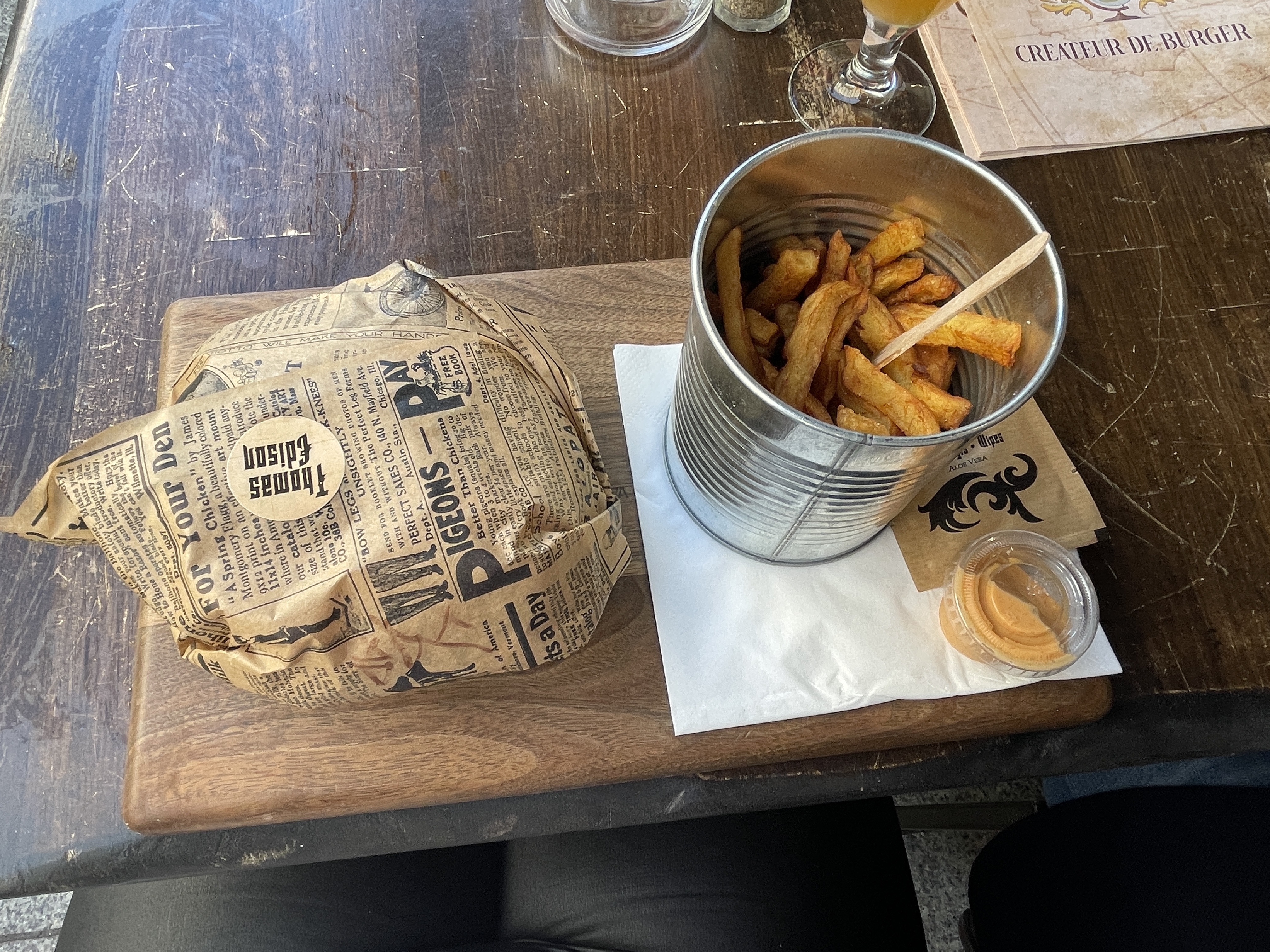 Nous avons dîné dans ce restaurant de burgers. J’ai pris le menu créateur avec hamburger Thomas Edison frites fraîches et un coca. Le burger était excellent et coupé en deux, donc facile à manger. Le service était rapide. Je reviendrais avec plaisir !