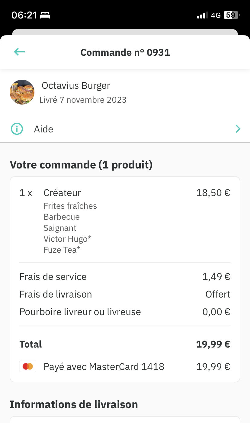 Première commande excellente ! Par contre se dégrade depuis mes 3 dernières commandes. Commande de deux burger bien cuit, me retrouve avec saignant (2 fois). Précise d'un burger sans tomates, demande spécifique de faire une annotation sur celui sans tomate, plus hygiénique et pratique (surtout en ce moment) pour une commande entre collègues, résultat impossible de faire la différence car pas d'annotation ... Mes commandes seront moins fréquentes.