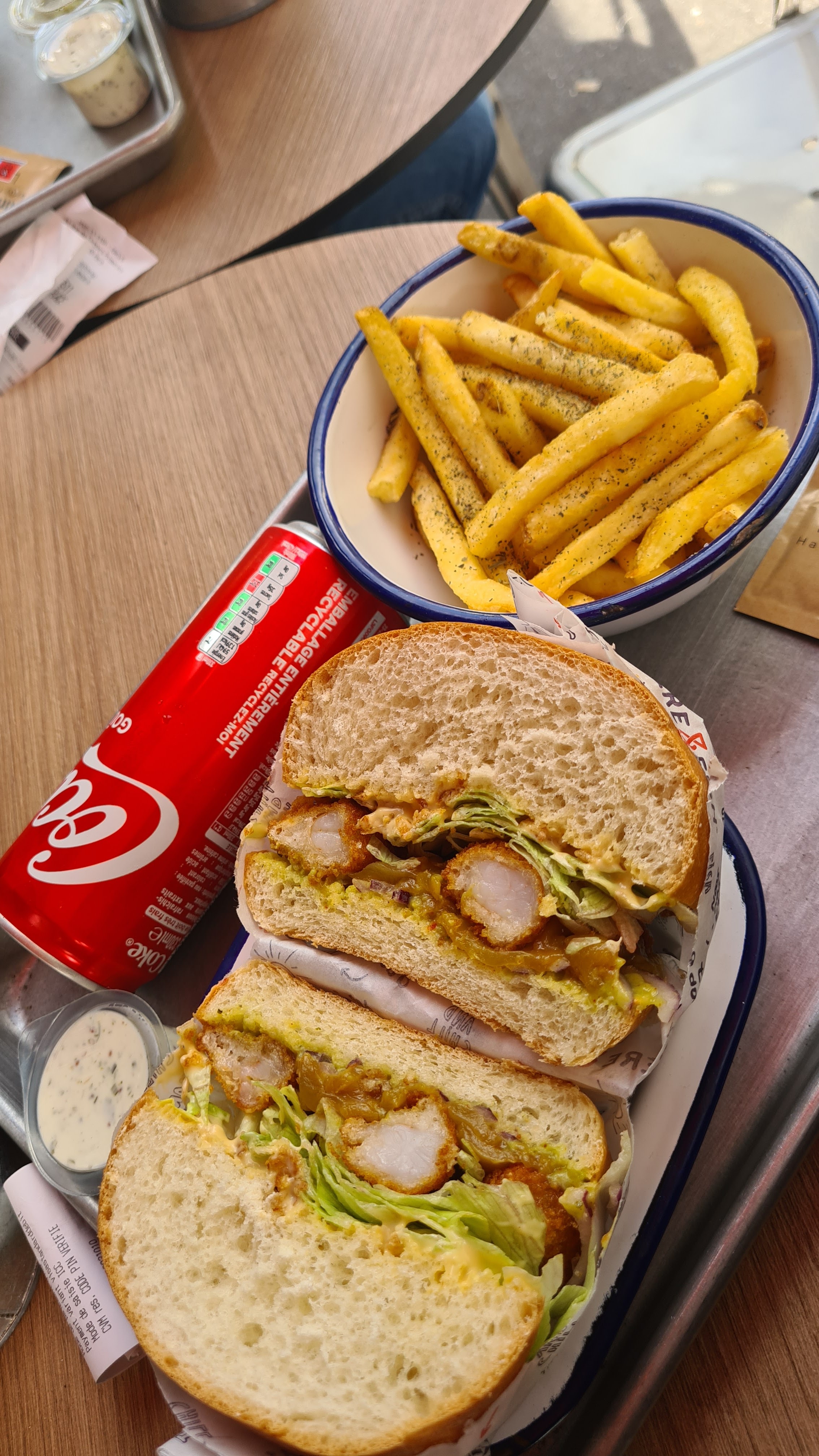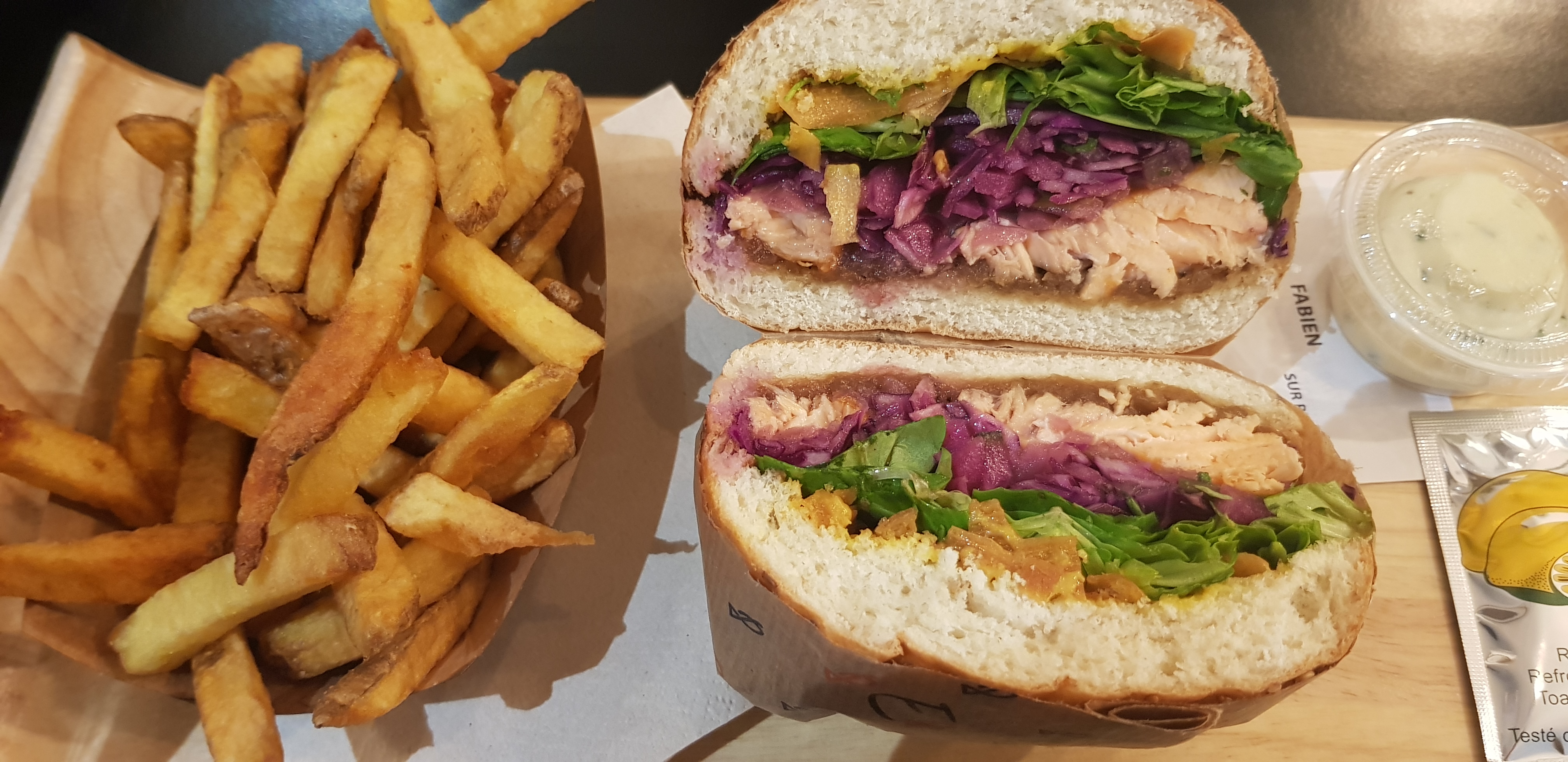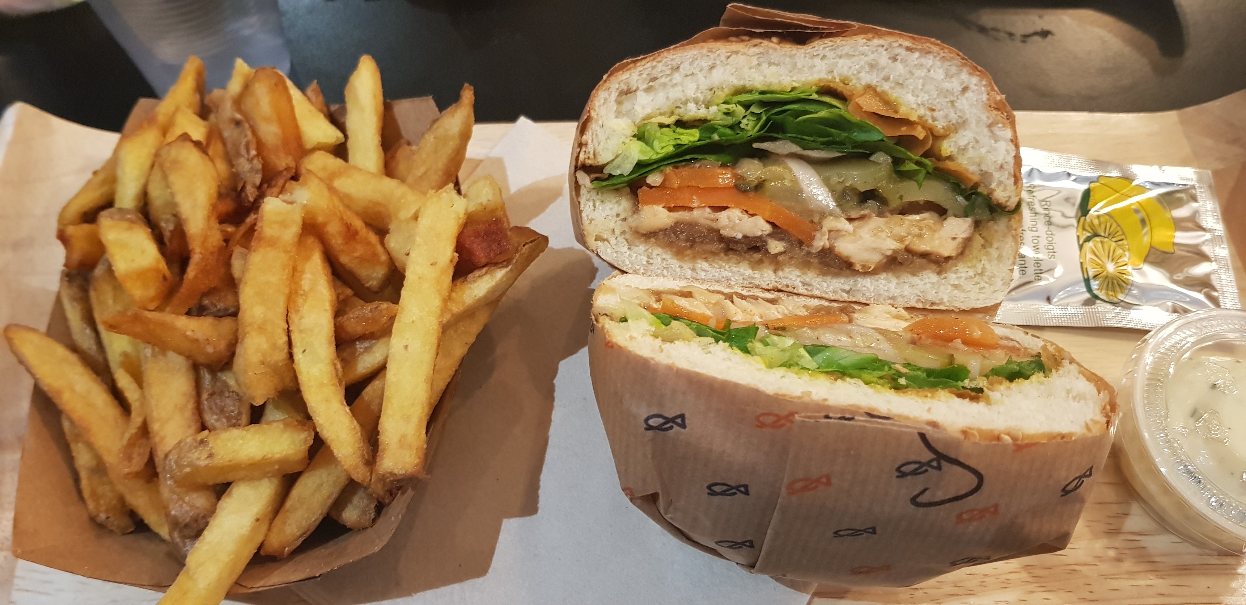 Sympa mais j'ai trouvé le morceau de poisson un peu trop modeste (3-4 crocs et c'est fini). A côté de ça j'ai surtout du coup eu l'impression de manger des frites. Sinon c'était bon, et la sauce qui accompagne est bonne aussi.