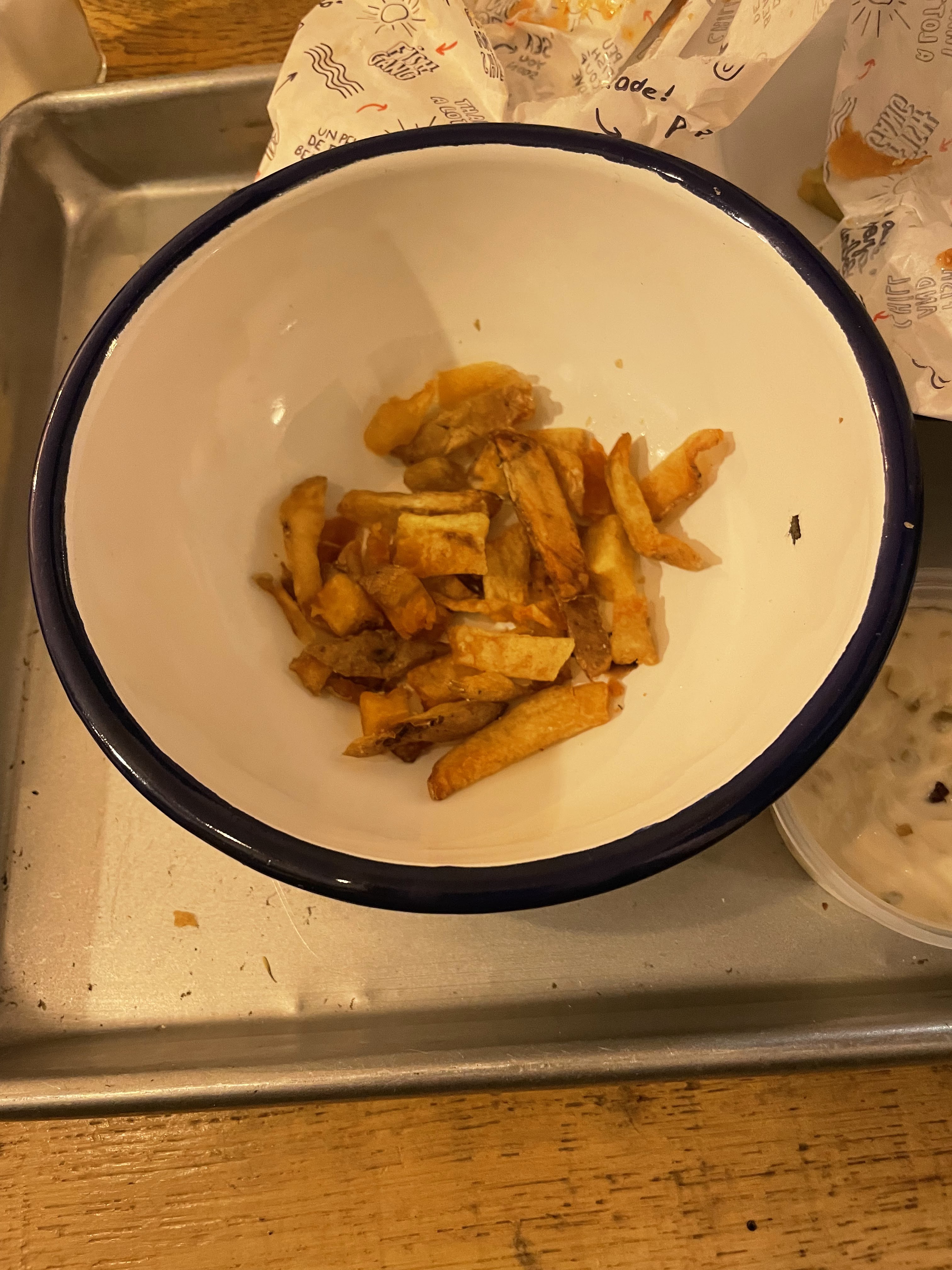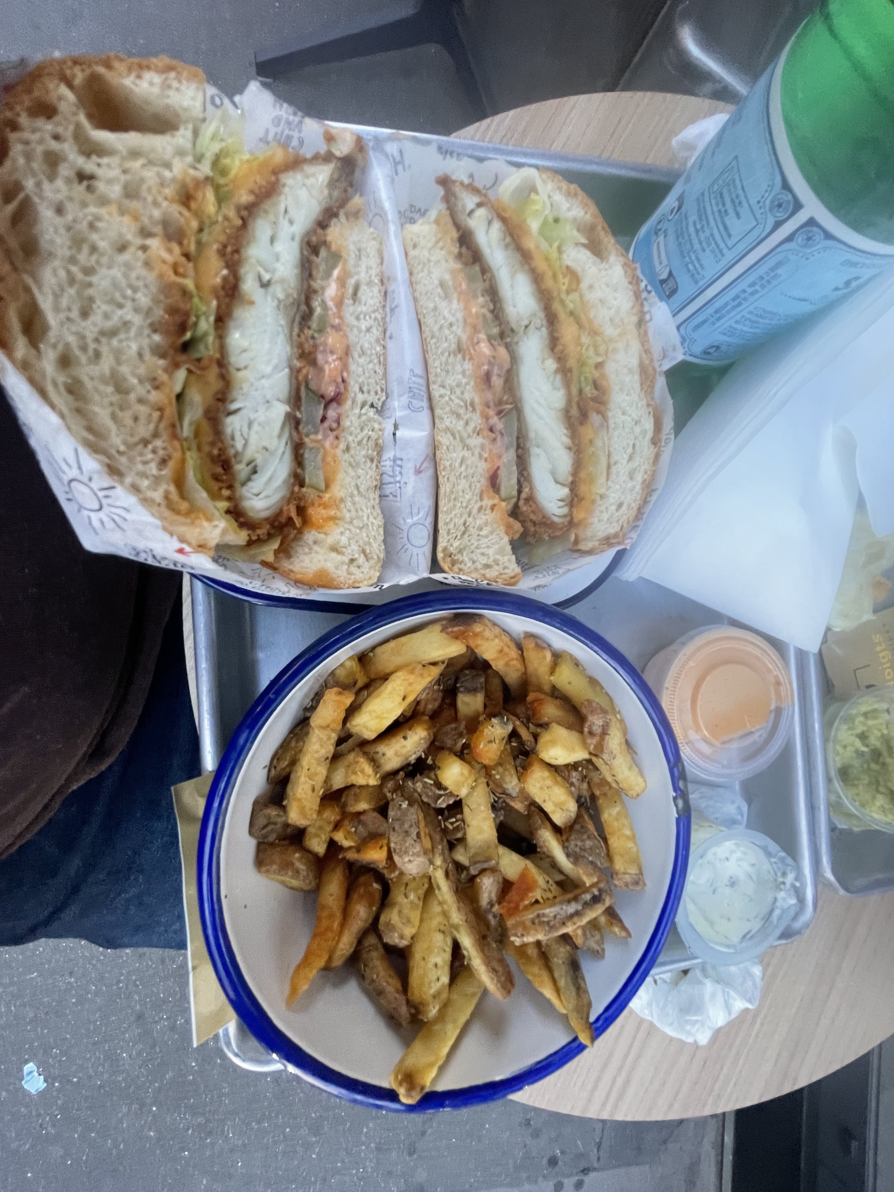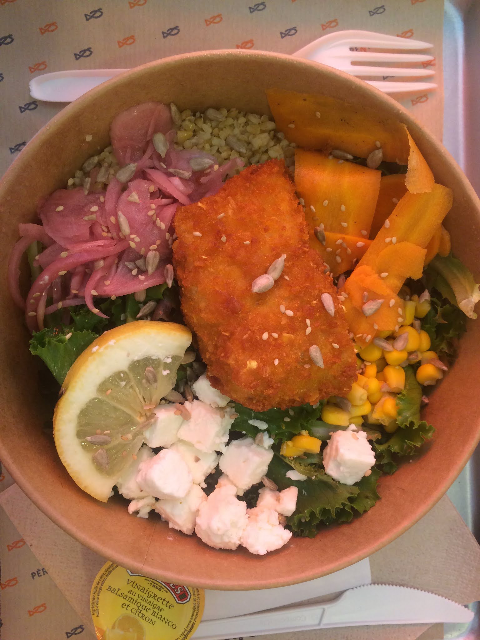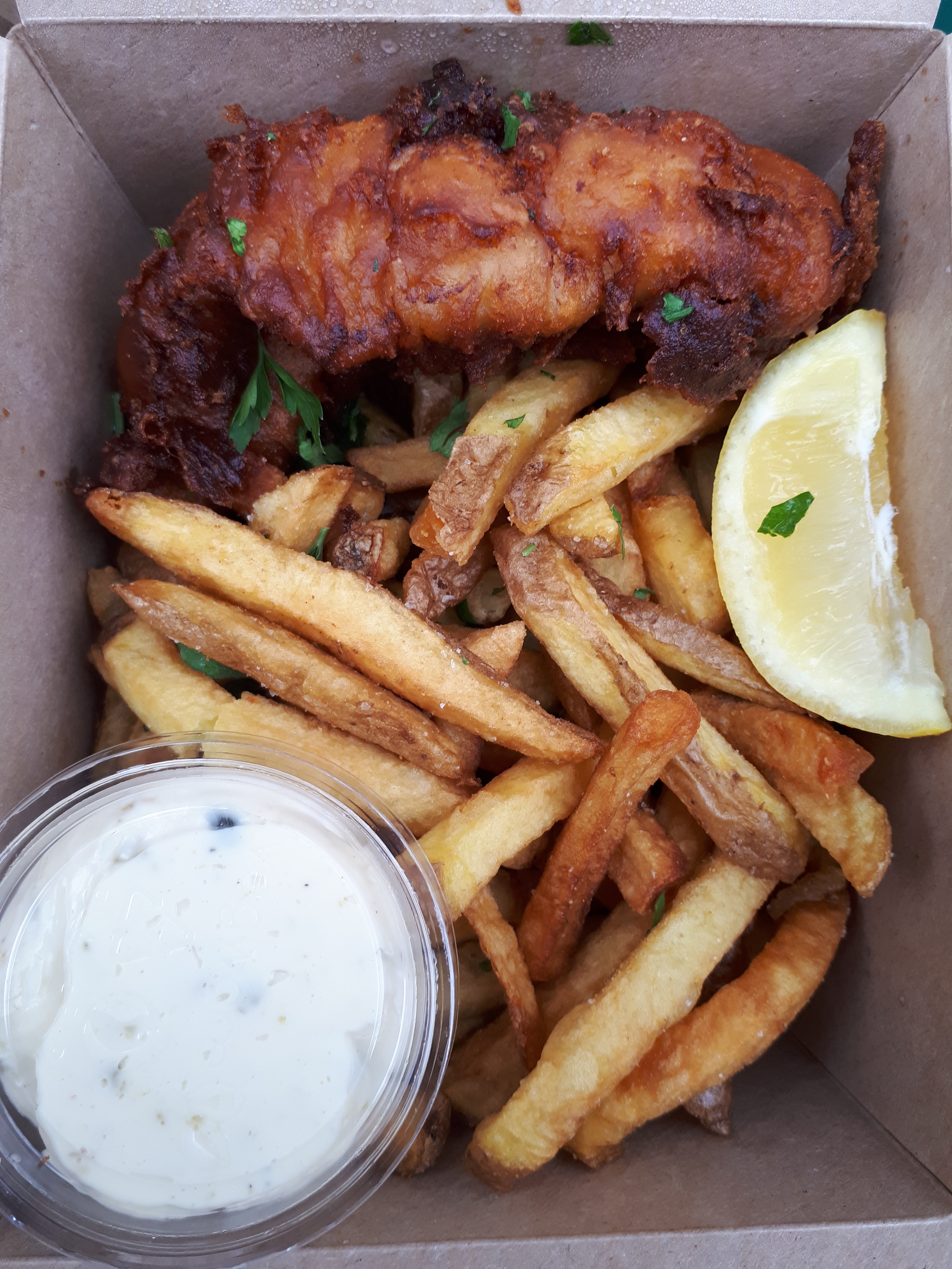 Sympa mais j'ai trouvé le morceau de poisson un peu trop modeste (3-4 crocs et c'est fini). A côté de ça j'ai surtout du coup eu l'impression de manger des frites. Sinon c'était bon, et la sauce qui accompagne est bonne aussi.