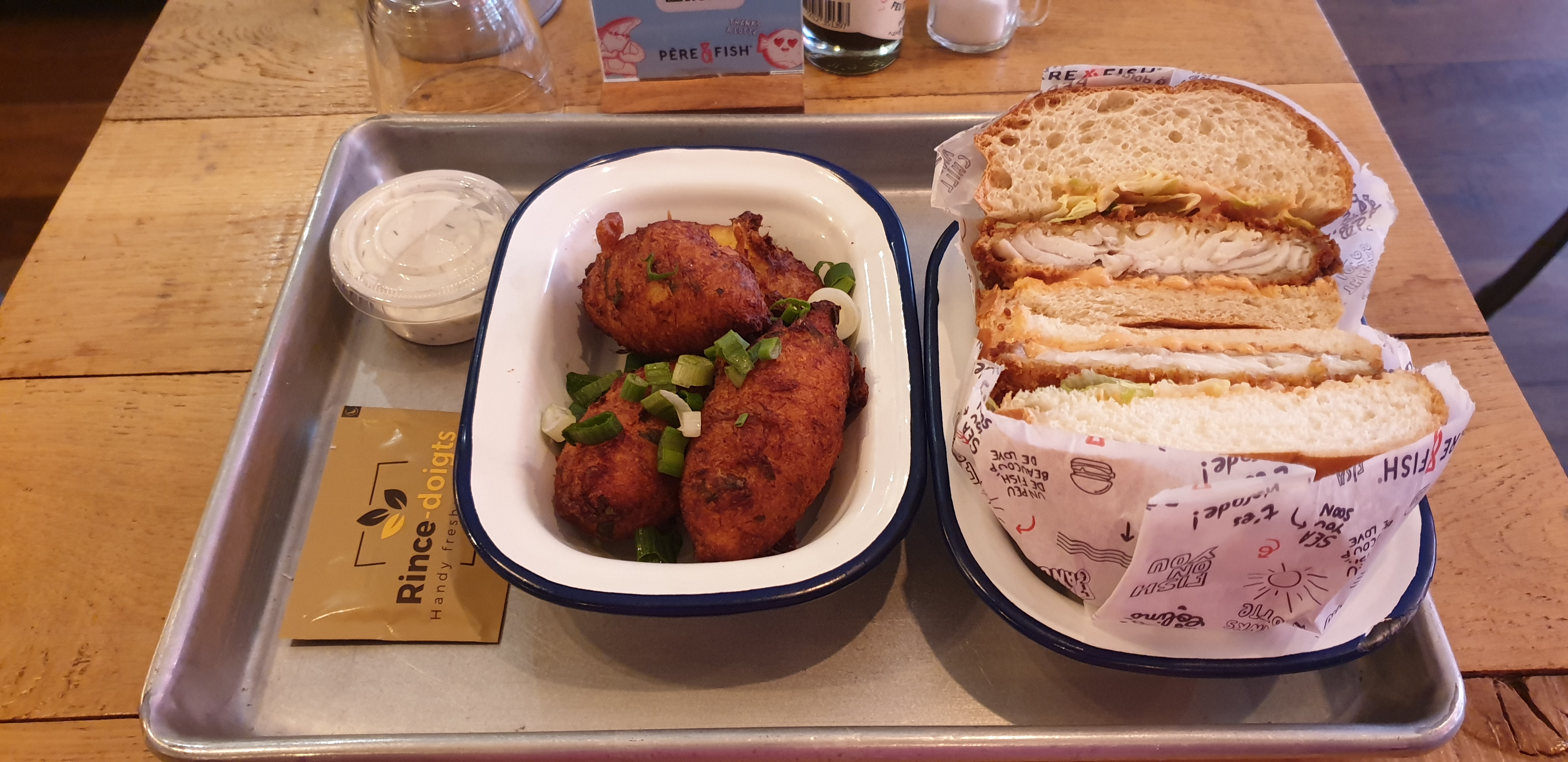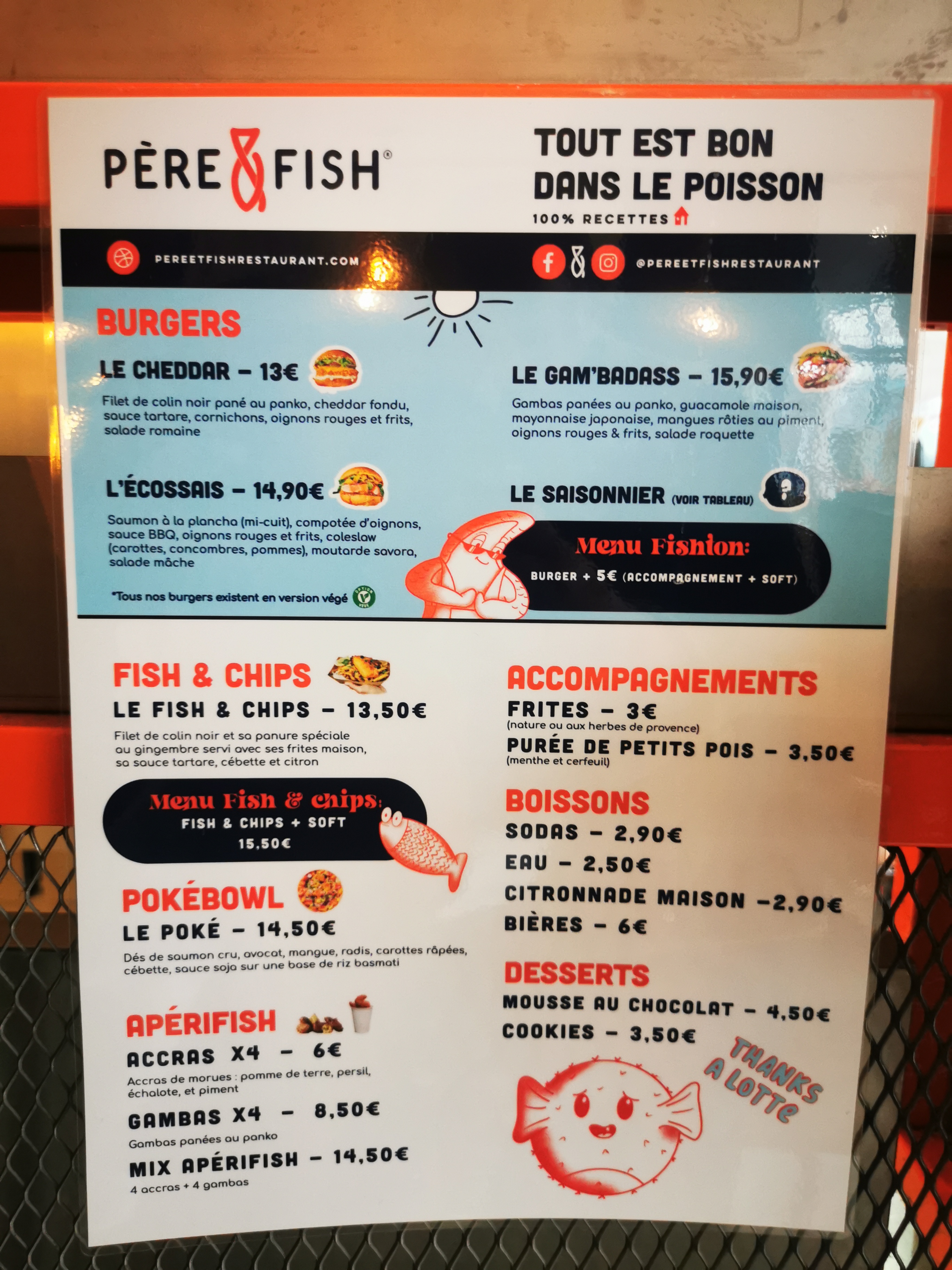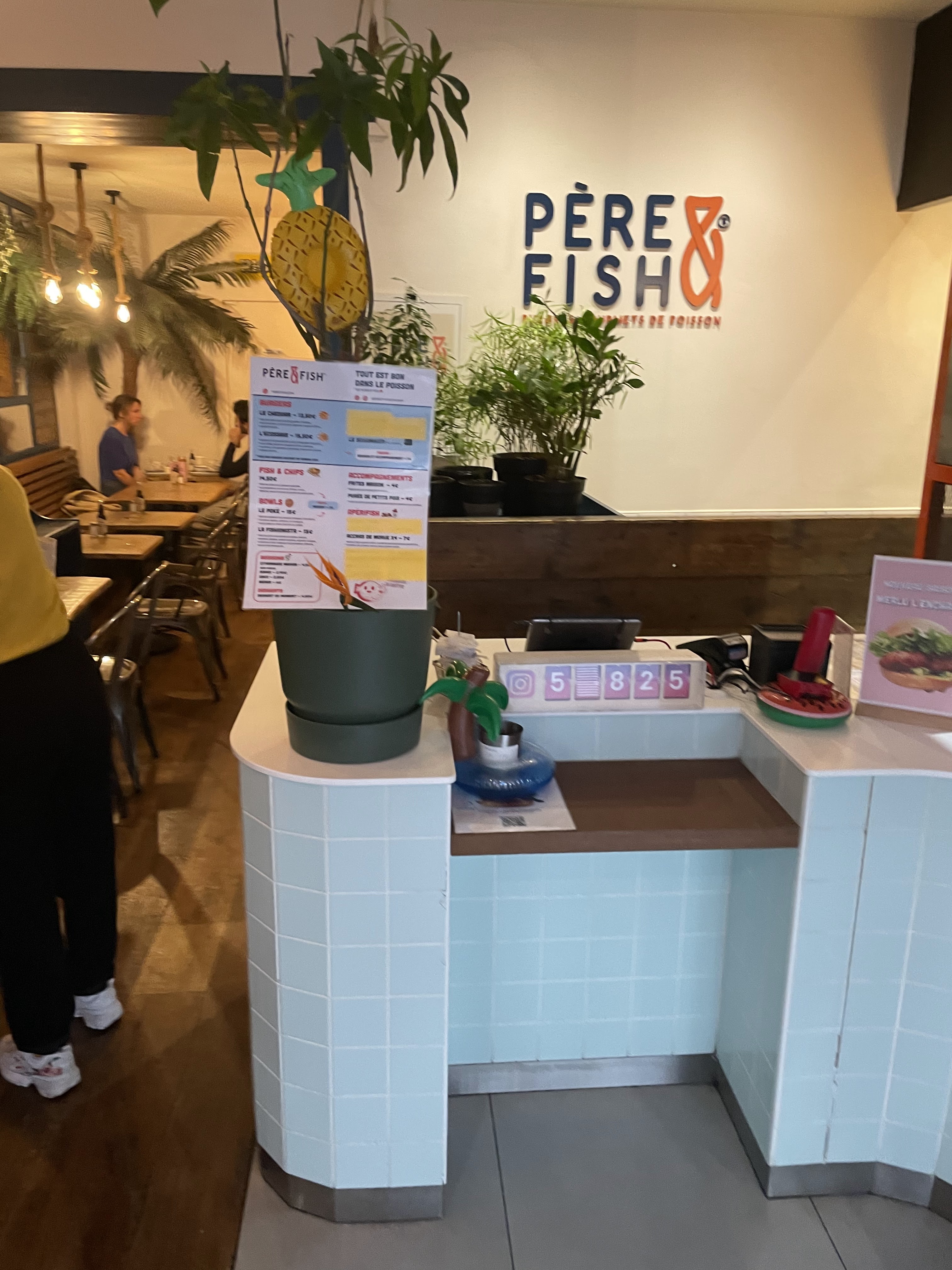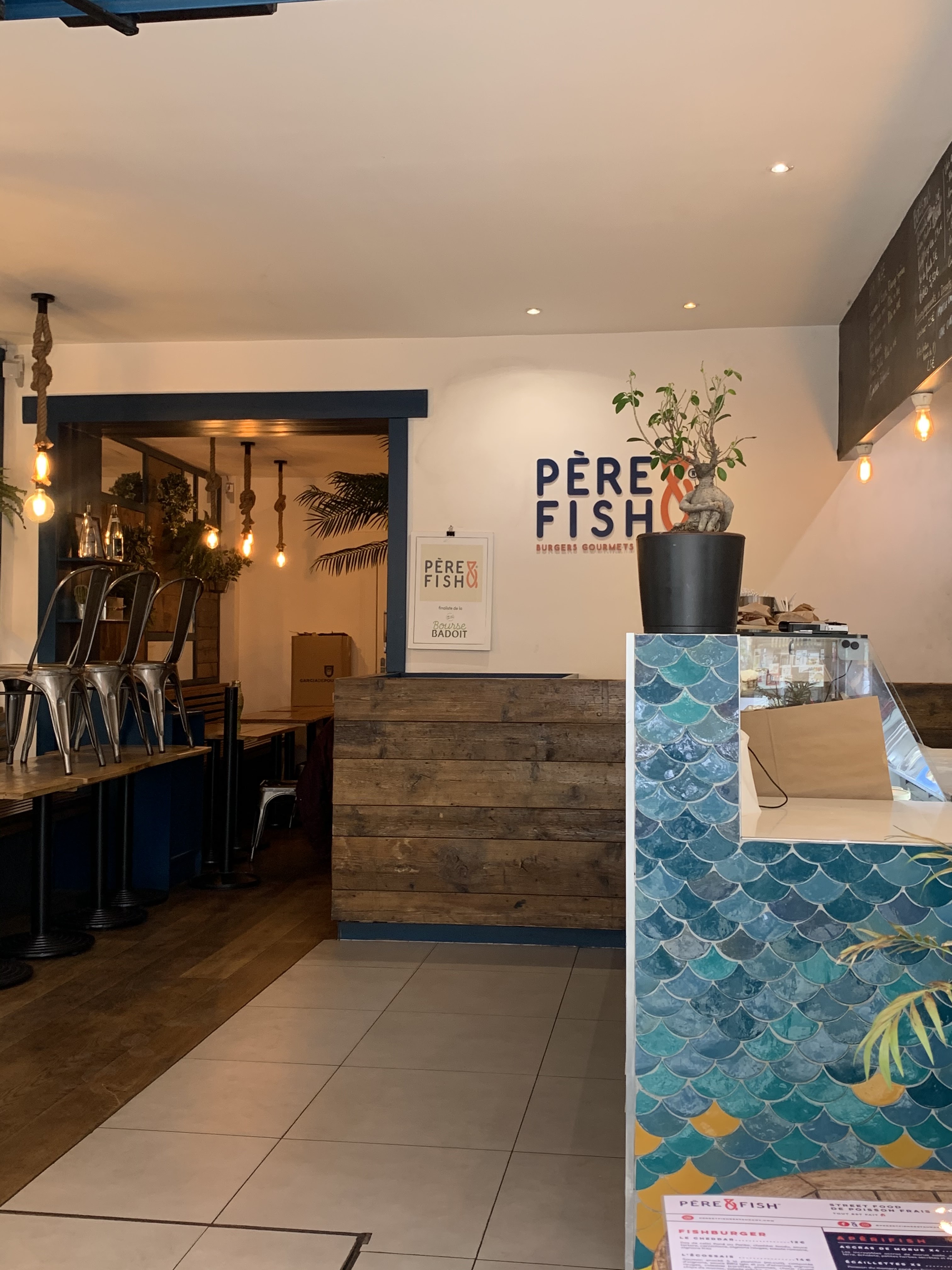 Nous suivons Père & Fish depuis longtemps et nous étions content d’aller y goûter pour la 1ere fois mais honnêtement nous avons été déçu … Les Burger poisson sont corrects mais la quantité est vraiment limitée (en 3 bouchées il n’y a plus de poisson), les accras sont trop épicées, les frites sont sèches les sauces tartares beaucoup trop acides … Nous ne reviendrons pas le rapport qualité prix est vraiment décevant