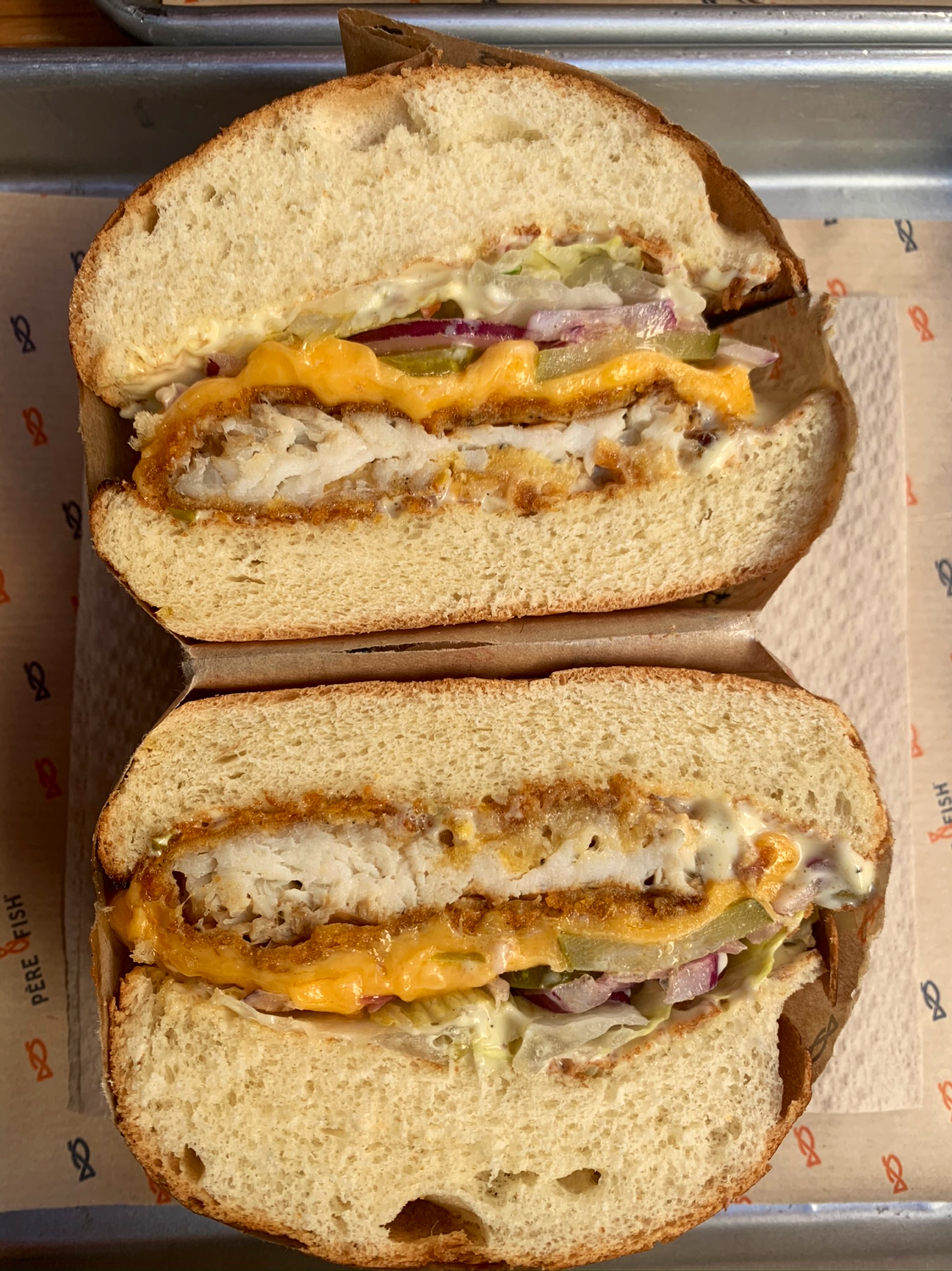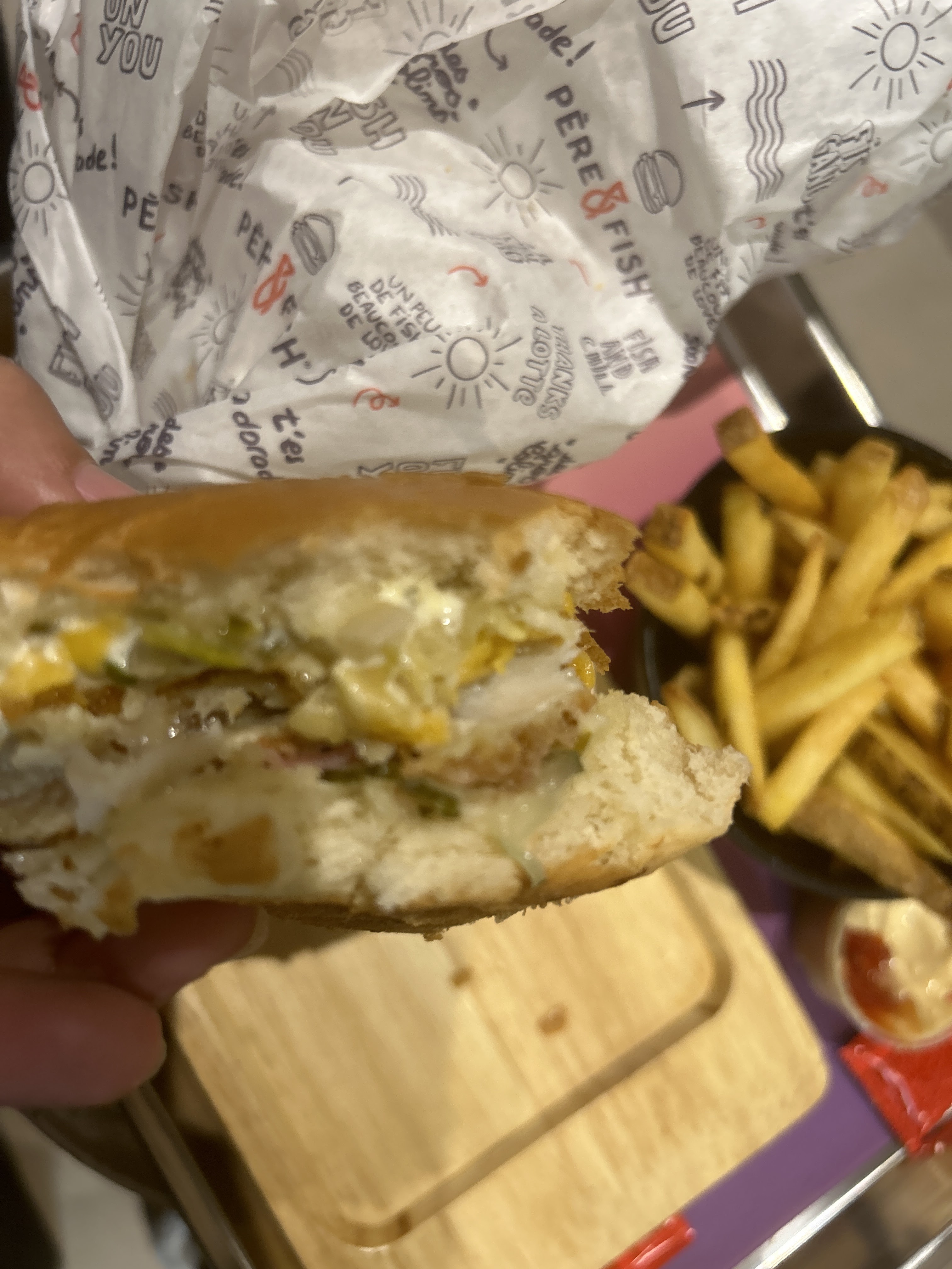On a goutté le Cheddar et L’Écossais franchement les burgers aux poissons ont été top 👍 avec des portions généreuse. Les frites un peu moins fan mais la sauce aïoli et la mayo à la betterave ont un peu rattrapées le tout Ma préférence est pour le cheddar avec un extra cheddar. À tomber !!! 🤩 Première expérience chez Père & Fish et franchement c’était booooon !! La commande se fait avec la borne à l’extérieur pour ma part c’était simple et rapide. Packaging très bonne qualité et le décor simple Je recommande et goûtez-le cheddar vraiment ❤️