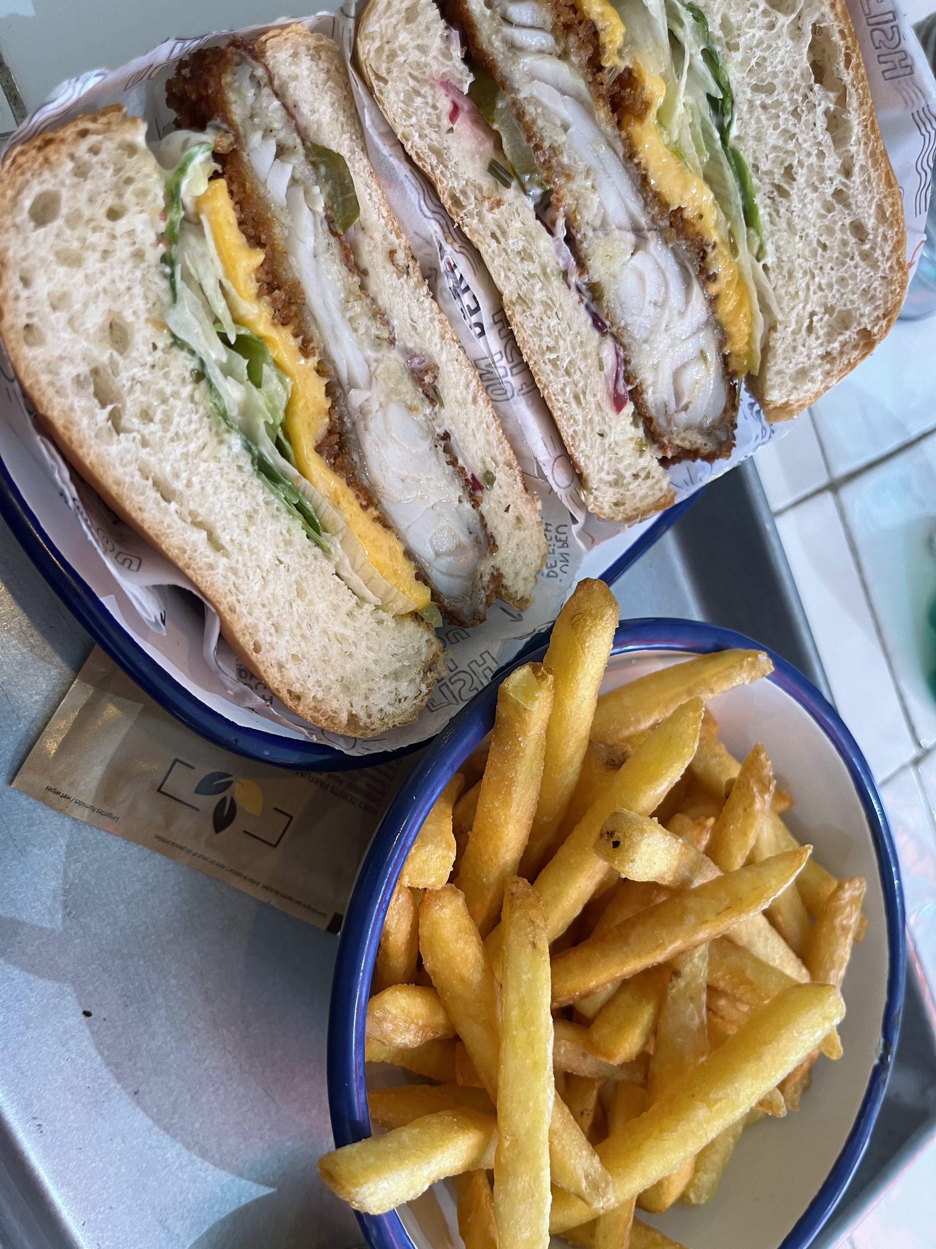 Nous avons pris le burger classic et le burger du moment. Ils étaient délicieux! J’avais envie d’un bon fish burger au poisson pané, et je n’ai pas été déçu!! Il y en a pour tous les gouts: poisson pané, poisson à la plancha, poisson vapeur... Les frites étaient très bonnes également, moins fan du coleslow qui était trop salé à mon gout. Le personnel est tres accueillant et souriant! Je recommande vivement!!!!