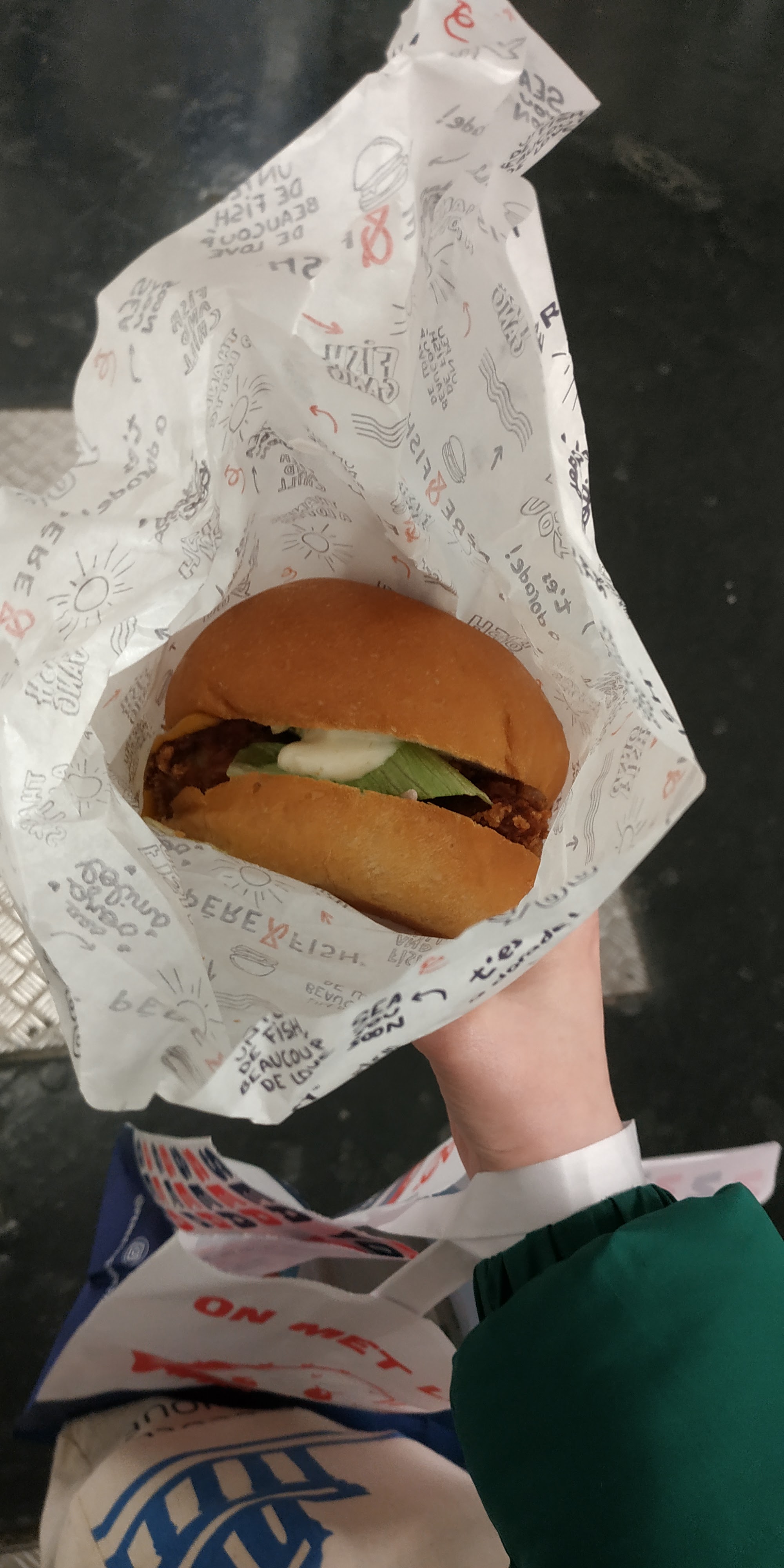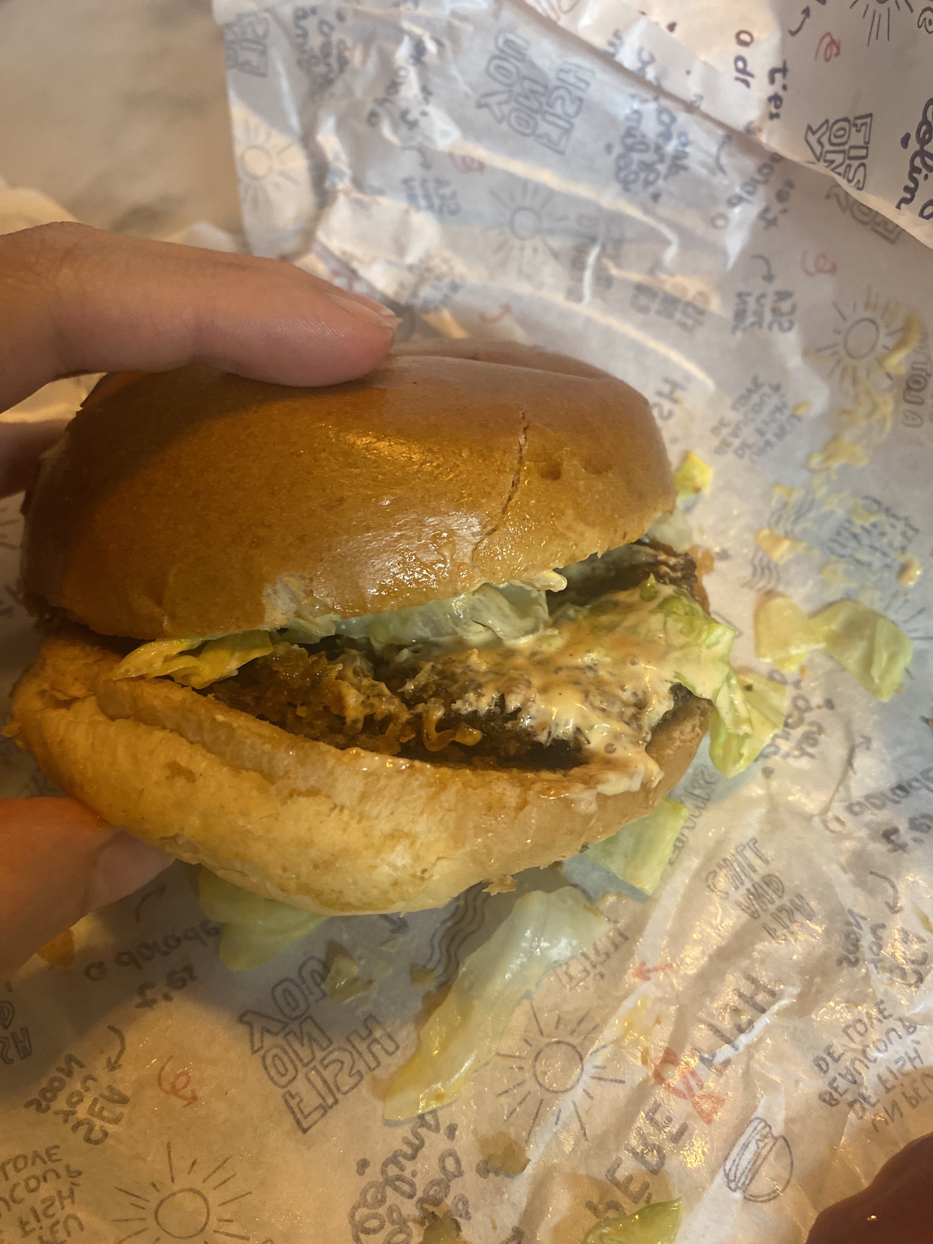 Franchement même après près trois heures c'est toujours bon même délicieux je me suis régalé ,rien à voir avec un filet au fish .Ce burger est vrai burger au poisson le filet de Collin était très bon ,le pain ,la salade ,la sauce , vraiment tout les produits étaient frais et bons! Le meilleur burger au poisson que j'ai pu manger !
